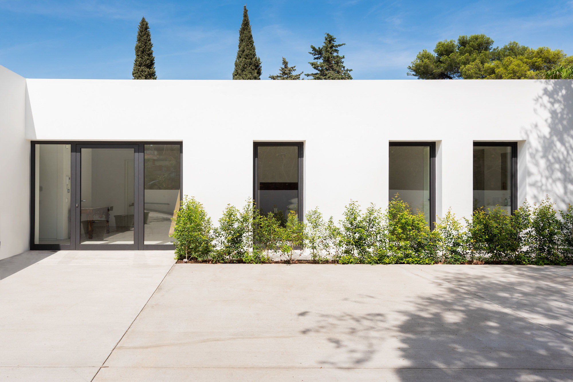 The whole house is on one level. The centre is a wonderful open-plan living room/kitchen/dining room with floor to ceiling windows on both sides, affording space and flow. These windows slide open towards the pool and garden and a chillout seating courtyard on the other side. They also allow light to flood into the house.