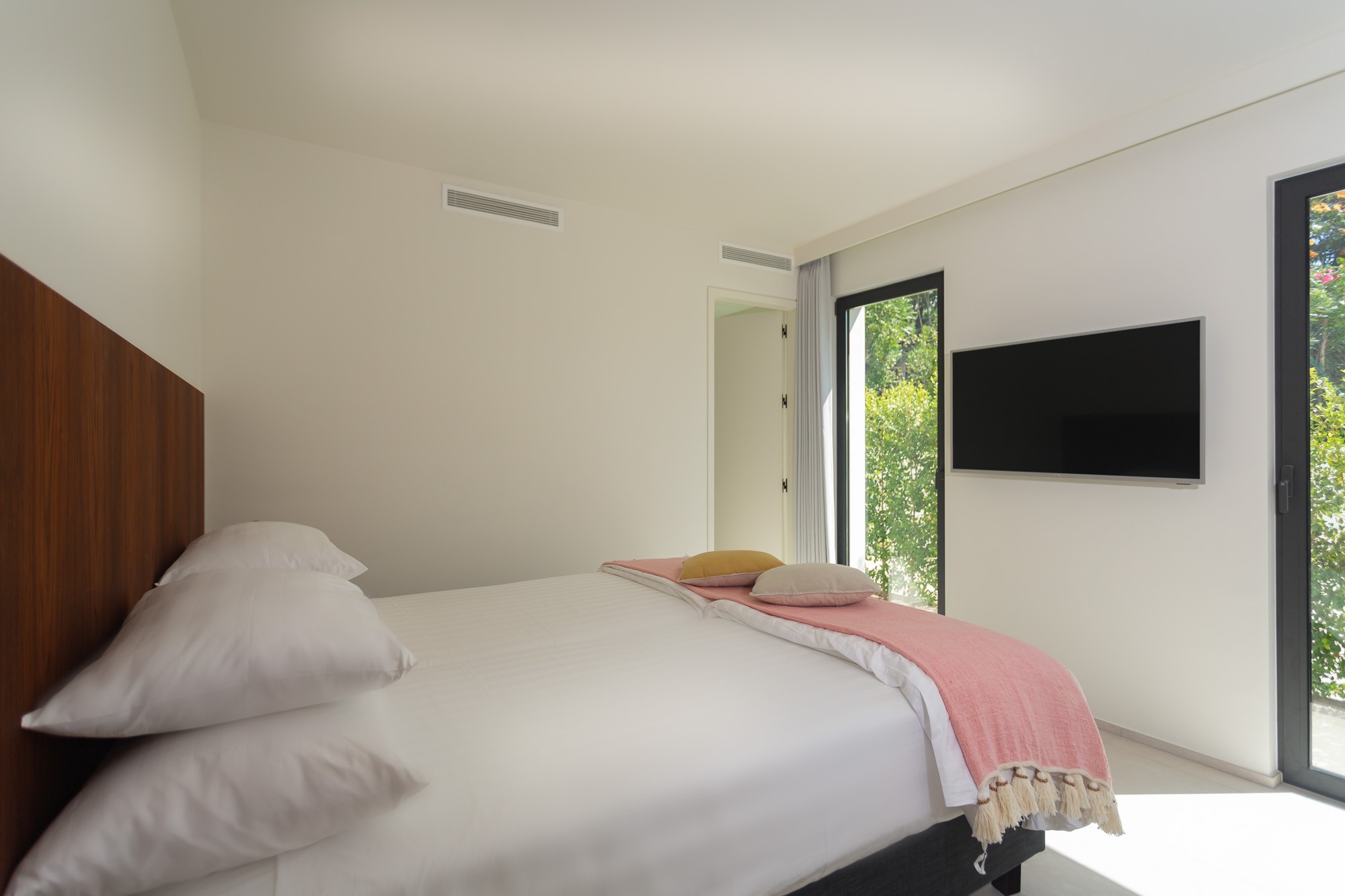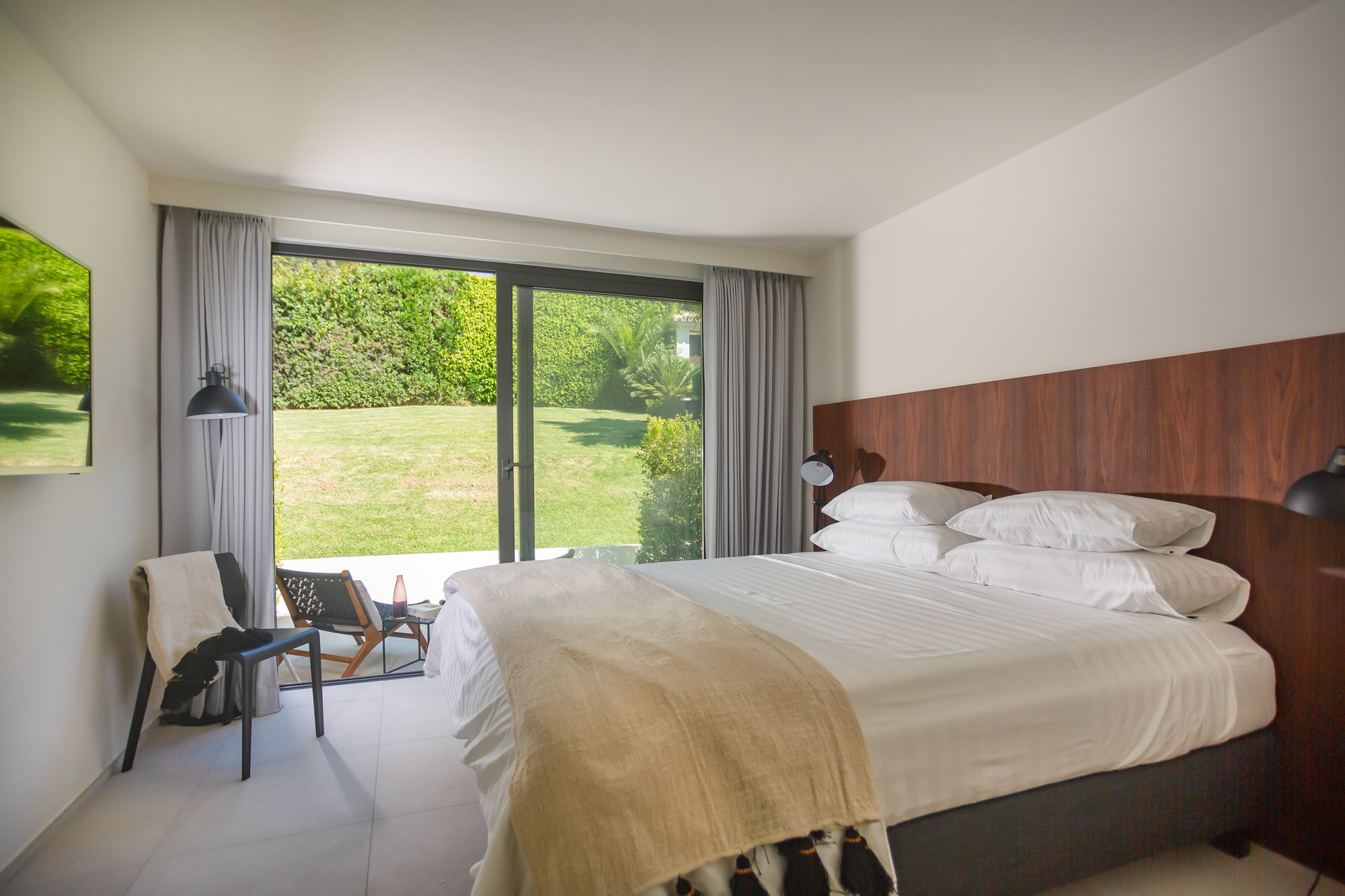 Bedroom 2: Ground floor with large floor to ceiling window to the garden and pool. With a 180x210cm super king size bed. All bedrooms have A/C, underfloor heating, generous wardrobes, blackout curtains, TVs and homely design touches like linen throws, pillows and rugs. The en-suite bathroom has a double sink and shower.