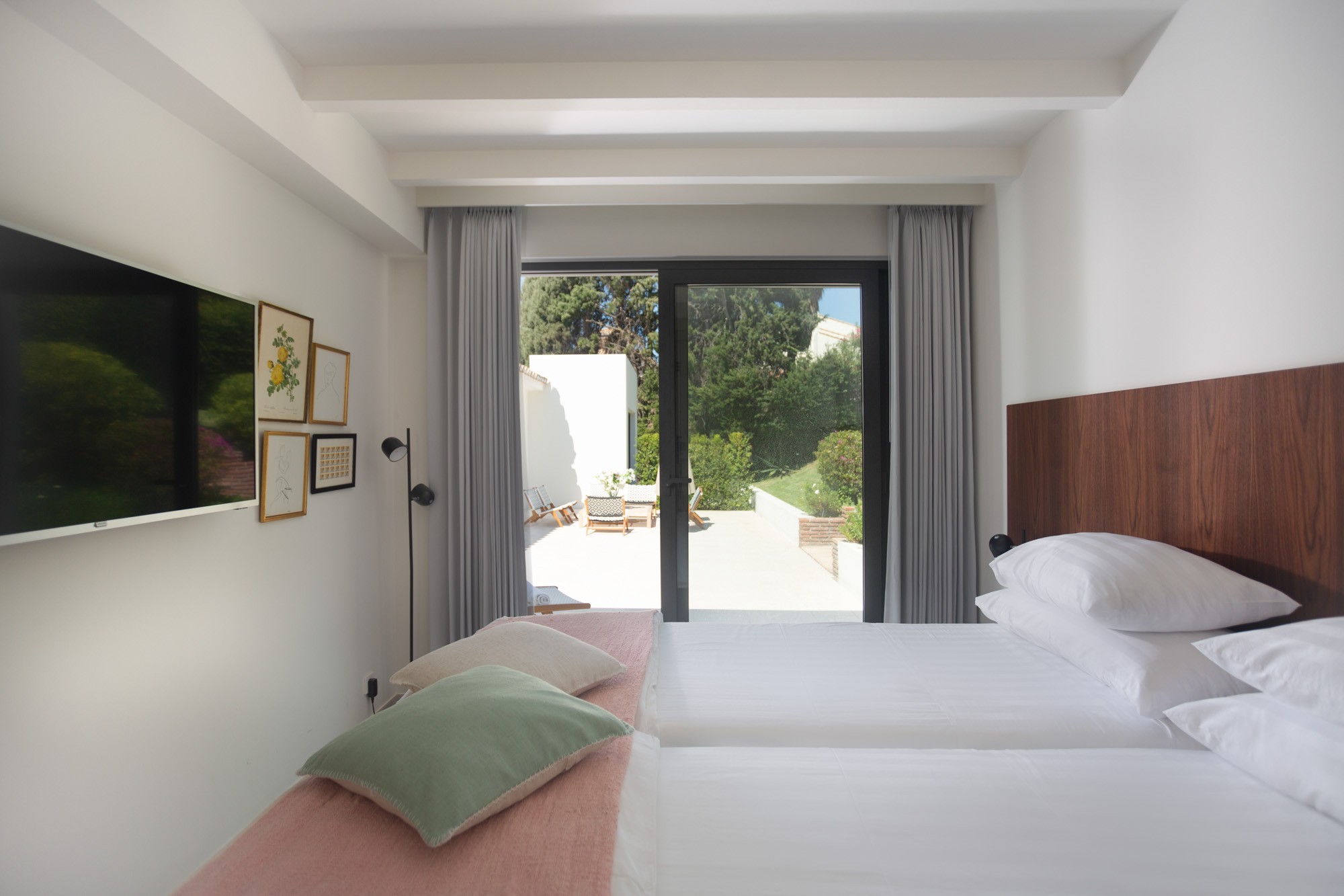 The bedrooms are split between two areas: one at each side of the house. This zoning is ideal for families. Each bedroom has an en-suite bathroom and some have their own terraces. The bedrooms are softened with the use of natural wood and linen soft furnishings in calming colours. Great for friends to share, 4 of the bedrooms can be split into single beds.
