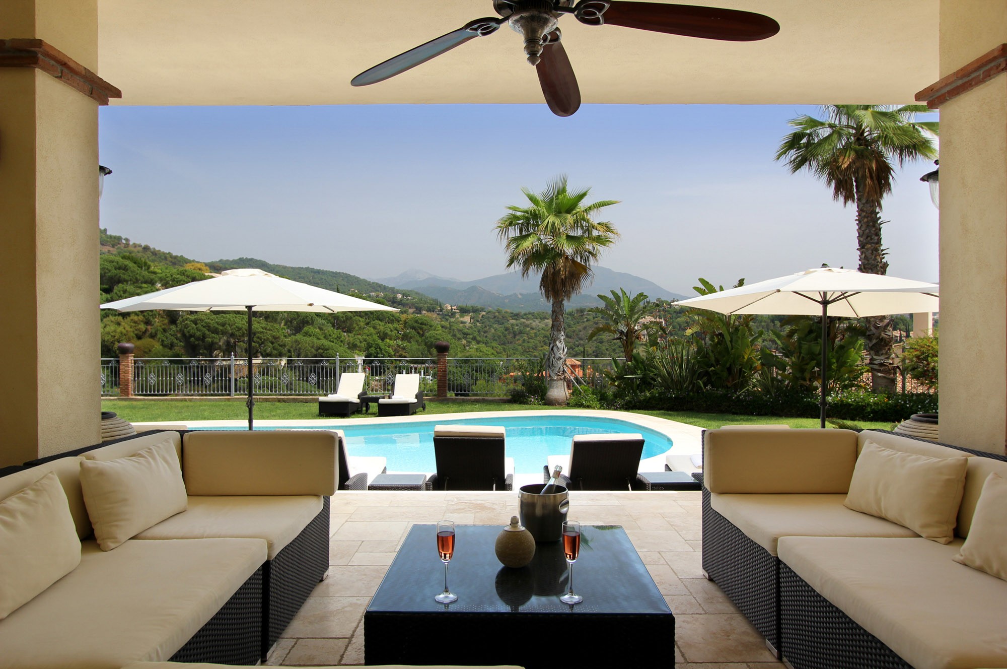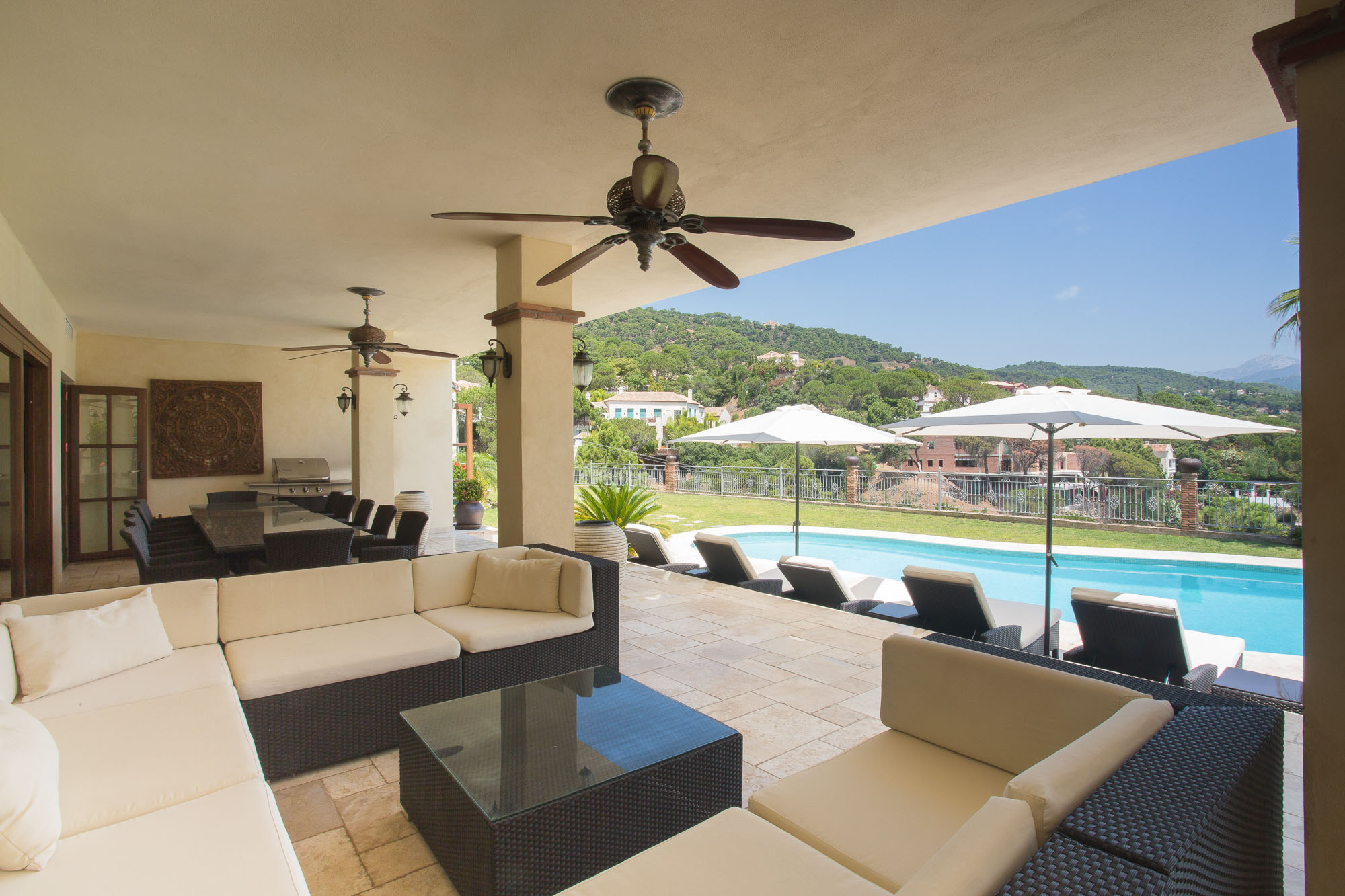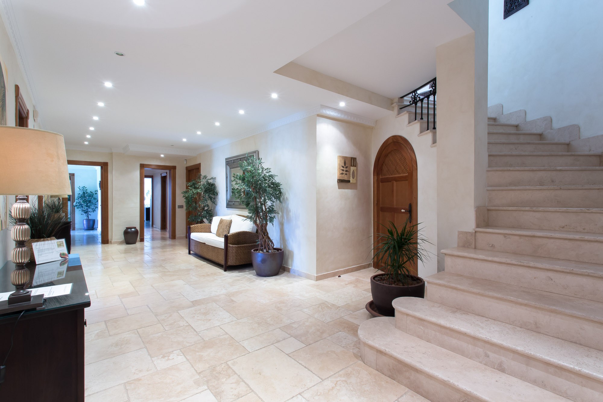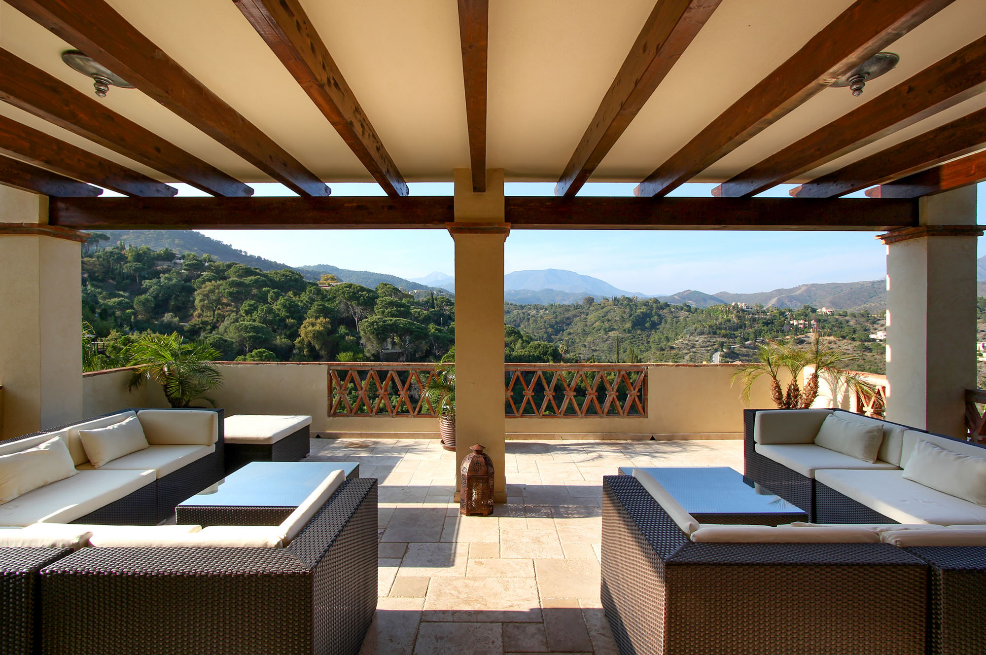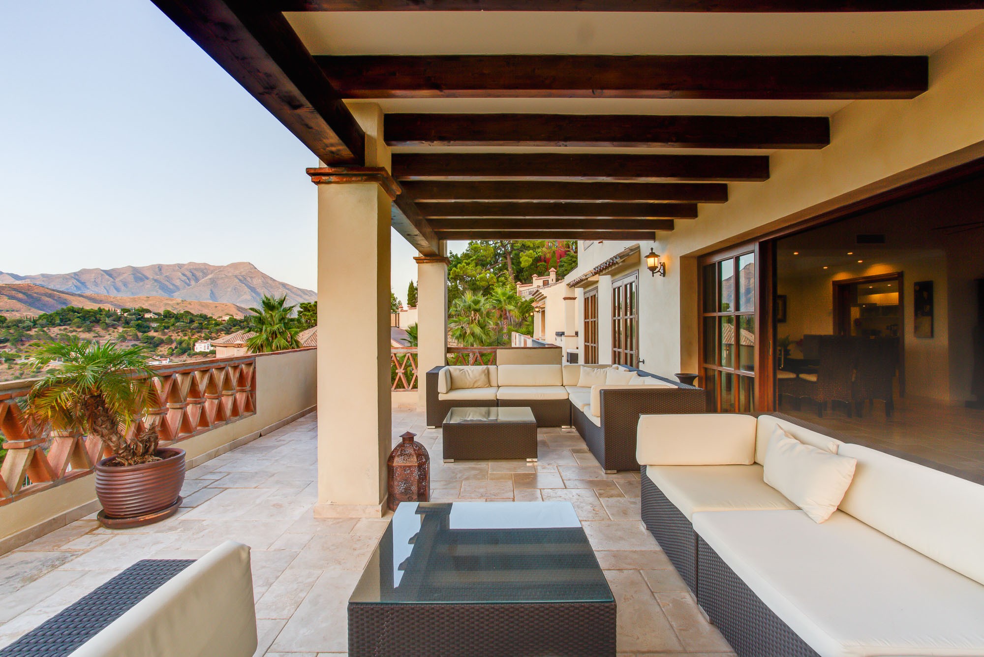 The standard is set by this ultra-luxury Spanish villa as soon as you walk through the huge 6m high entrance archway and into the house. The archway reveals a bright and airy living room which shows off a vaulted ceiling and far-reaching views across the valley.