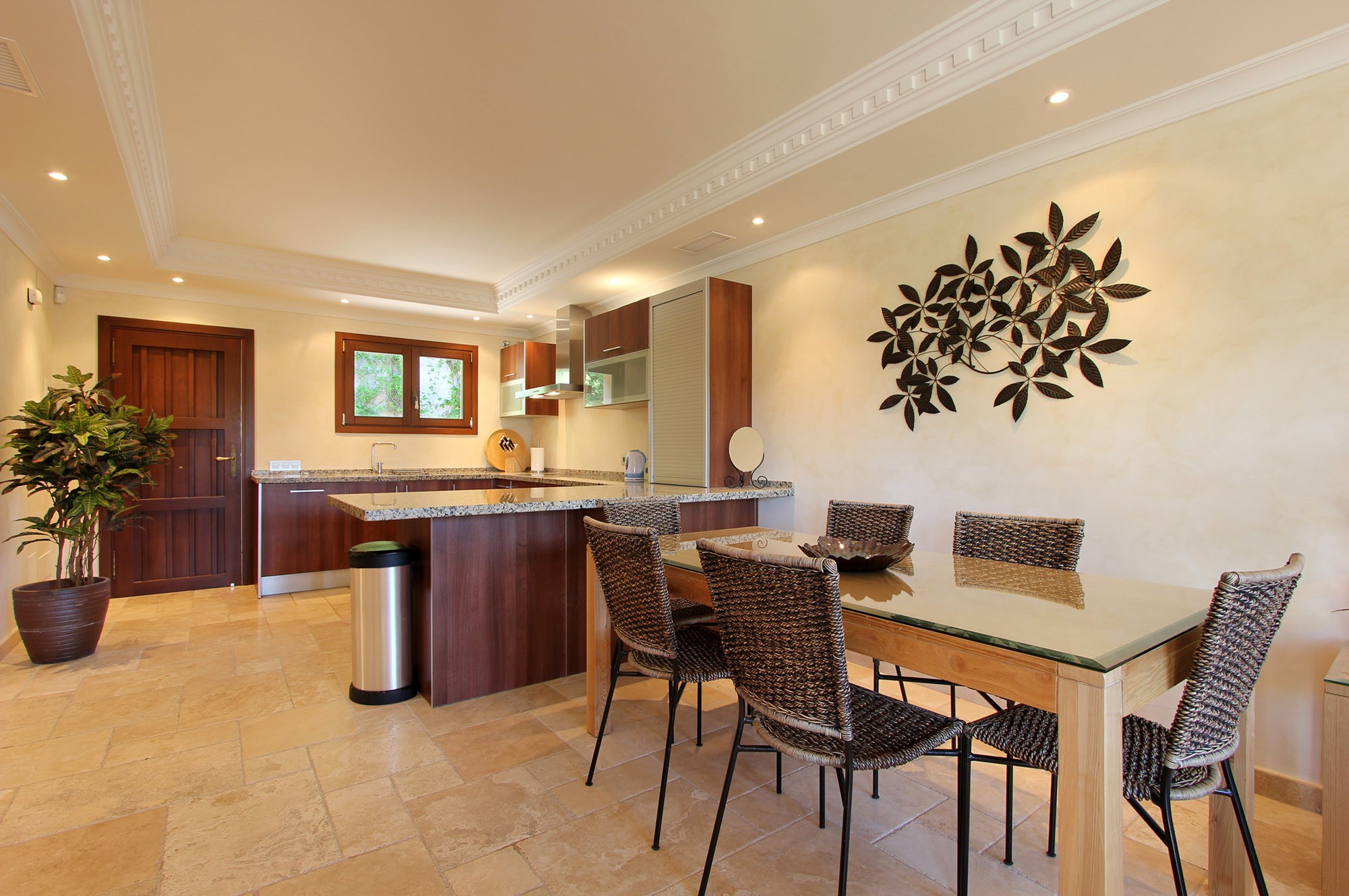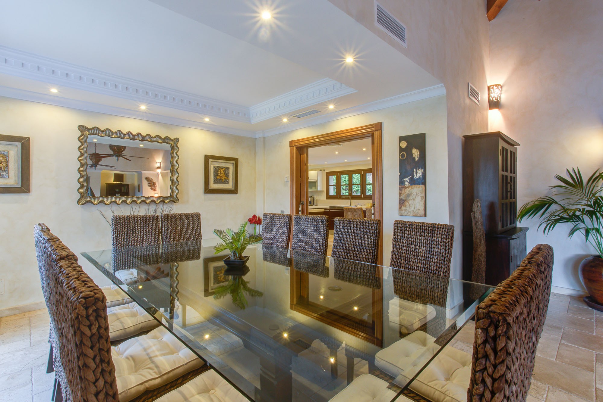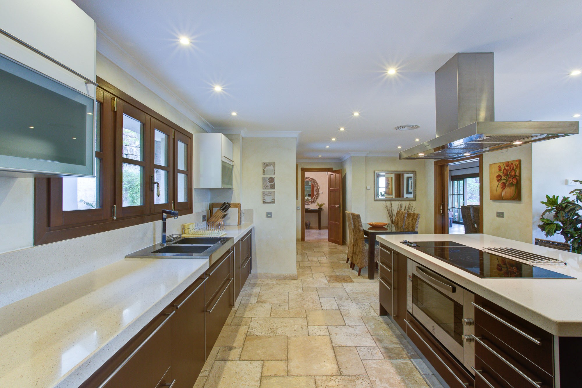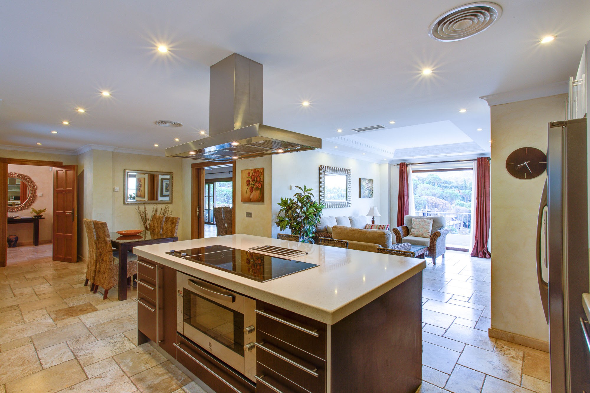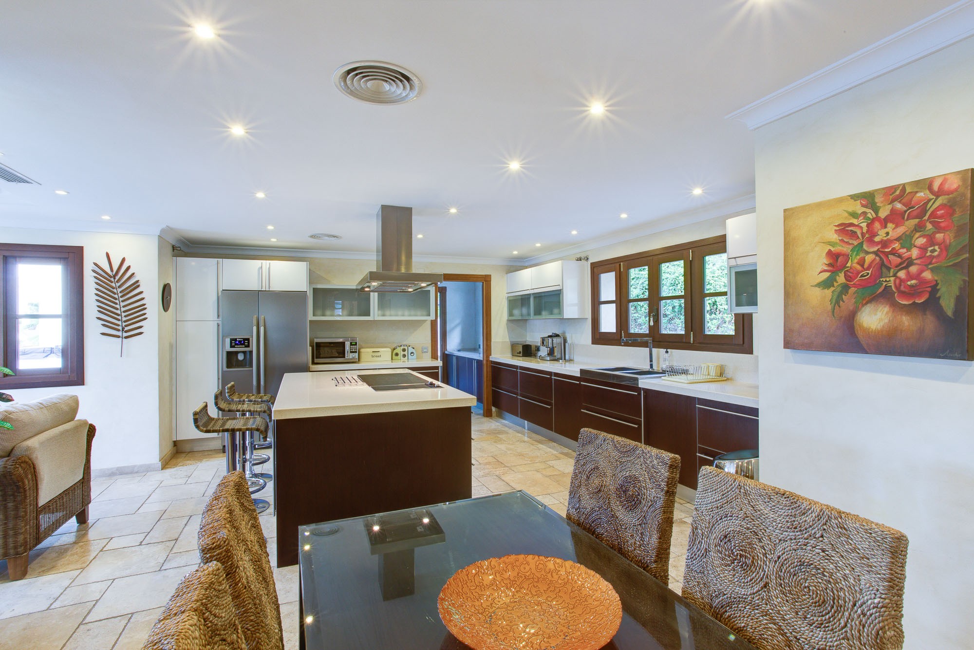 The kitchen has a central island laid in smooth granite, and small seating area which is handy for breakfast, plus as a small lounge area. There is also a formal dining area seating 12 indoors, plus extensive terraces for dining outdoors in the warm summer breeze.