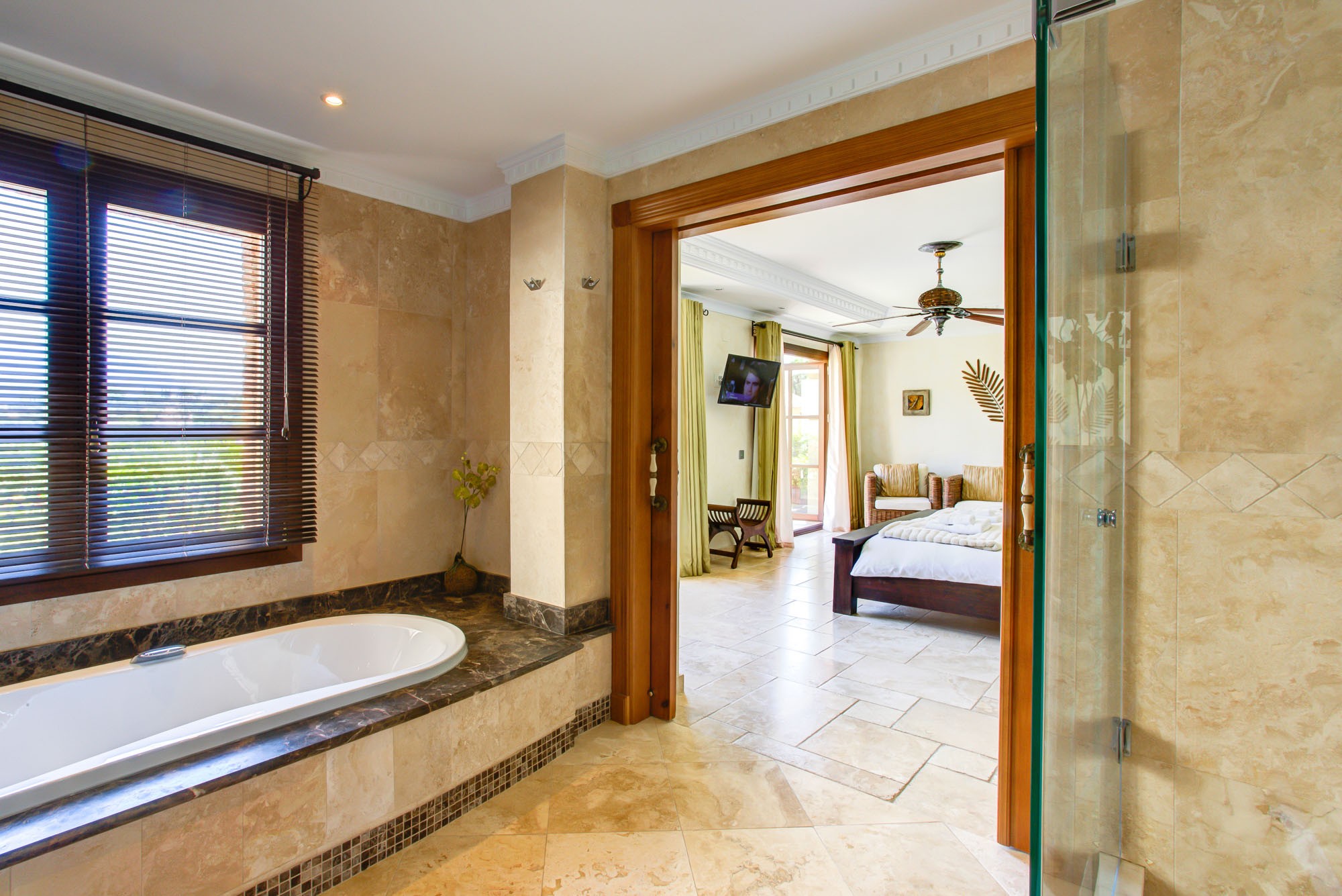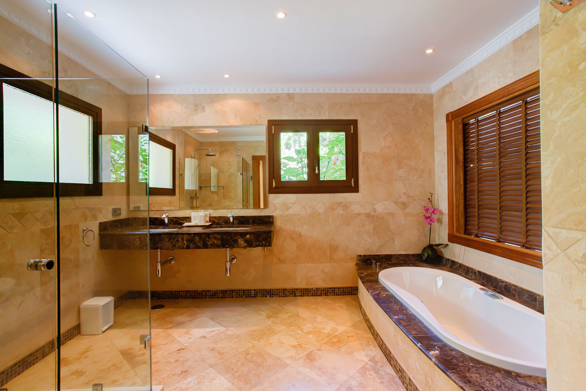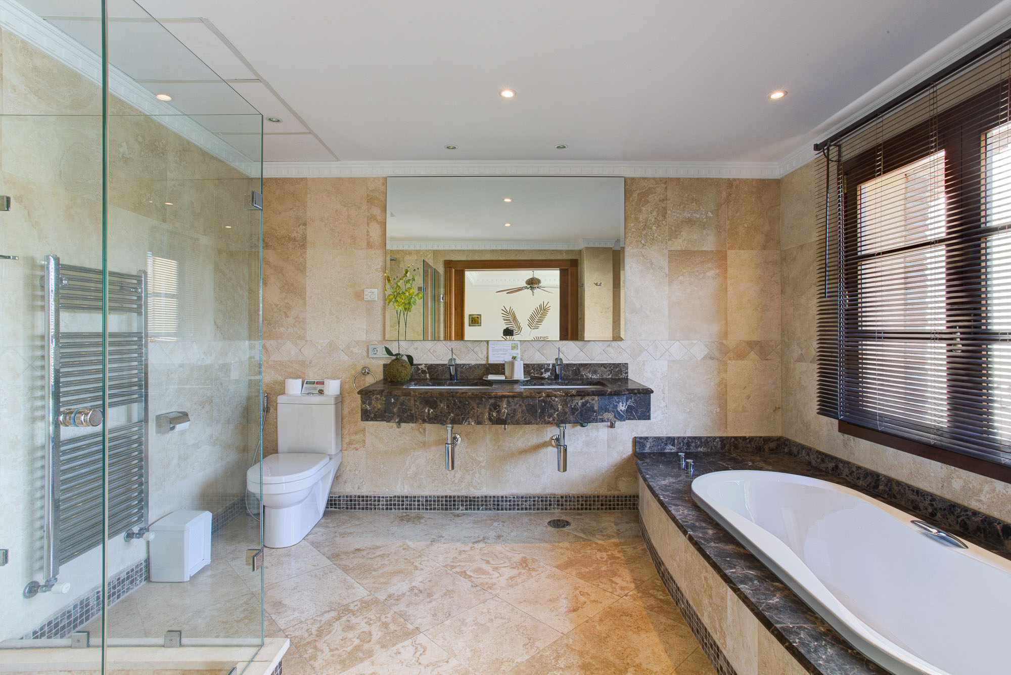 The bedroom suites in the main house are spacious and welcoming, and there is room for additional beds if required. All rooms have their own seating area, air conditioning and silent ceiling fans, 32″ HD TV sets and the best quality mattresses and linens for a blissful night’s sleep. En-suite bathrooms are laid with the finest Italian marble, and the master suite also comes with an enormous 2 person bath tub.