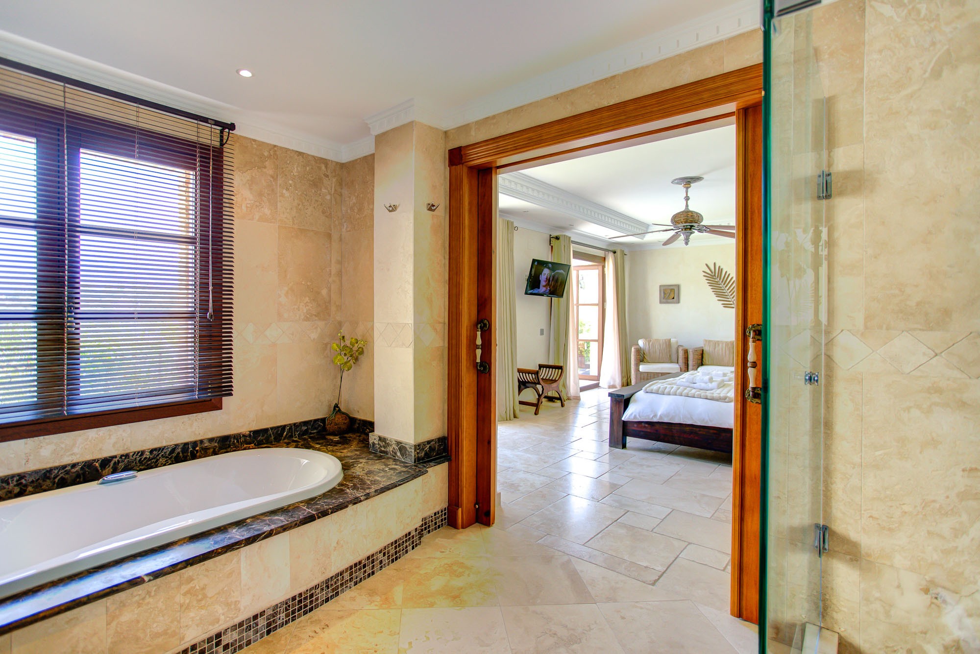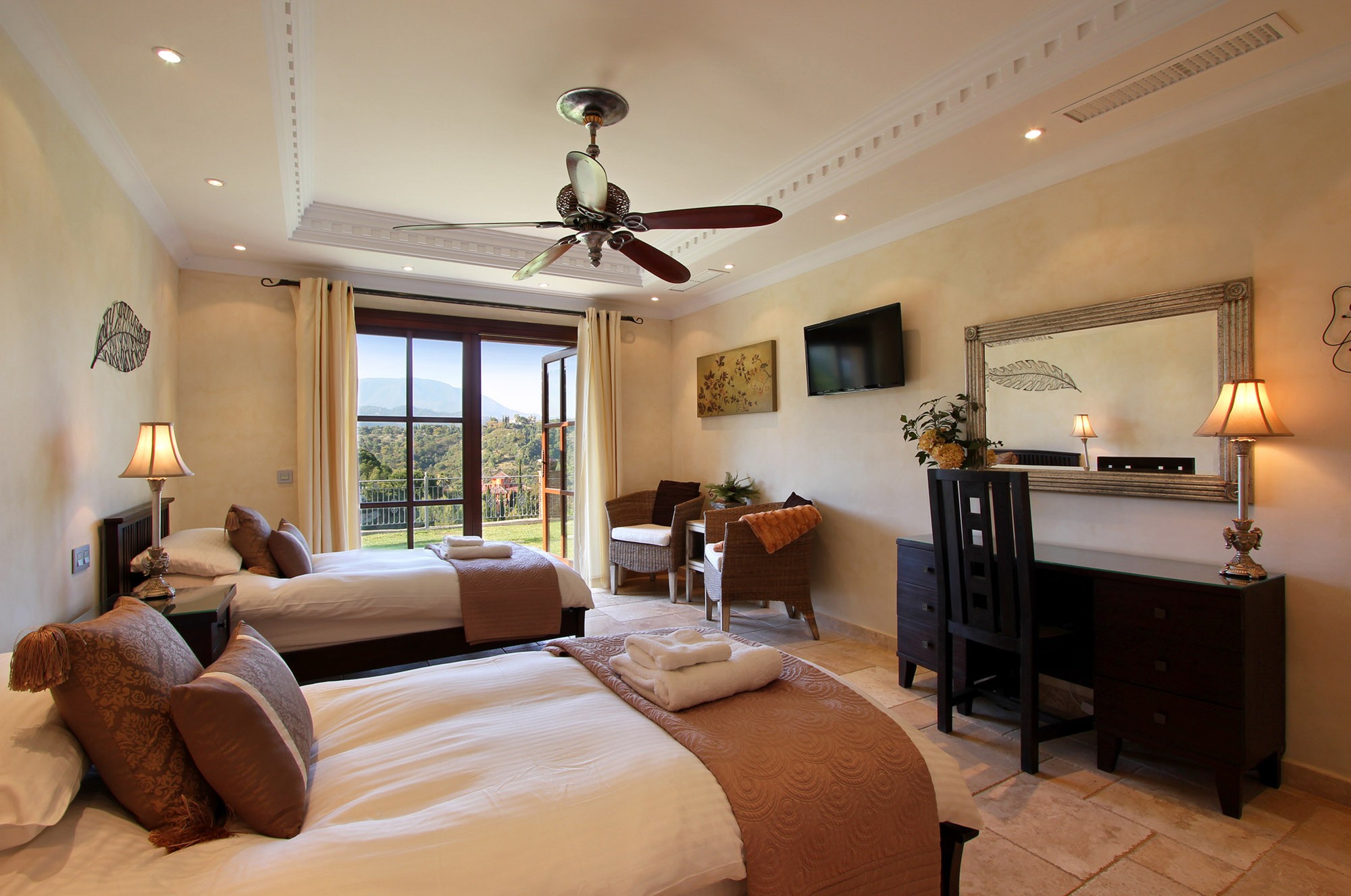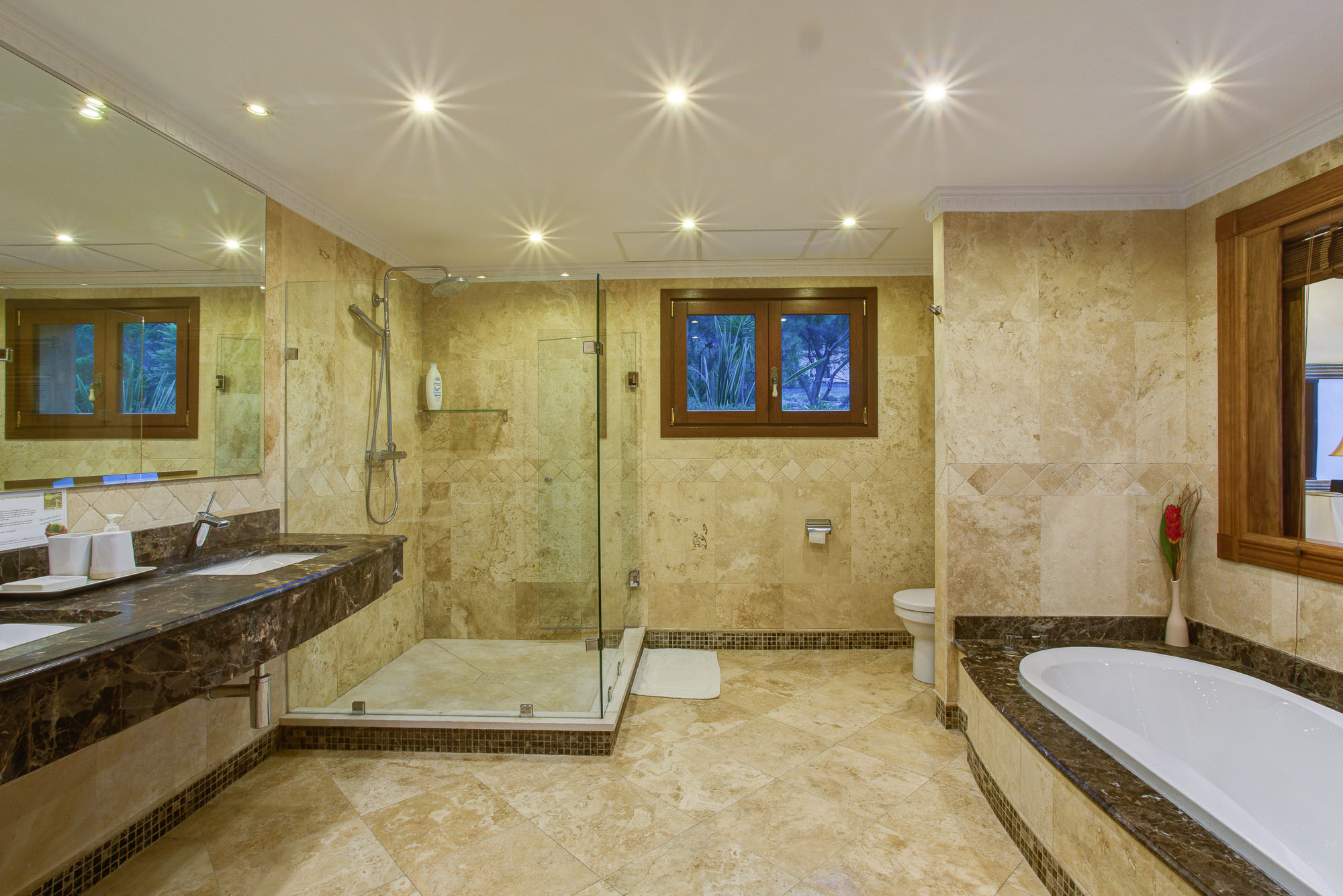 The bedroom suites in the main house are spacious and welcoming, and there is room for additional beds if required. All rooms have their own seating area, air conditioning and silent ceiling fans, 32″ HD TV sets and the best quality mattresses and linens for a blissful night’s sleep. En-suite bathrooms are laid with the finest Italian marble, and the master suite also comes with an enormous 2 person bath tub.