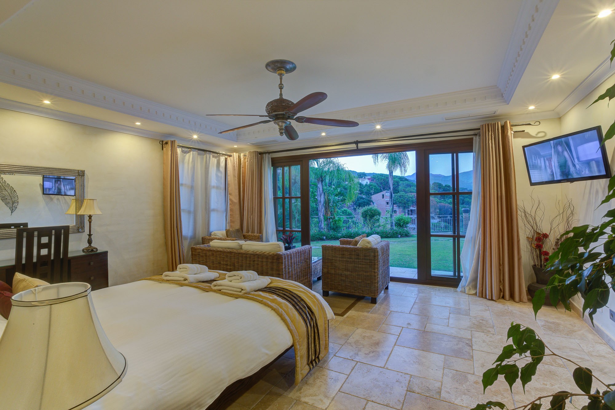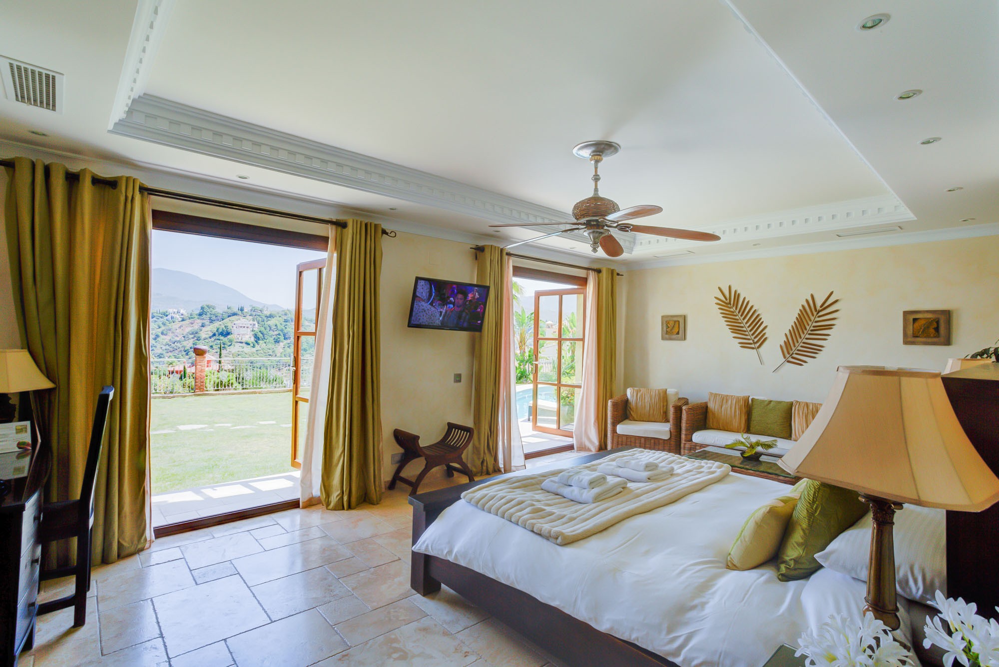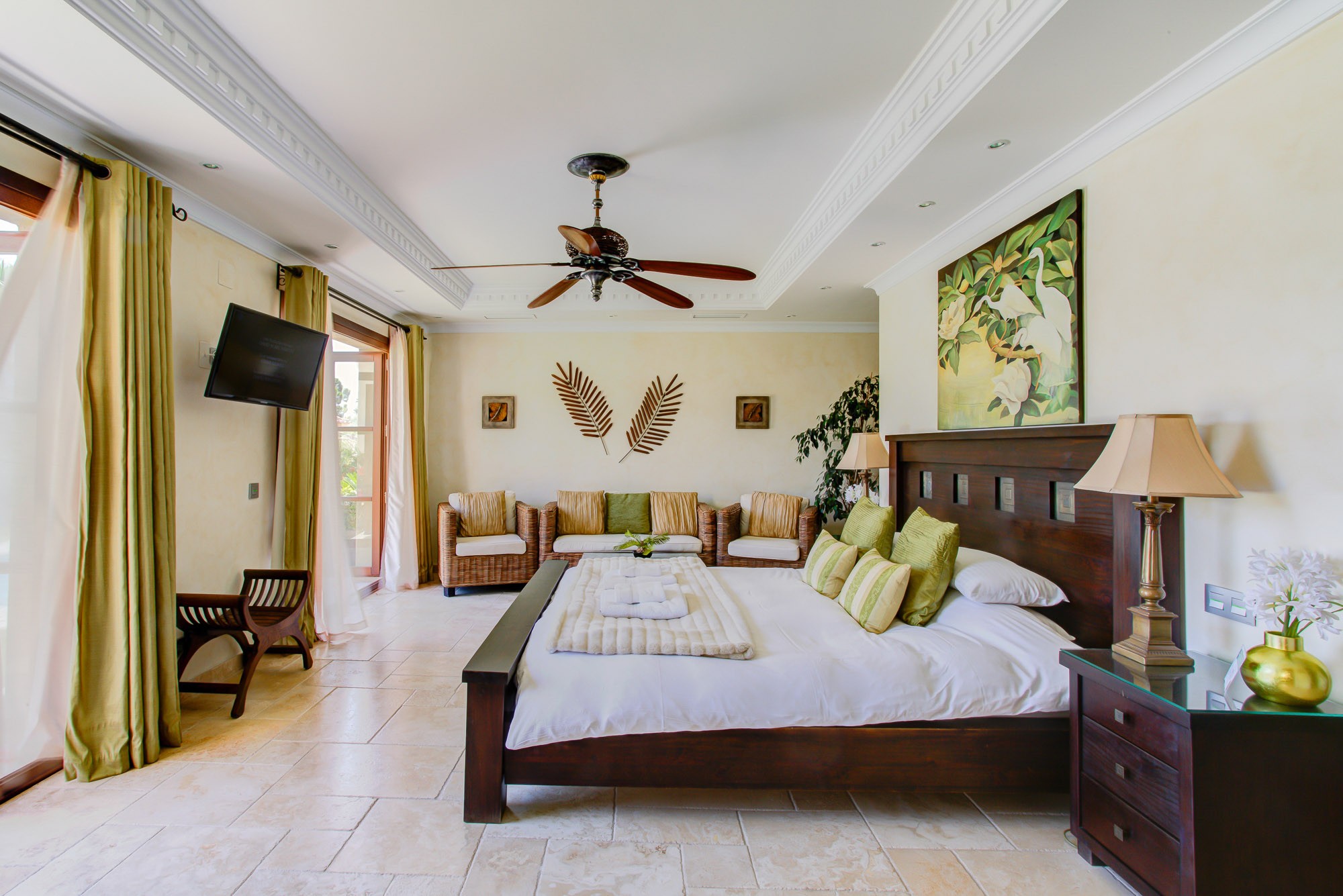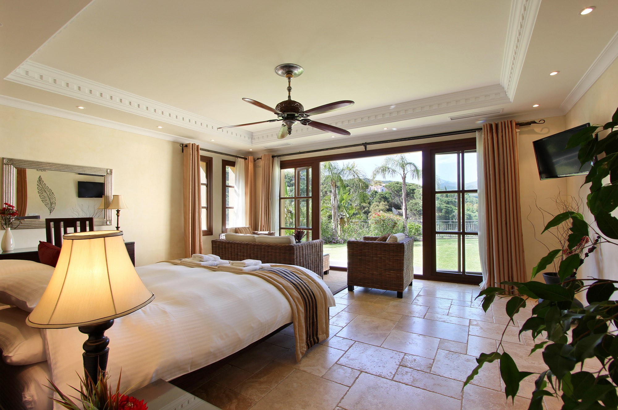 In the bedrooms there is a distinctly tropical vibe, with sumptuous throws, cushions and indoor palms adding the finishing touches. Each has direct access to the gardens and pool through French windows, while the master bedroom has its own private terrace on the first floor.