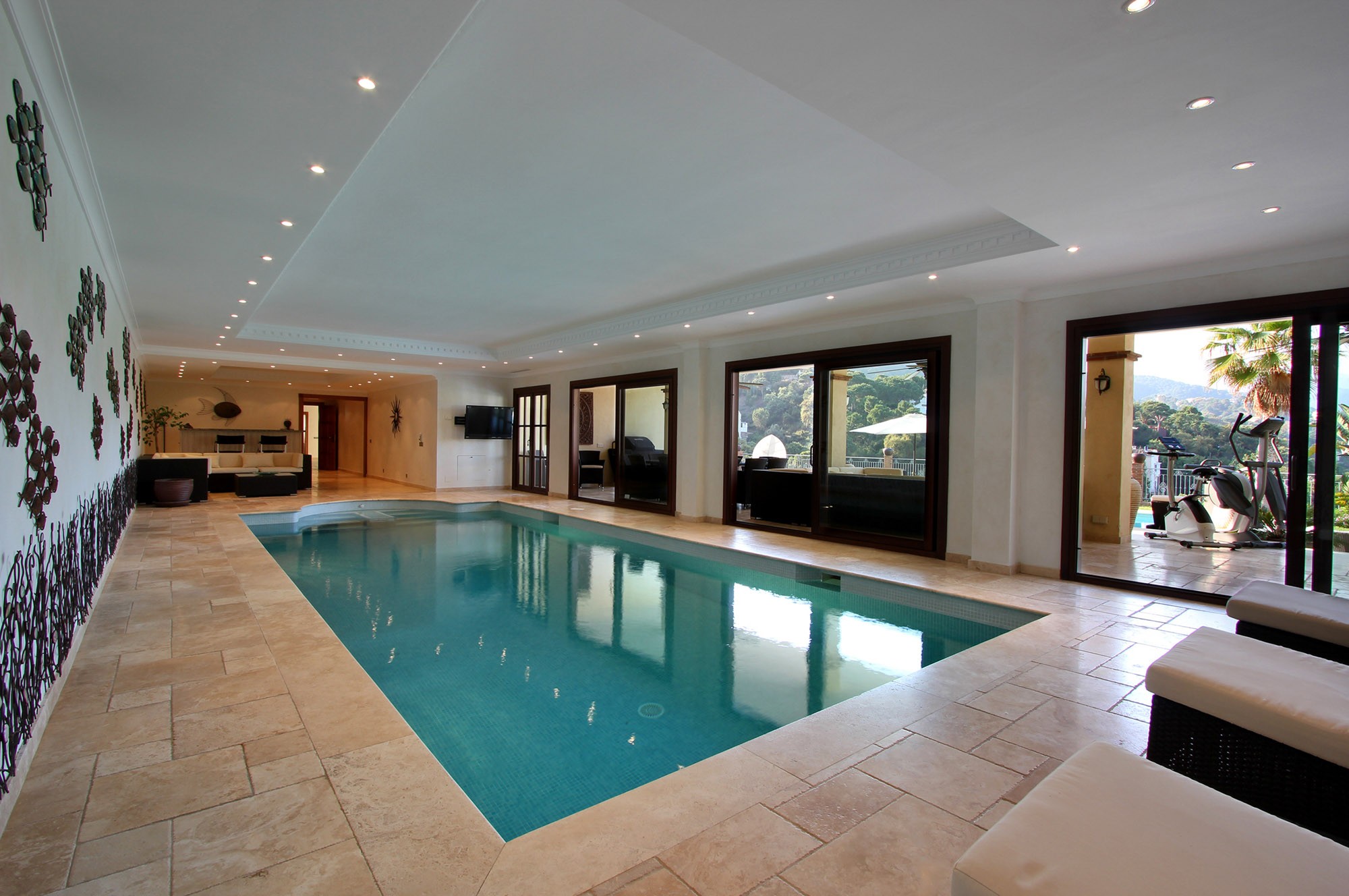 The piece de résistance is the indoor spa complex, ideal for both winter or summer use. It includes a large indoor heated swimming pool complete with the latest hydra-jet water propulsion system which allows you to swim against a constant water stream. There is also a 6-8 person sauna and full bar area with lounge seating plus satellite TV.