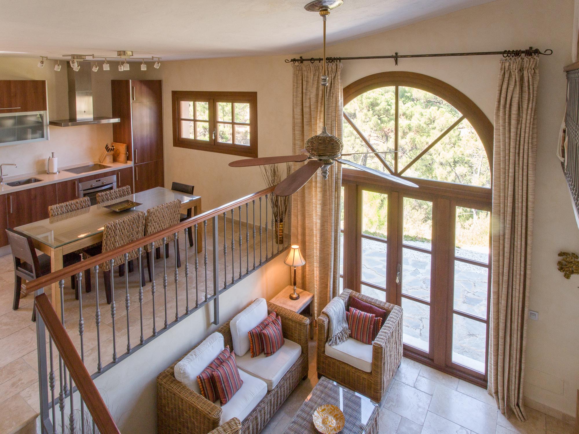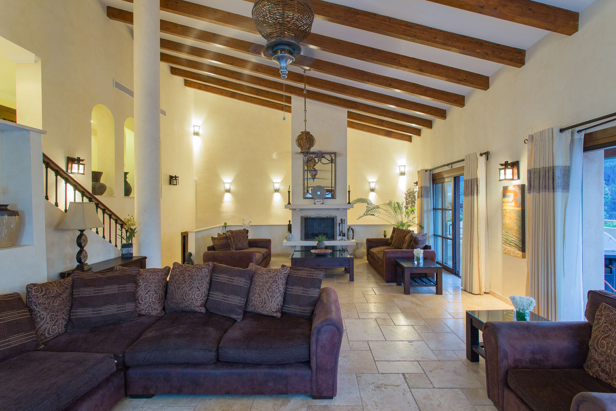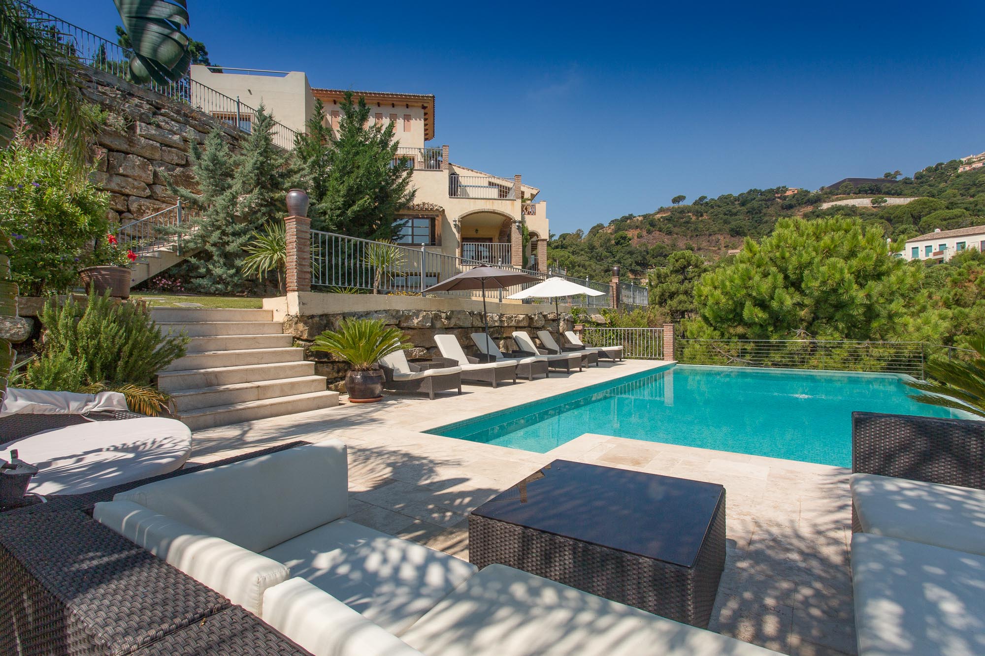 The quality of this villa will make an impact as soon as you walk through the huge antique front door and onto the stone walkway that forms a gallery above the main living room. With its 6m high ceiling and panoramic windows, the sense of space is magnificent, even at full capacity with 15 guests.