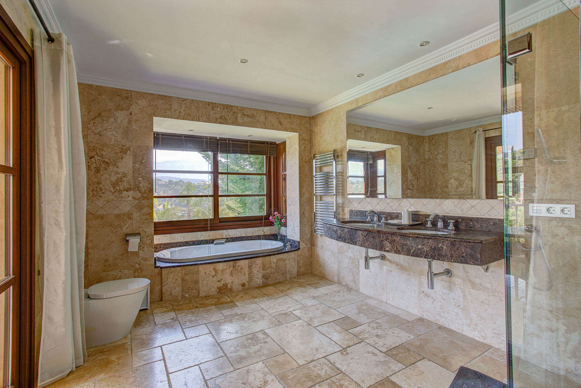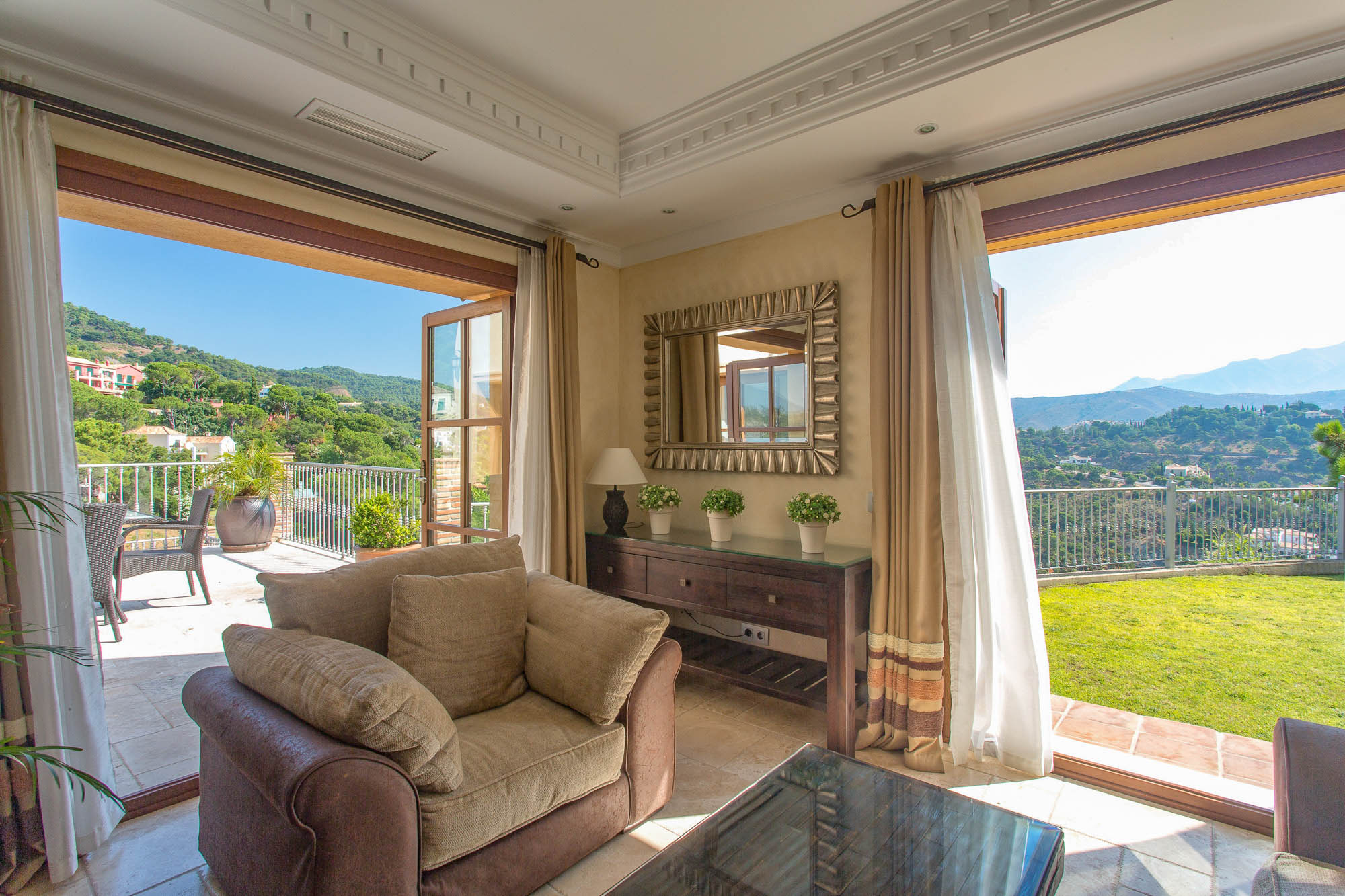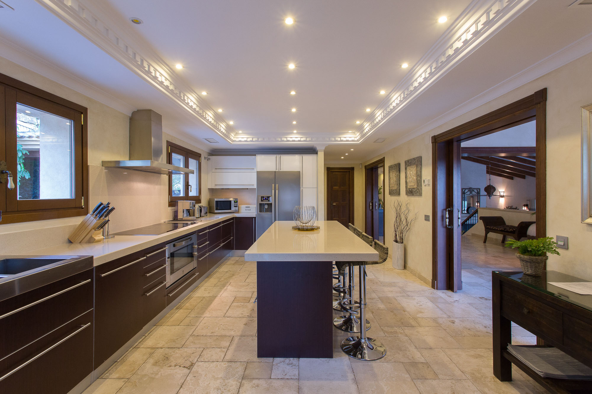 This villa effortlessly blends traditional Spanish details such as the arched windows and aged wooden beams, with the cool contemporary lines like you will find in the modern kitchen. The kitchen is fully equipped with everything you could possibly need from a juicer to espresso machine, but if you don’t fancy cooking then we can also assist with chefs and extra housekeeping, as well as doing your shopping for you before you arrive.