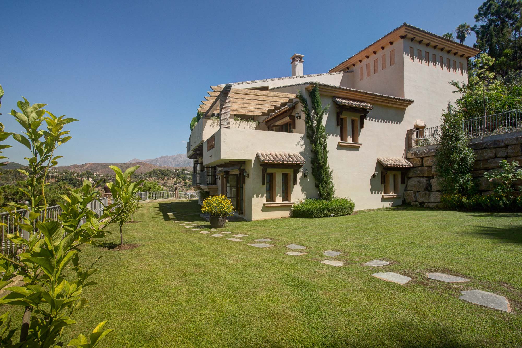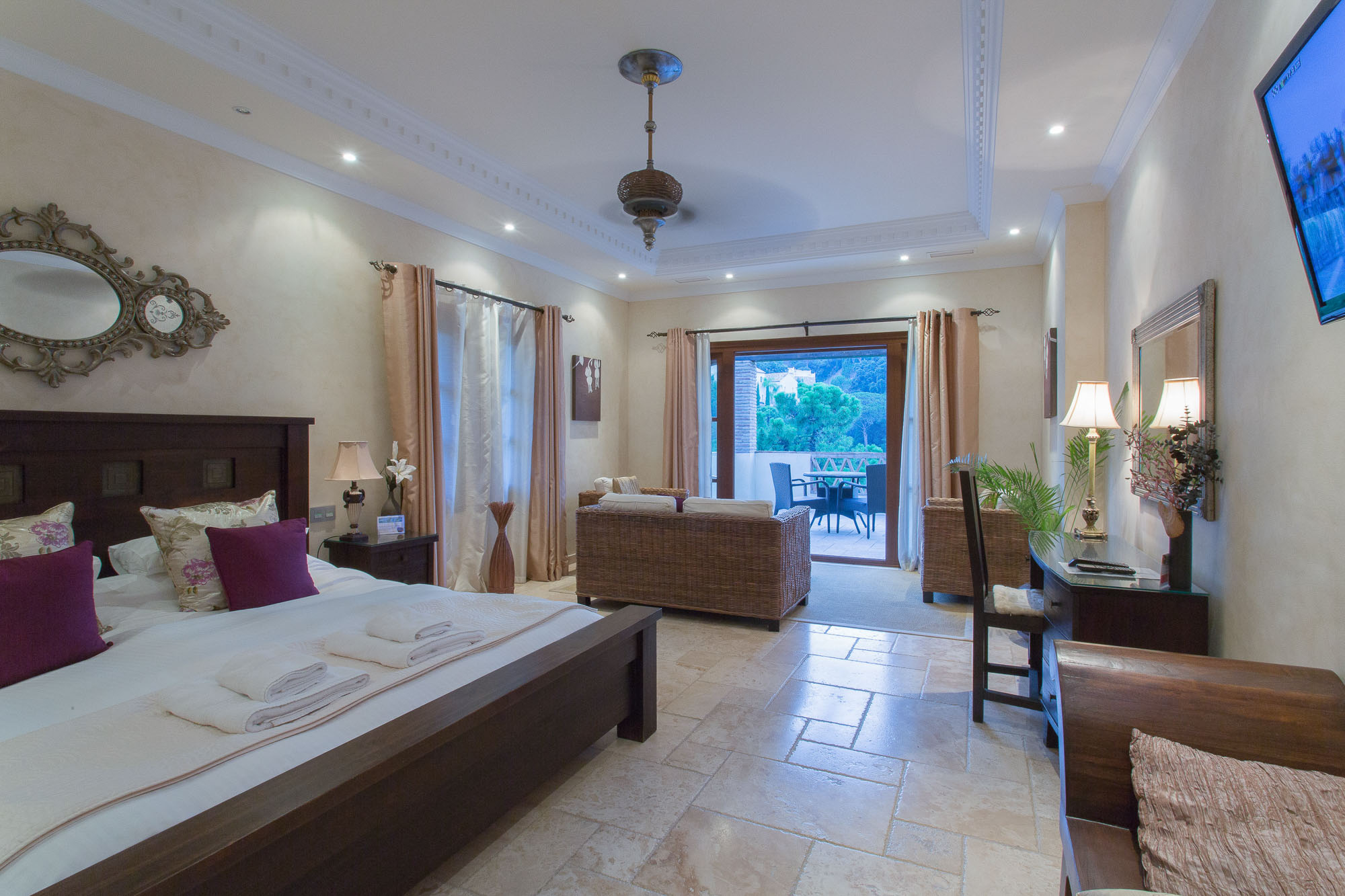 In the bedrooms you will enter a more tropical style of decor, with sumptuous throws, cushions and indoor palms adding the finishing touches. Each has its own private balcony or direct access to the gardens through French windows.