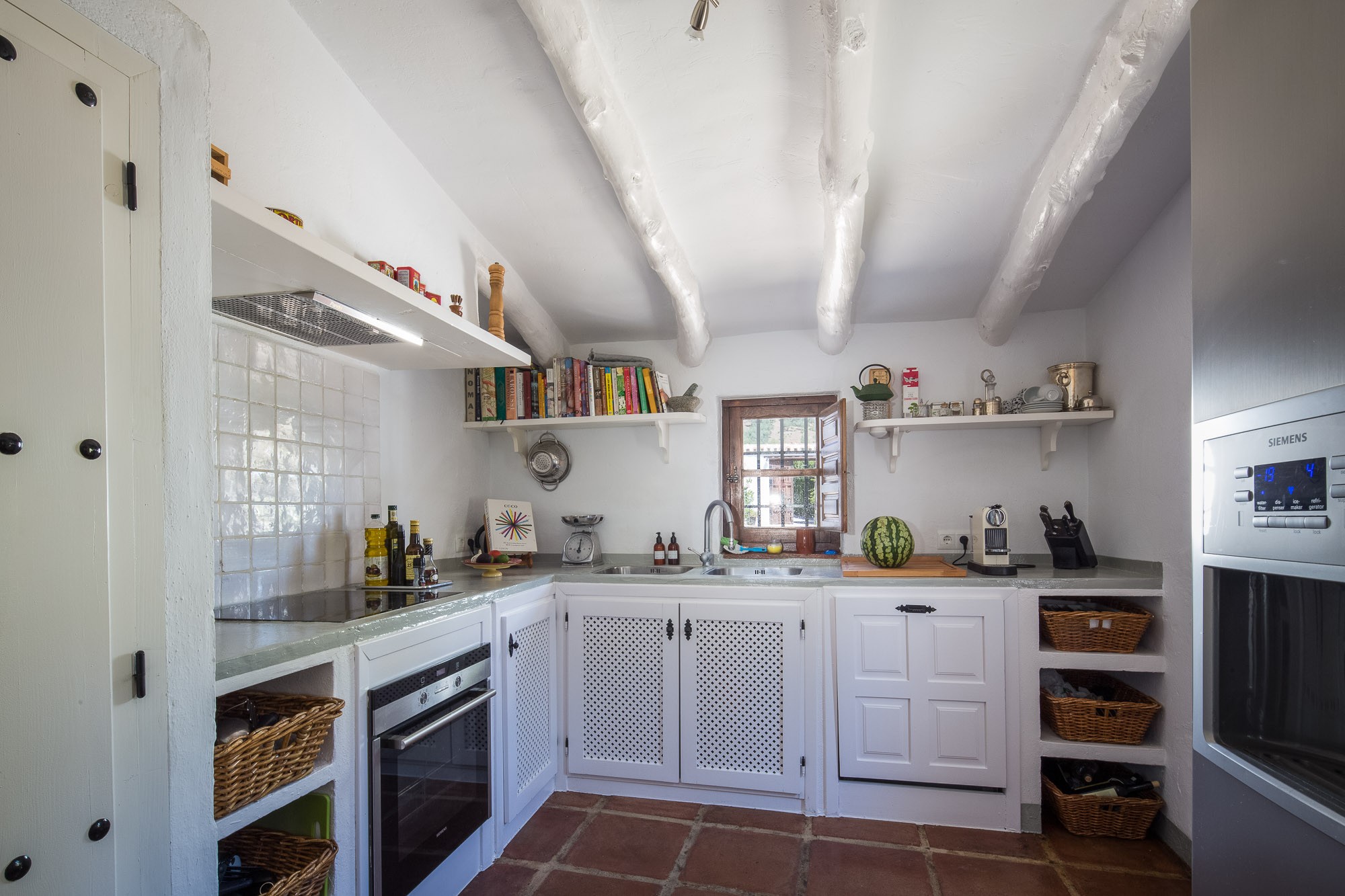 Spanish cortijo-style kitchens with upgraded amenities and appliances, including a Lacanche oven, gas range, microwave, dishwasher, American fridge-freezer, water cooler and ice dispenser