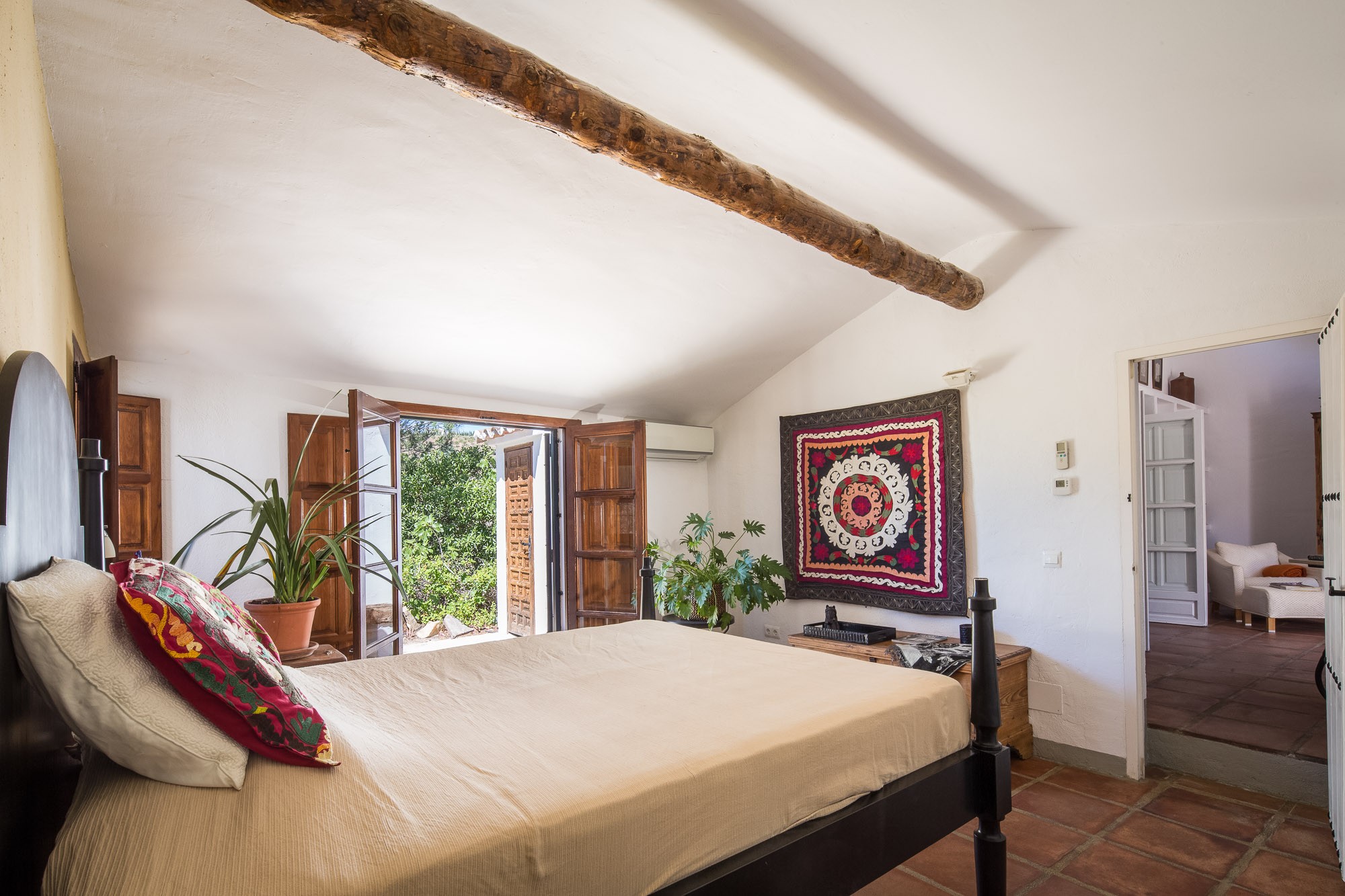 Bedroom 4: Casa Miravista’s master bedroom, located in a poolside annexe separate from the main house. Contains double bed with french windows opening out onto the terrace. En-suite bathroom with walk-in shower.