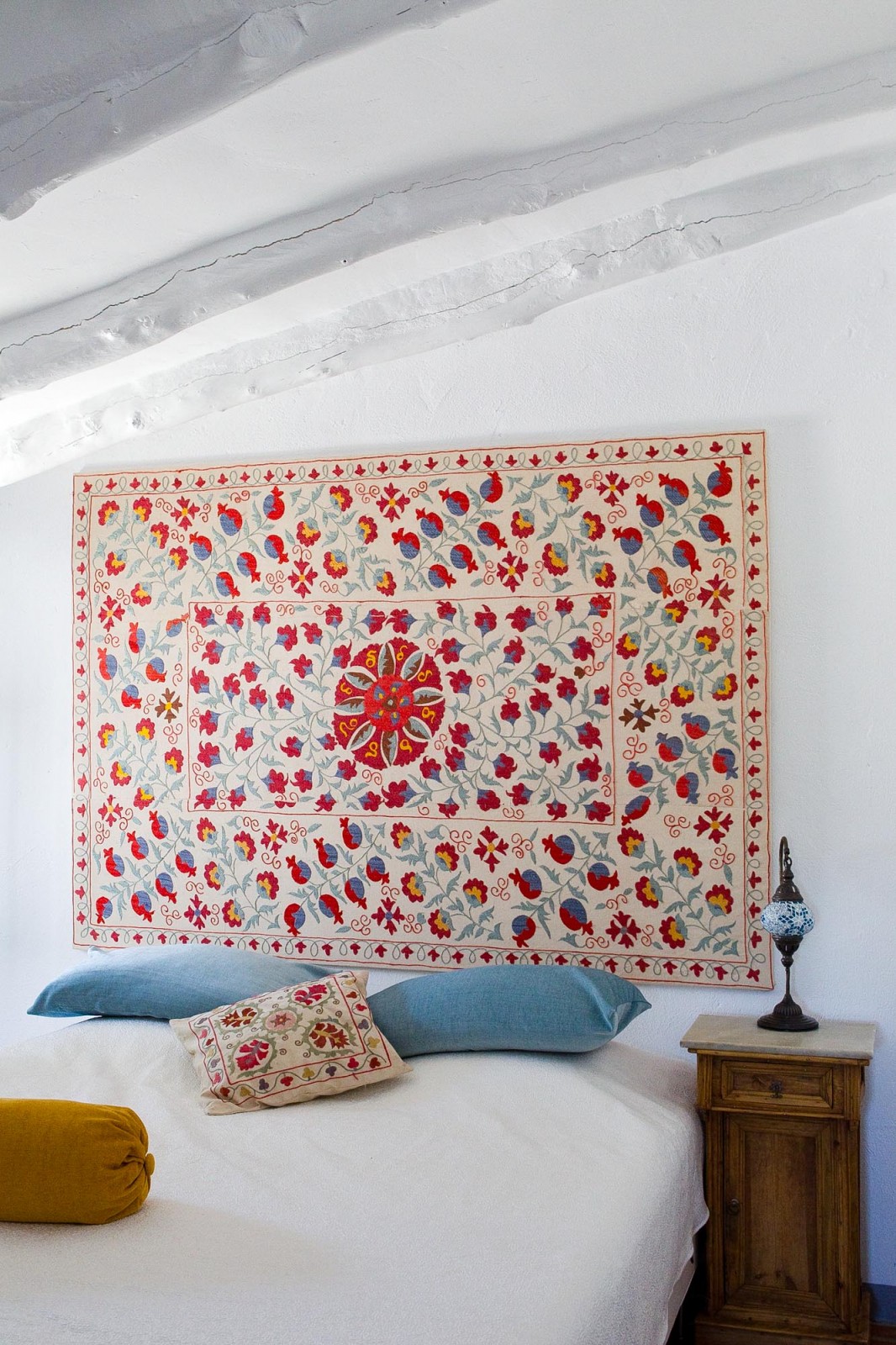 Bedroom 5: Casa Miarvista’s second bedroom. Features double bed with bespoke, wood-carved bedside tables. En-suite bathroom with tub and rain shower and colourful Andalucian floor tiling.
