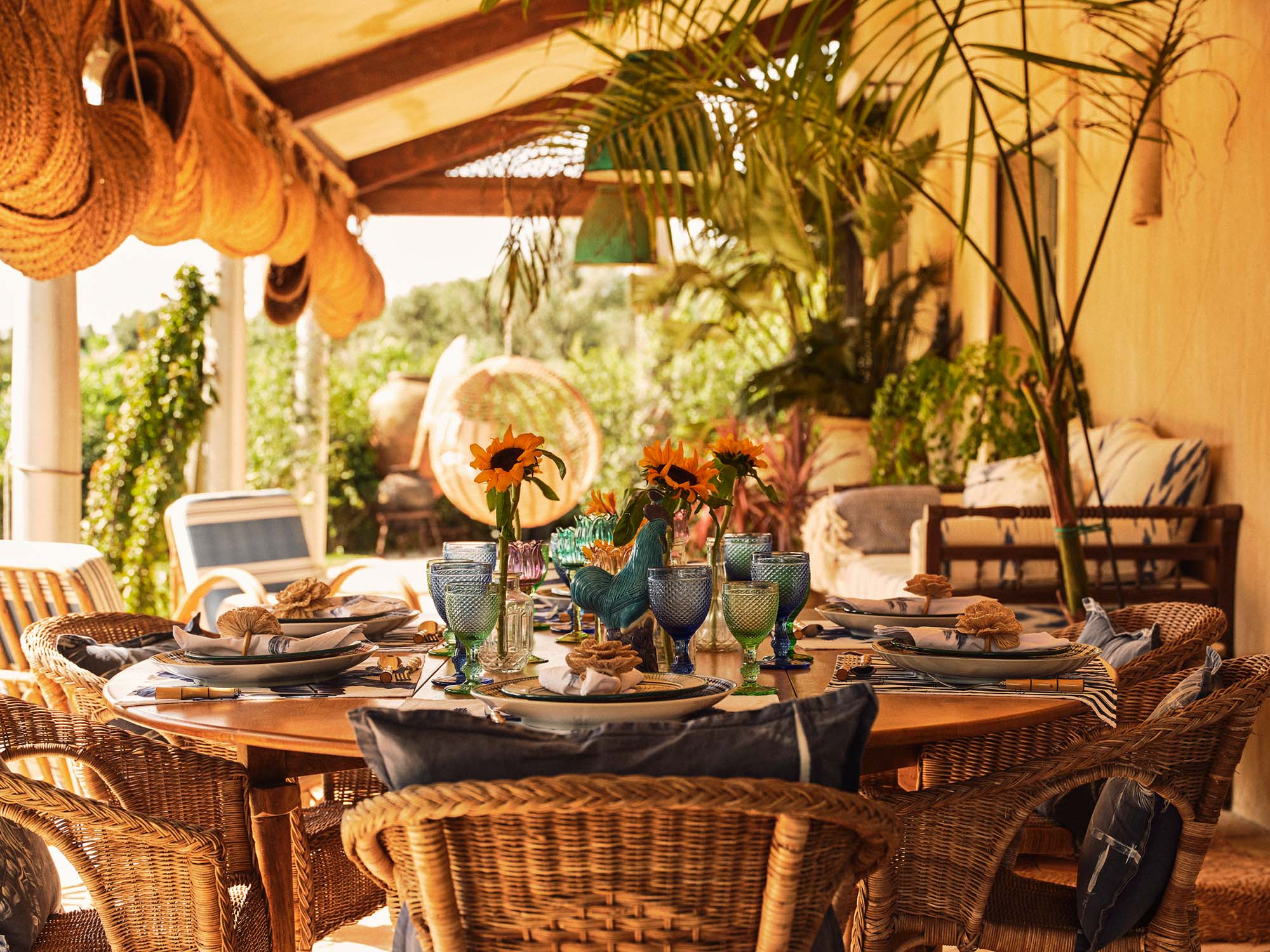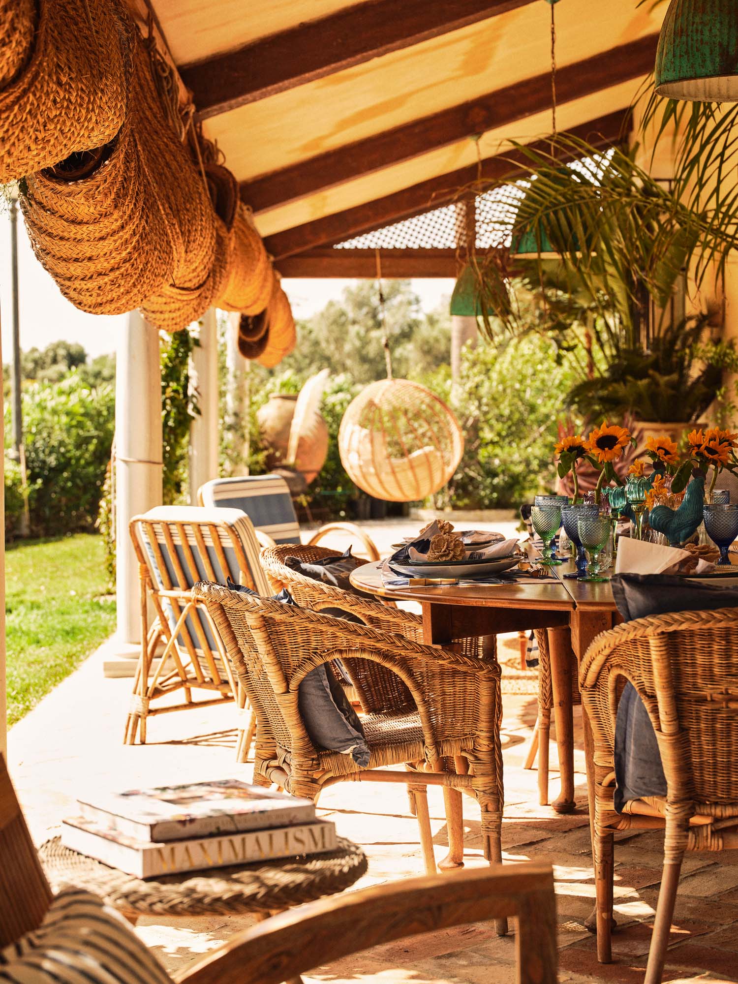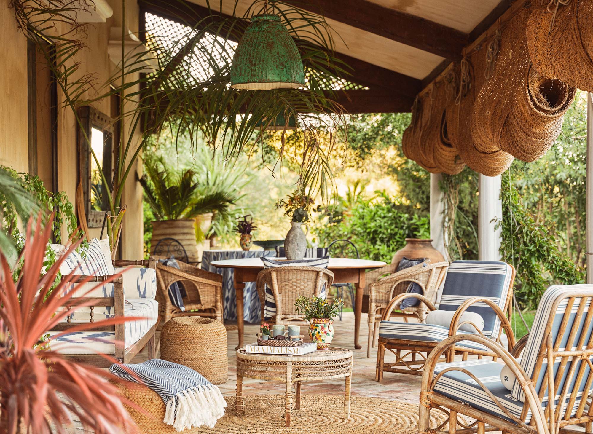 Outside, a large, covered porch provides a comfortable setting for relaxing during the day, furnished with seating, potted plants and a hanging chair.