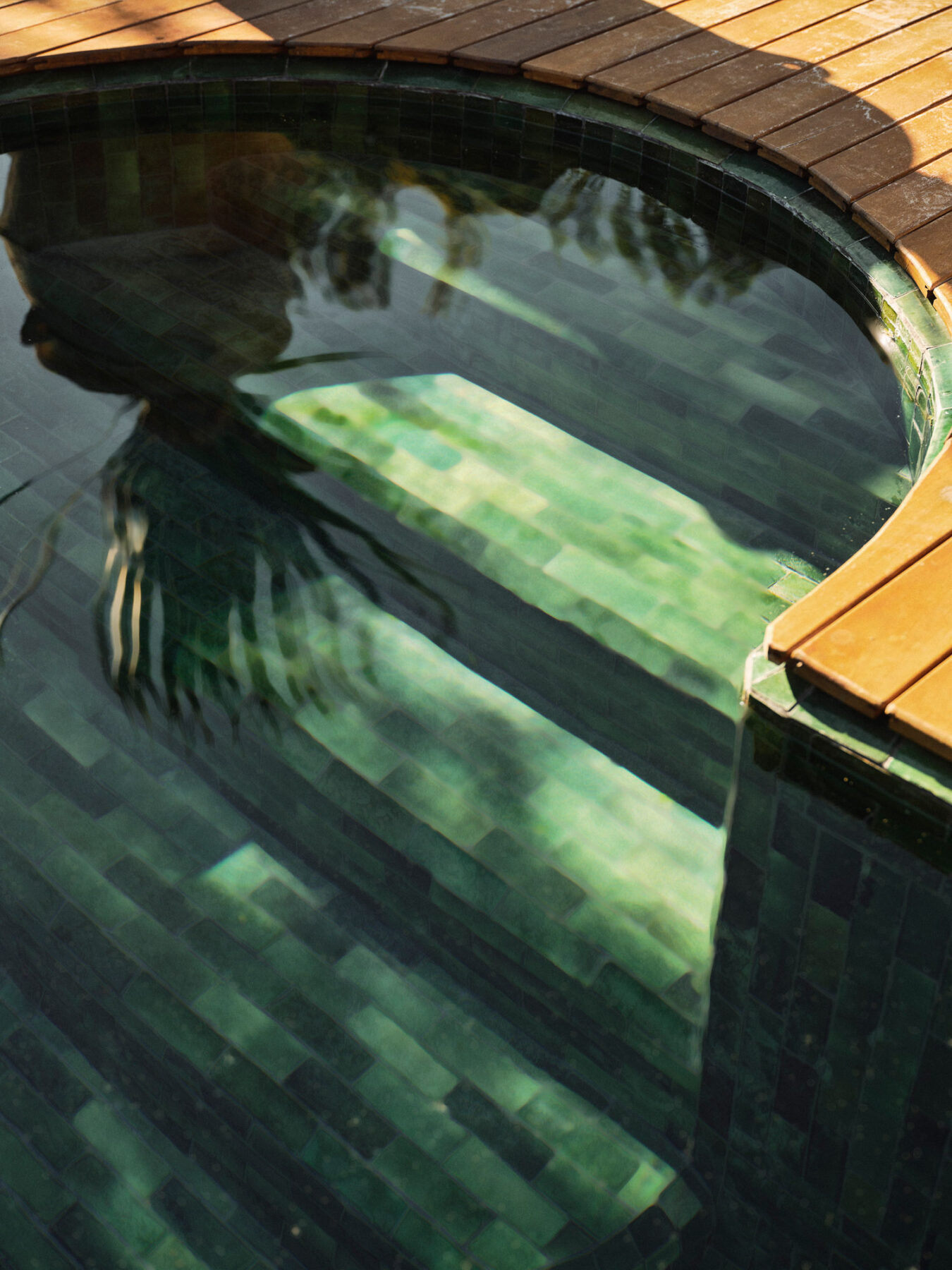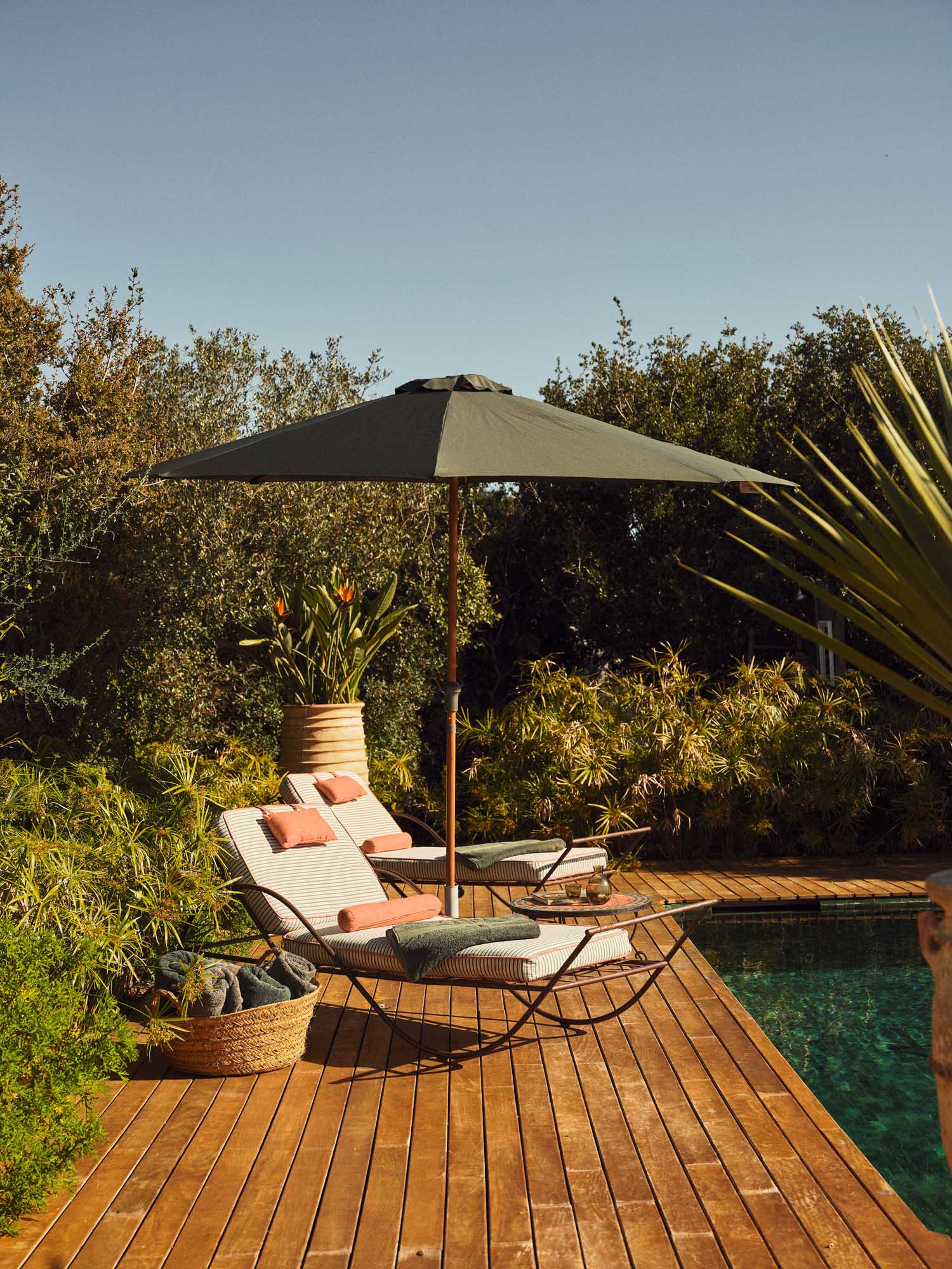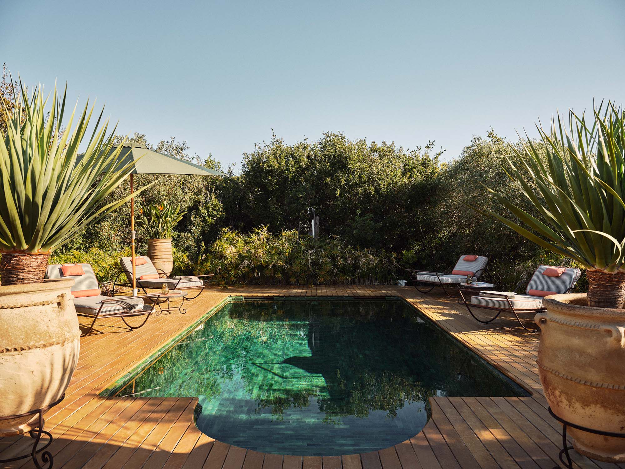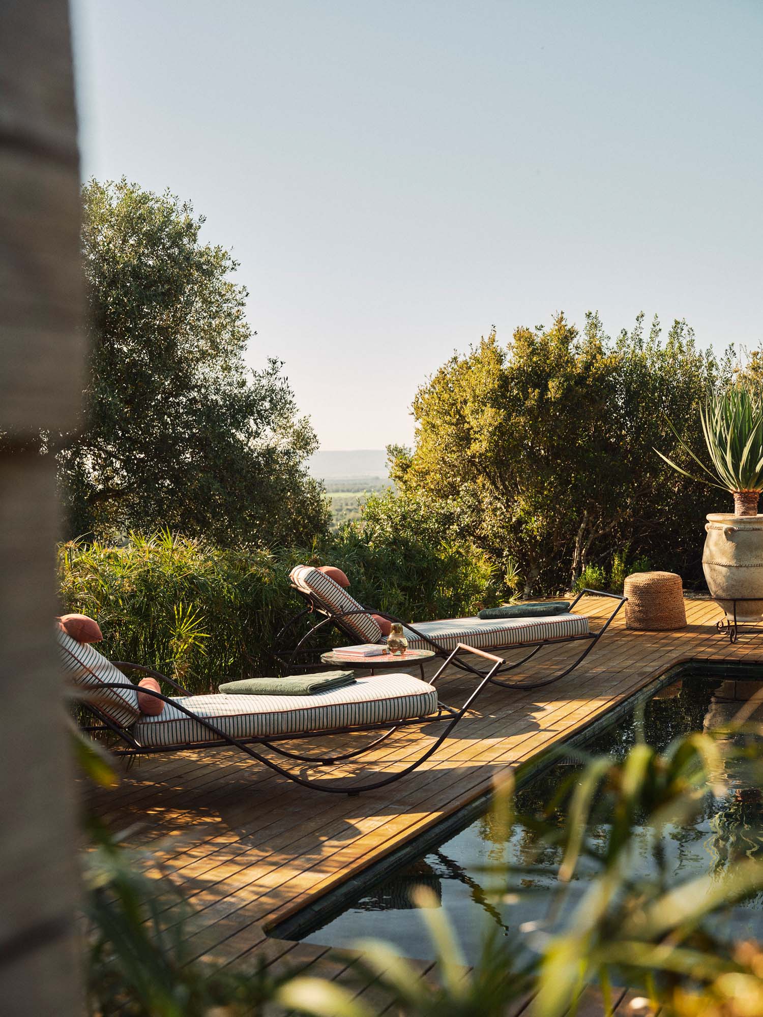 The swimming pool is positioned away from the main house, offering a quiet place to cool off. Dense planting encloses the area while still allowing views across the surrounding landscape.