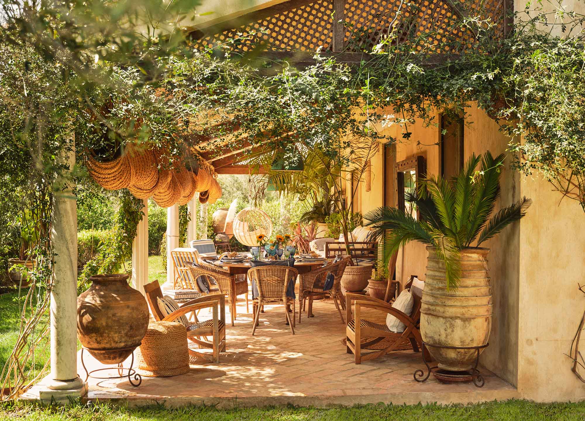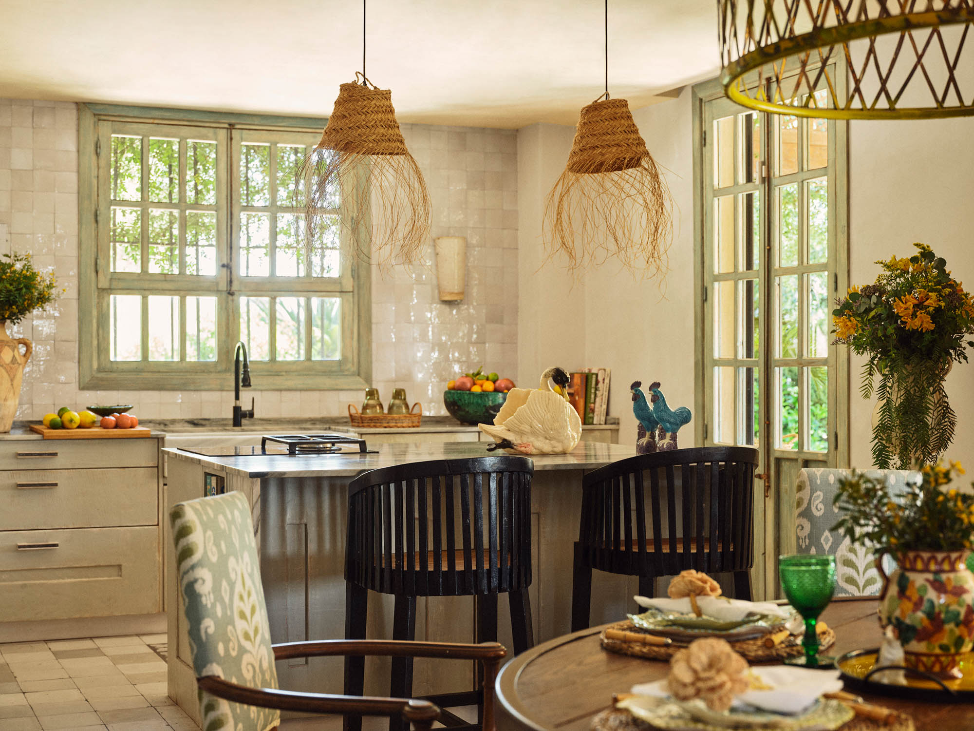Doors open from the kitchen towards the terraces, allowing easy access to a covered terrace dining table with 6-10 chairs overlooking gardens and pool, ideal for long outdoor meals.