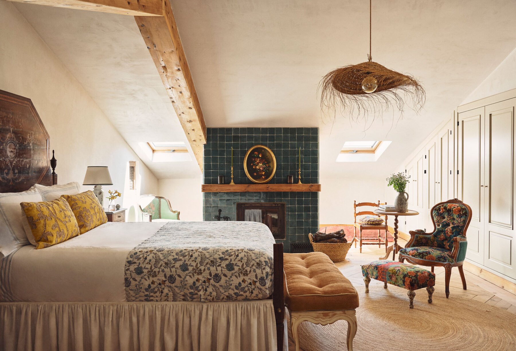 Principal Bedroom 1: A large and characterful room located in the eaves of the house. Beautifully decorated, this spacious room offers a calm retreat and features an open en-suite bathroom with a freestanding bath and separate shower. Space for an additional bed for a child.