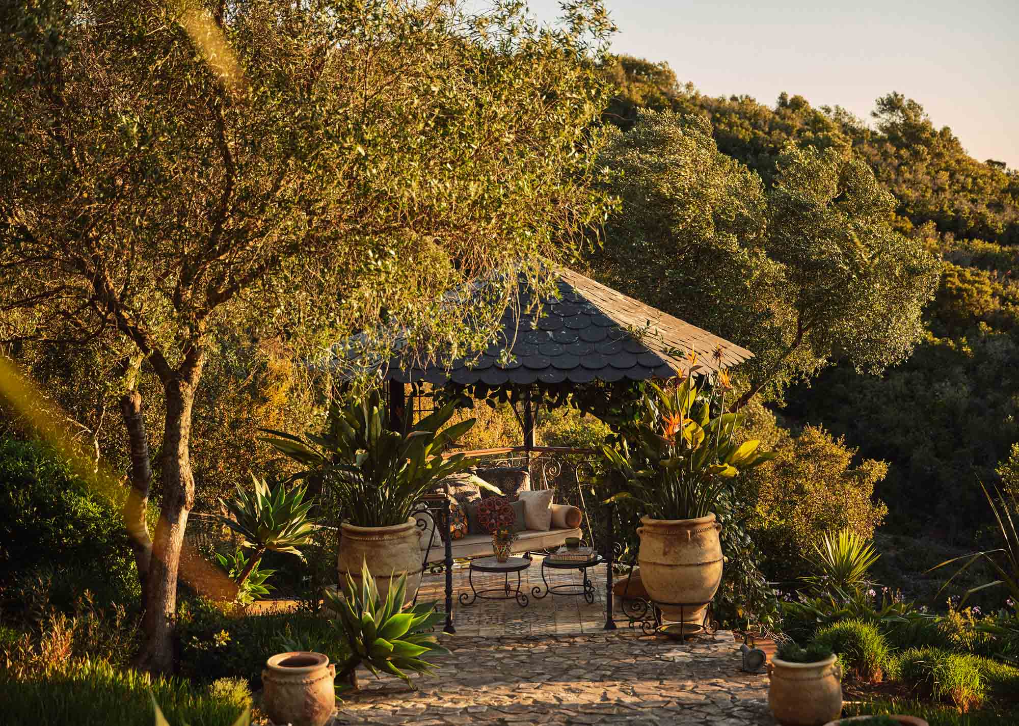 Terraces and shaded areas blend into abundant gardens, inviting guests to linger outside from morning through to evening – perfect for long lunches beneath the trees, lazy days by the pool or quiet moments watching the light fade across the hills.