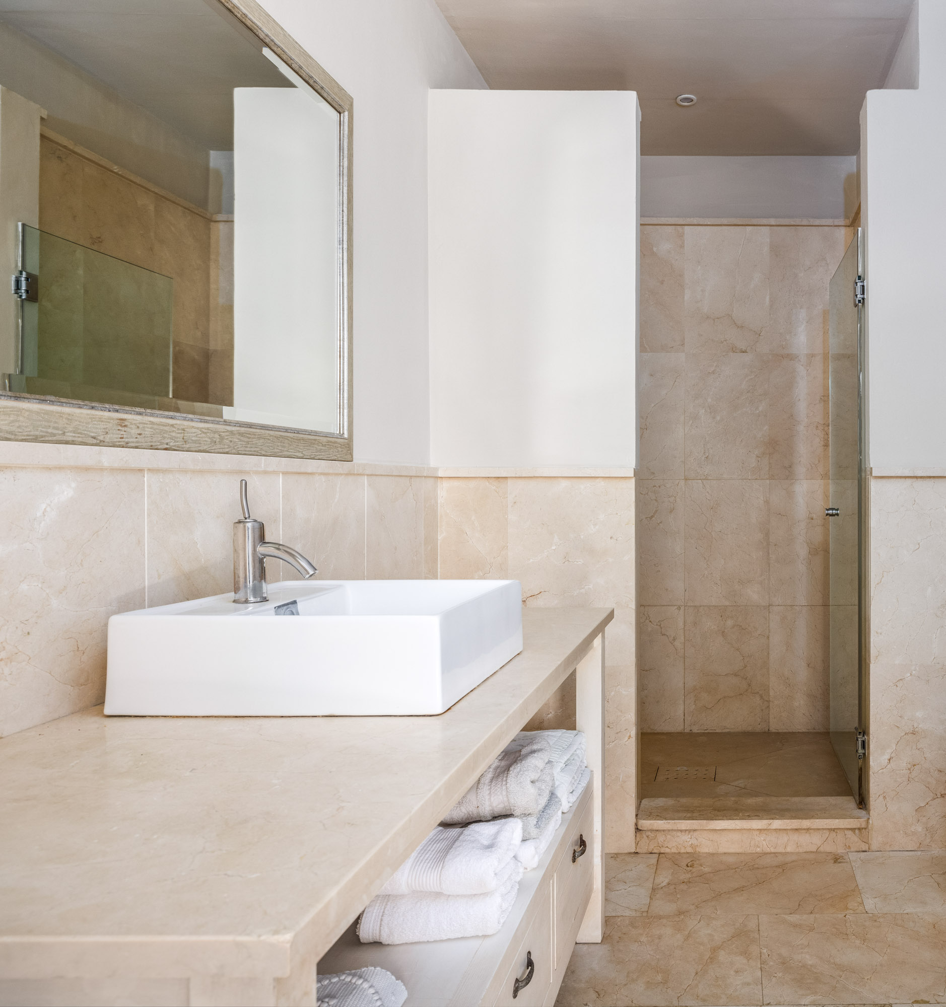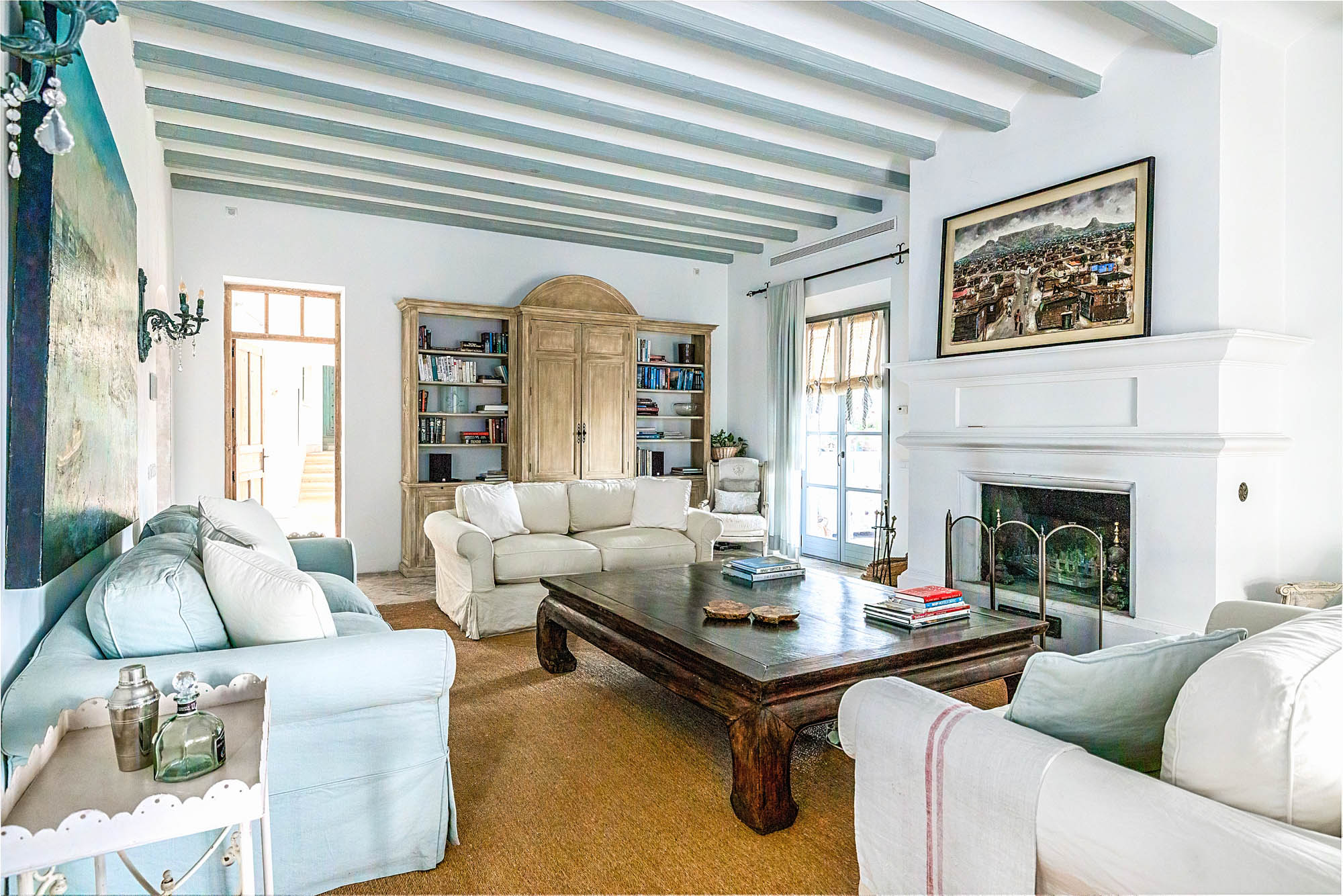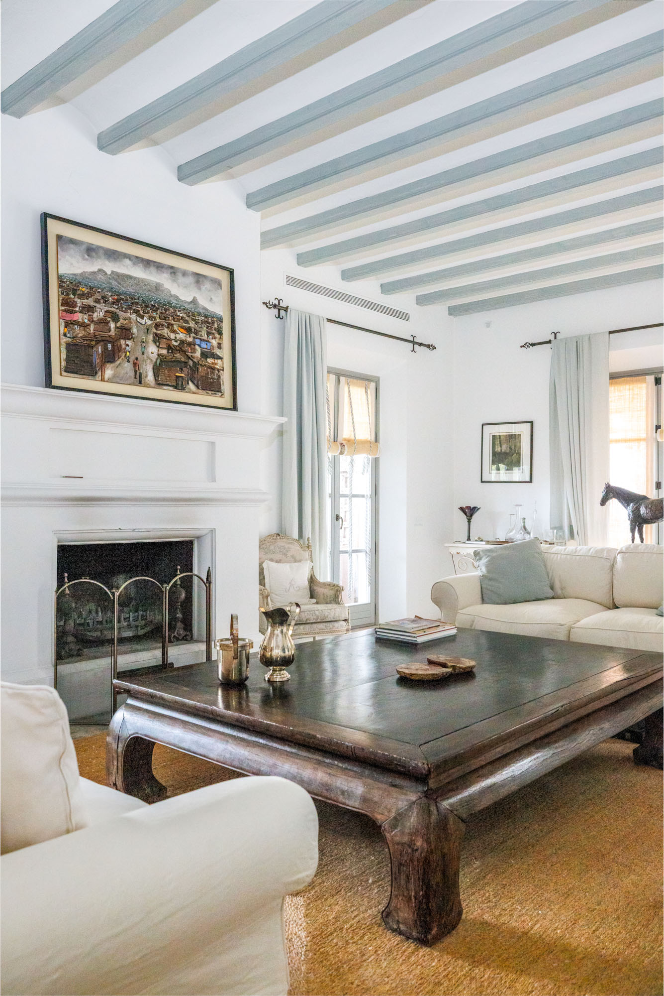 Located on the ground floor of Hacienda Bolero, the main family-sized living room is decorated in soft, neutral tones accentuated by an eggshell-blue beamed ceiling. Three generously-proportioned sofas are arranged around a statement coffee table, perfect for family board games in front of the open fire.