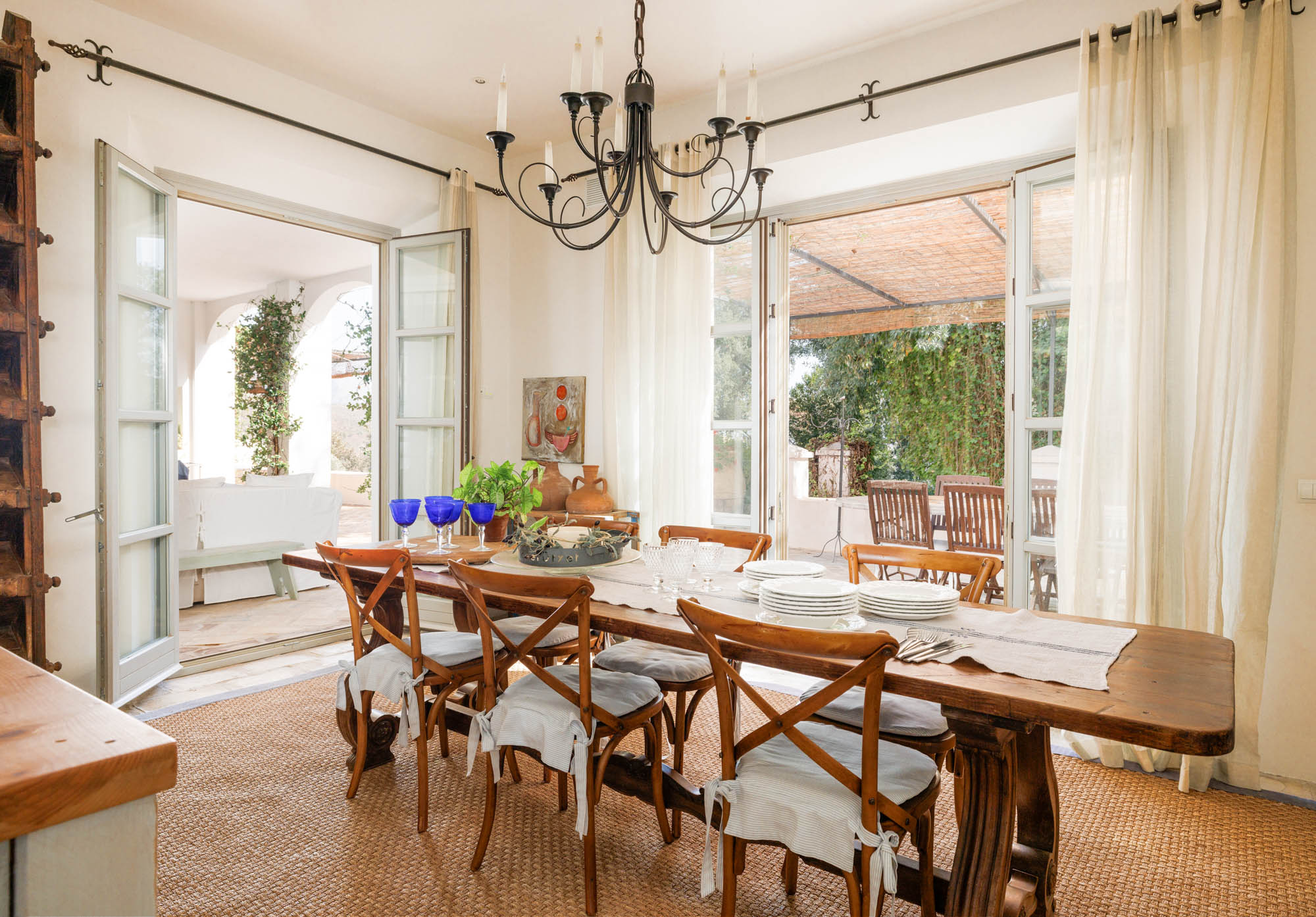 The kitchen has a family-sized table with seating for 12+ people, and French doors leading out onto the dining terrace adjacent to the pool.