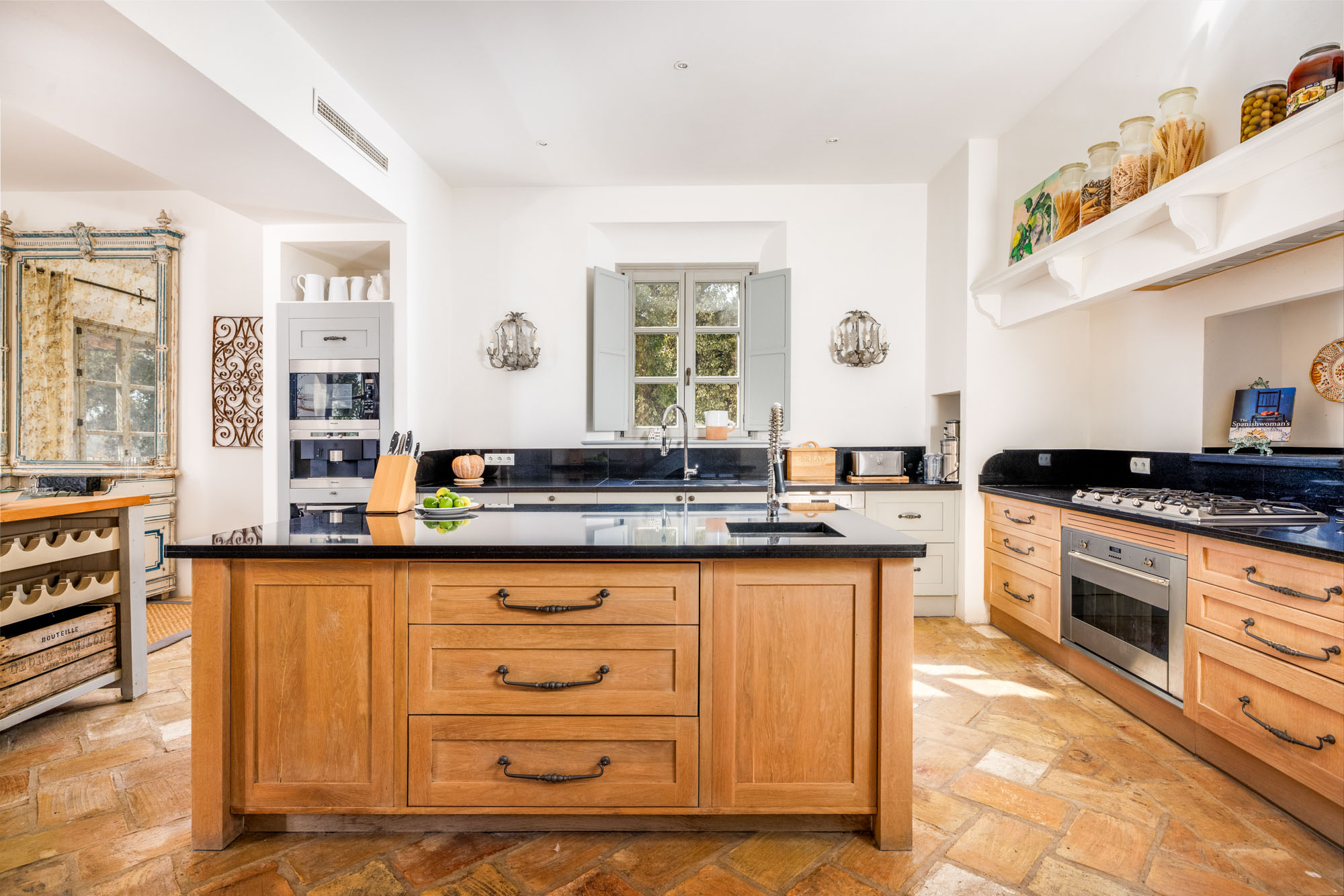Hacienda Bolero features a large, farmhouse style kitchen with original stone floors and striking design highlights.