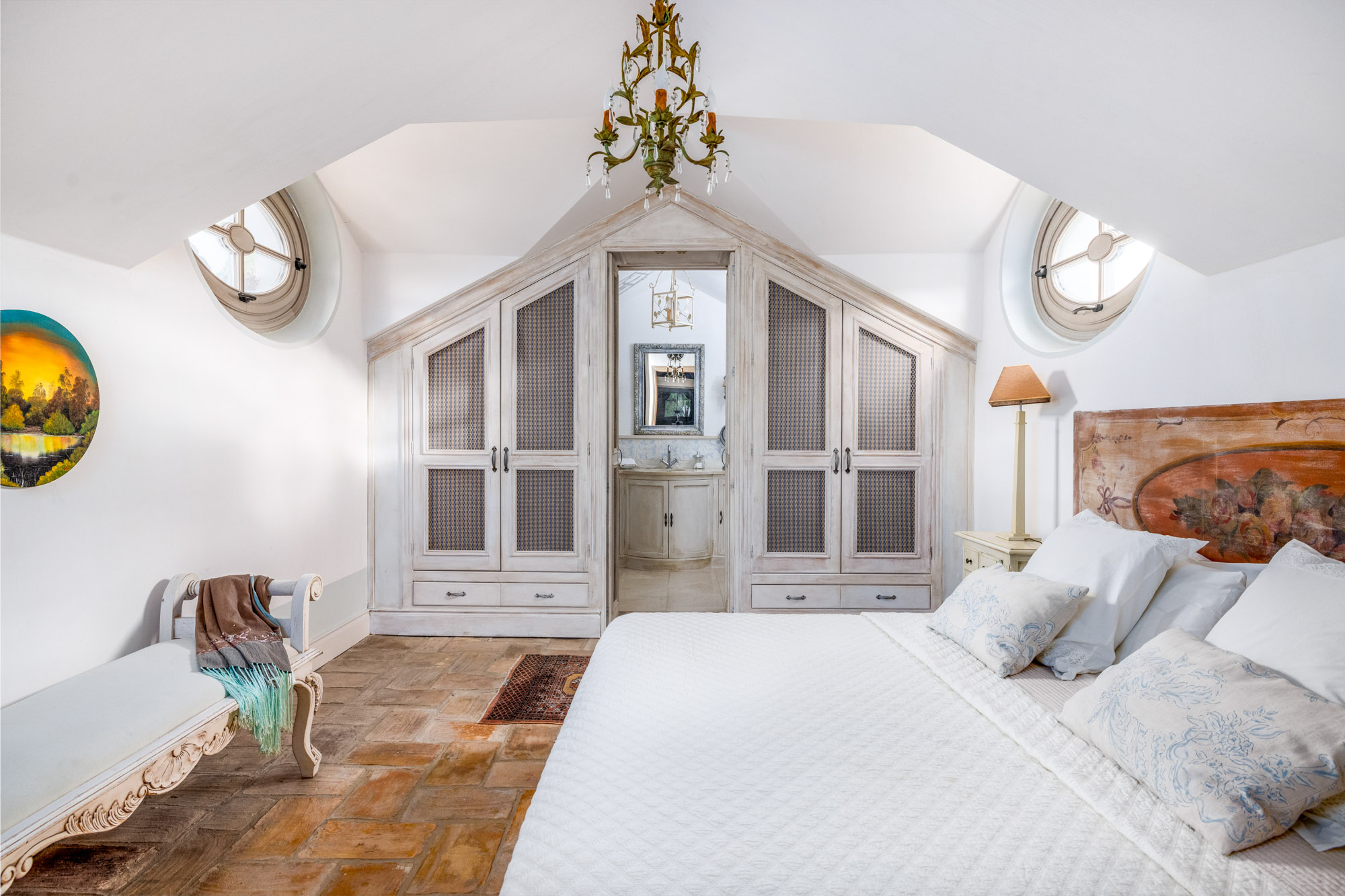 Lower ground floor, separated from bedroom 4 by reception room. Family sized suite with large living room (see bedroom 6 below) Bedroom is accessed up a stone staircase. Charming attic room with vaulted ceilings and intricately panelled doors leading into the en-suite bathroom. 180cm double bed. Access off living room into a self-contained, shaded courtyard.
