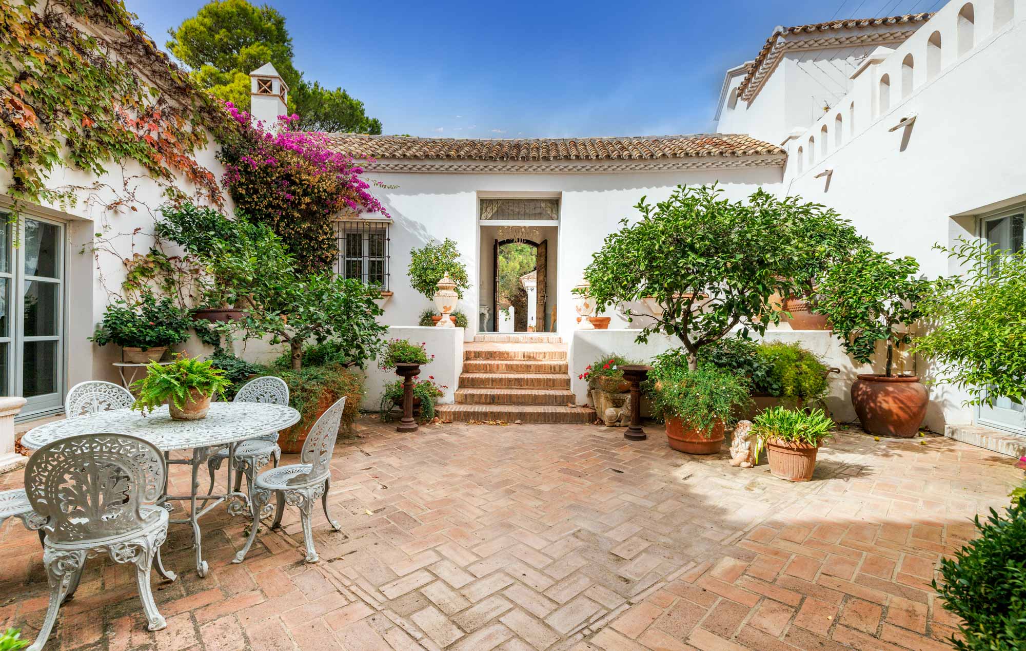 Its vine-wreathed exterior gives way to a charming Andalucian courtyard patio, where fragrant lemon trees contrast with bougainvillea blooms and gnarled olive trees.