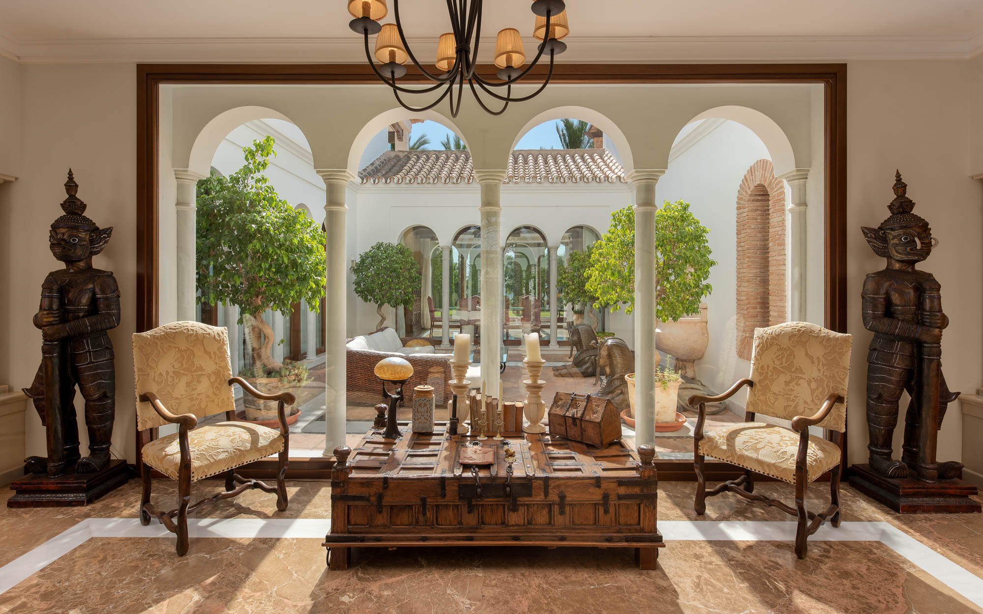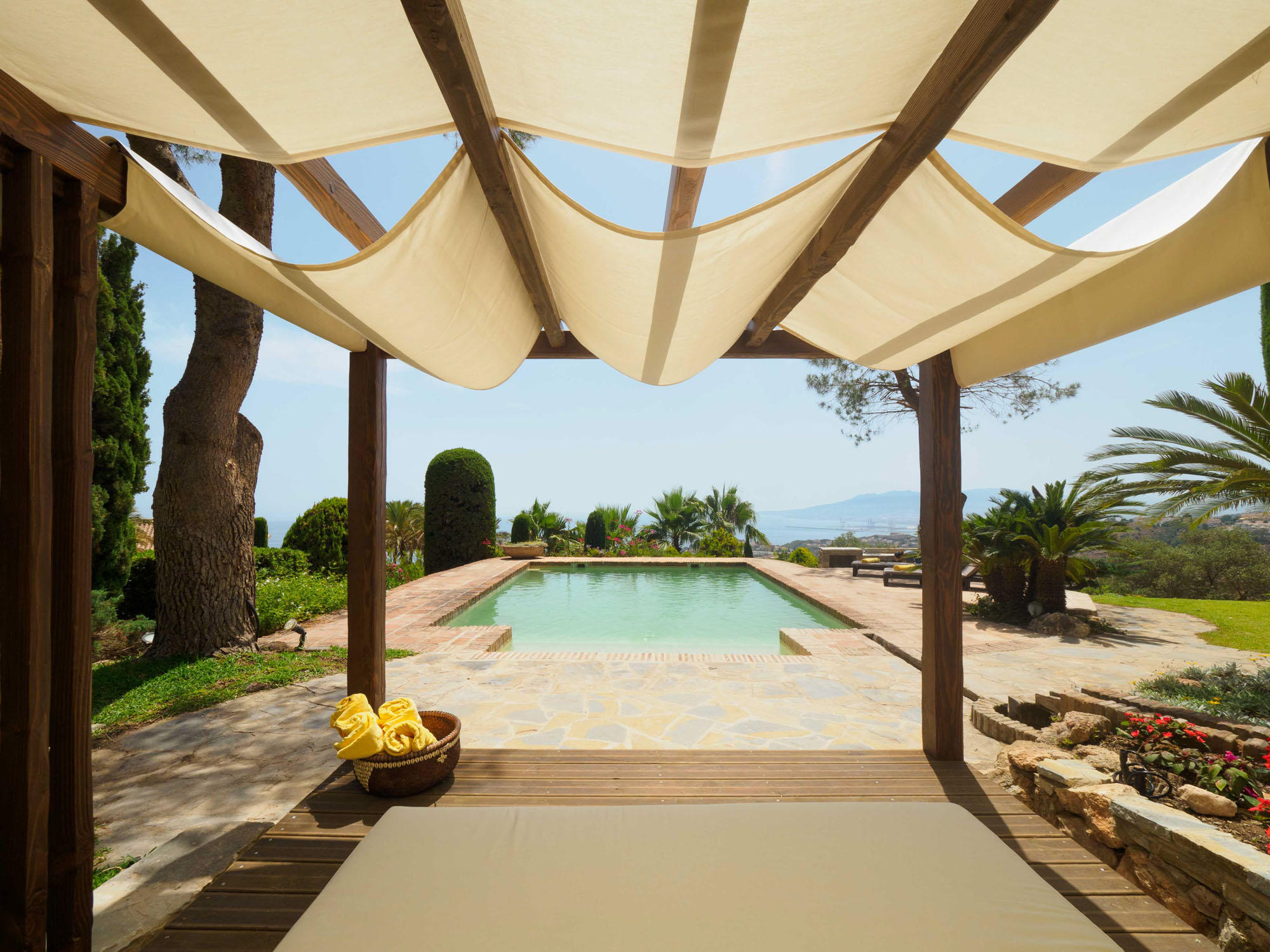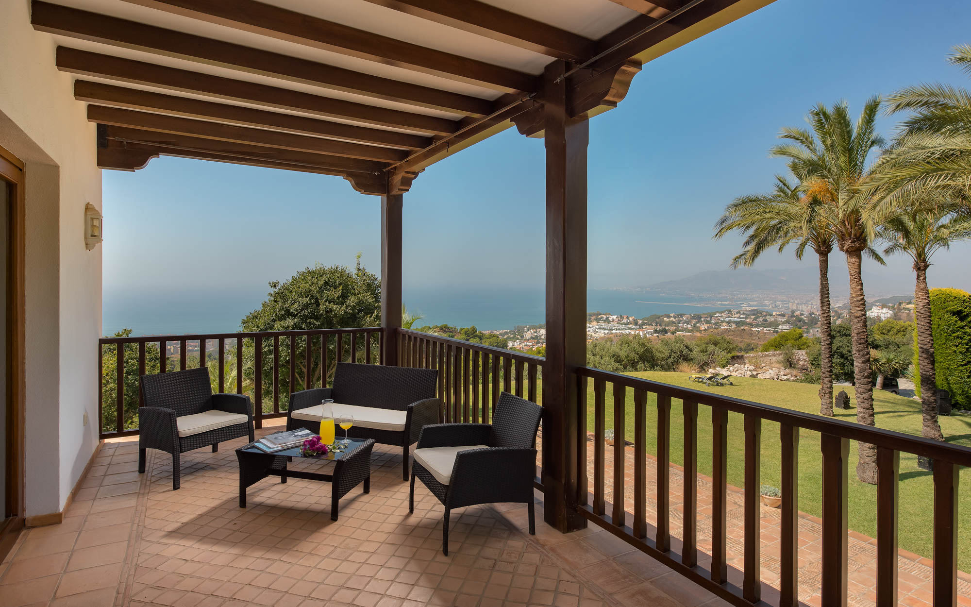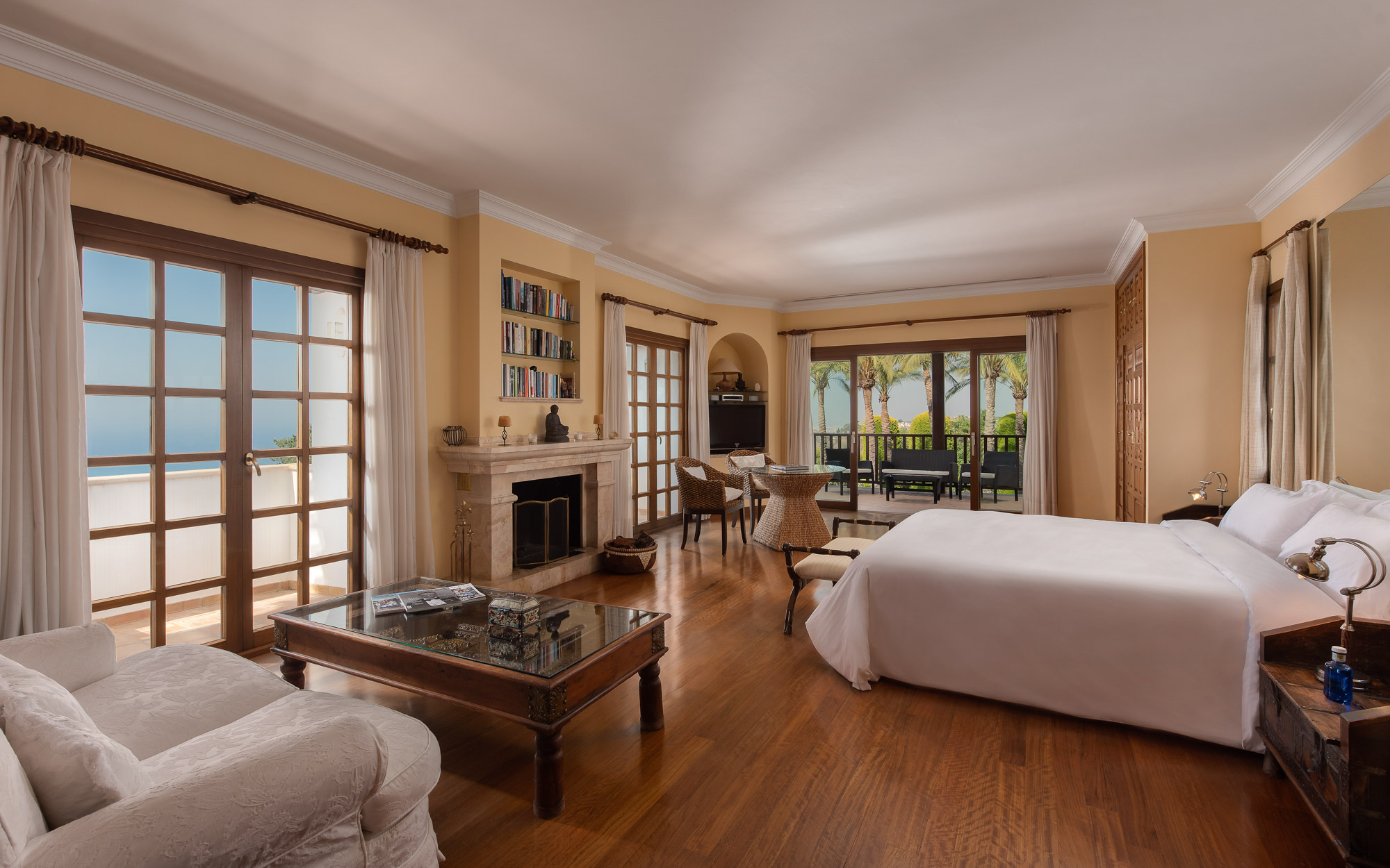 From the sofas, one can see either into the traditional Andalucian interior courtyard or out onto the rolling garden, edged by glimmering Mediterranean Sea.