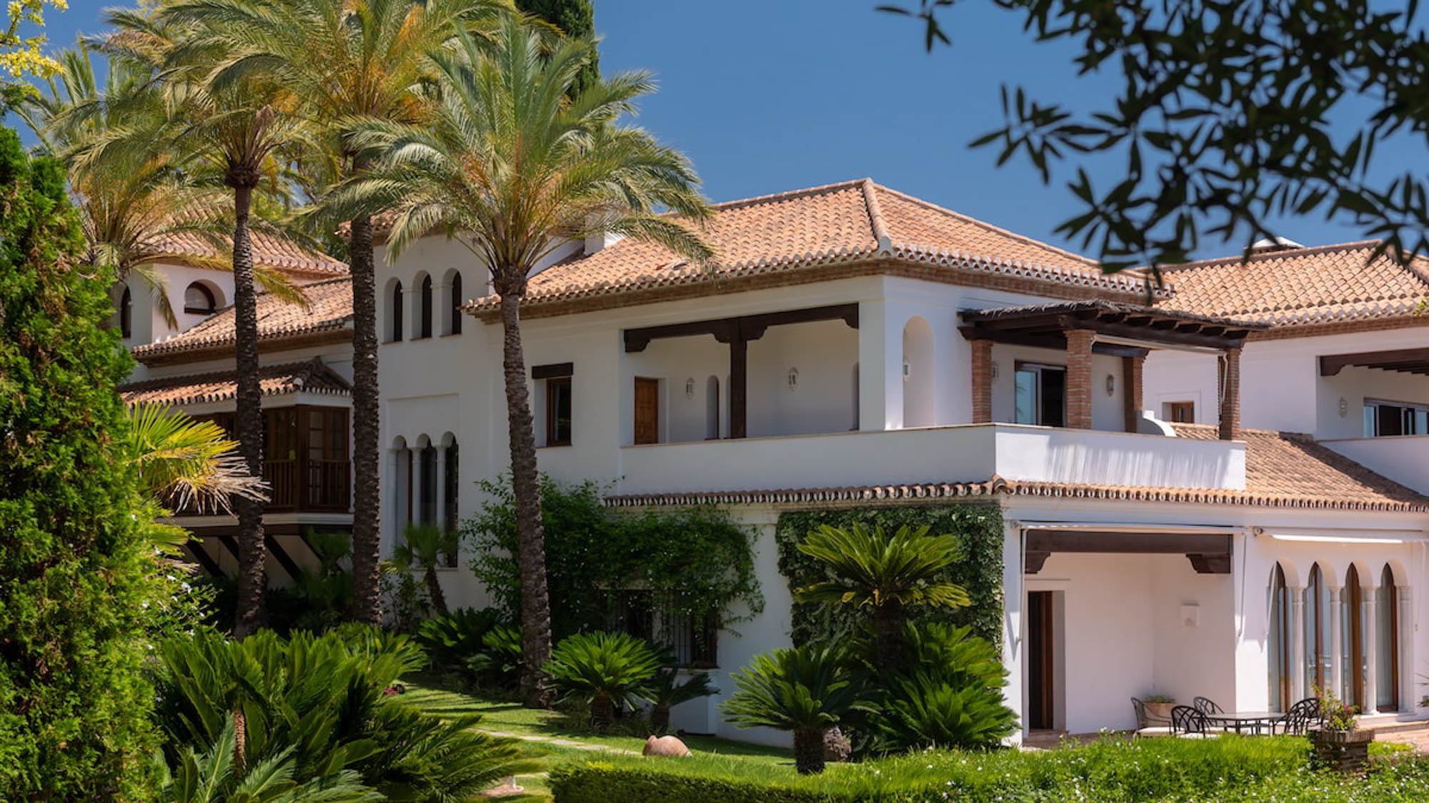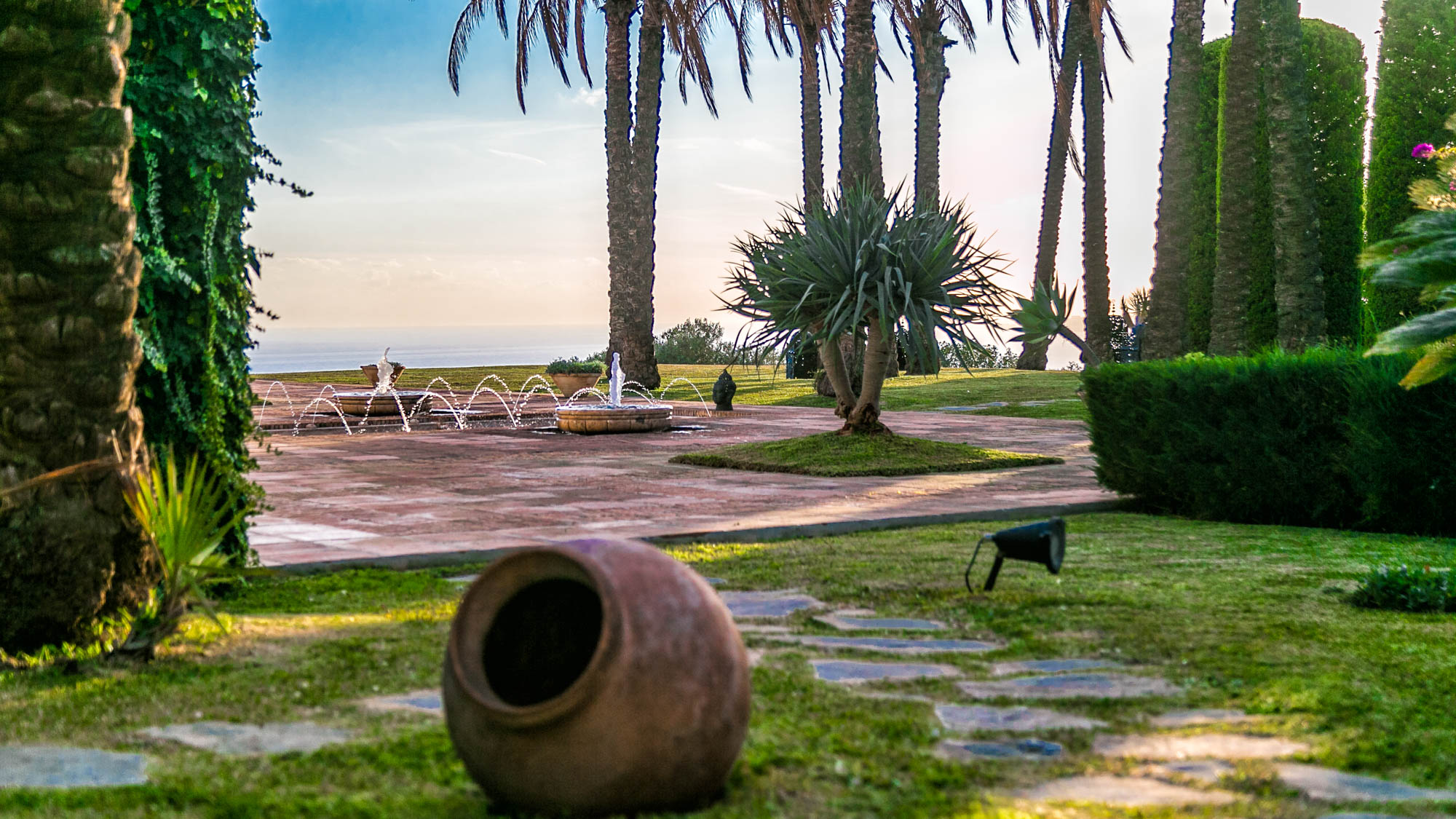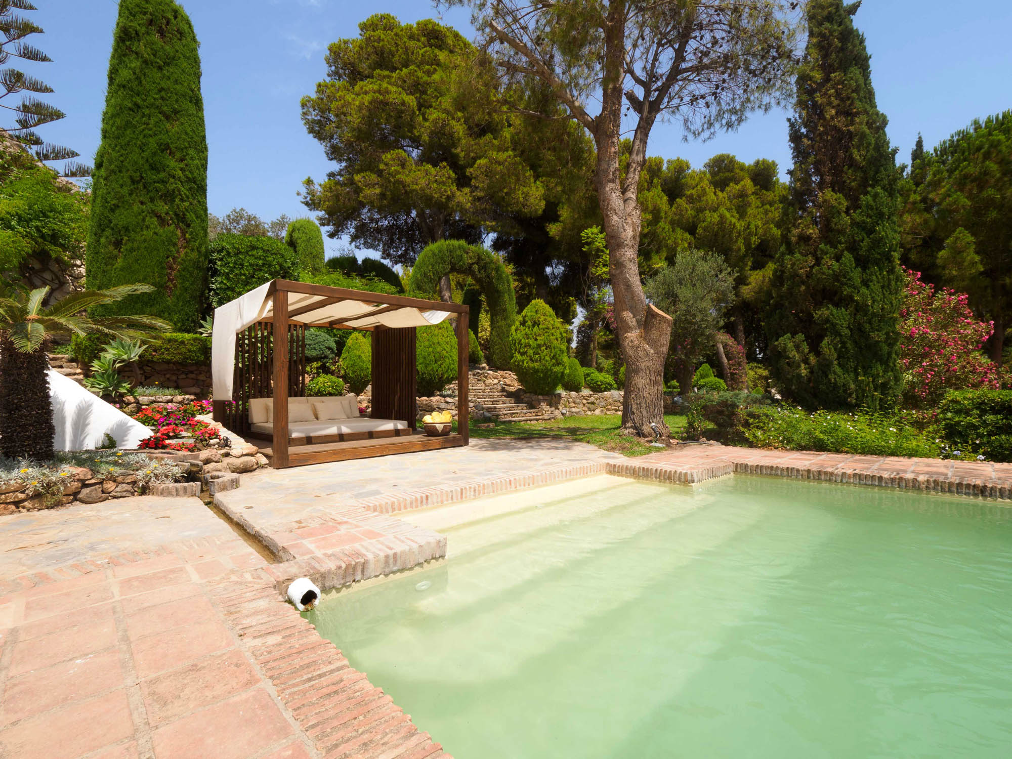 From the sofas, one can see either into the traditional Andalucian interior courtyard or out onto the rolling garden, edged by glimmering Mediterranean Sea.