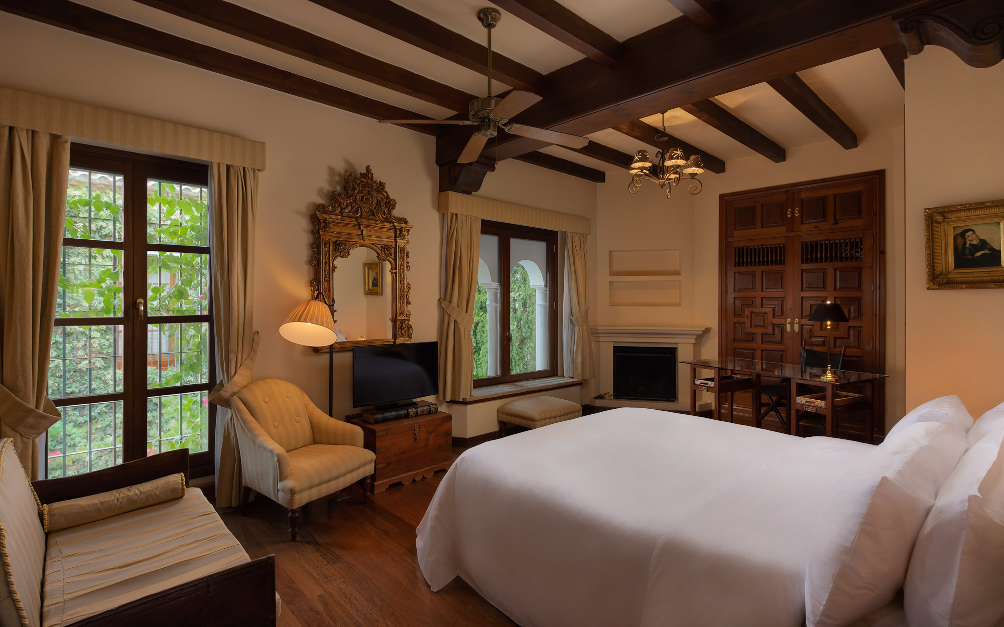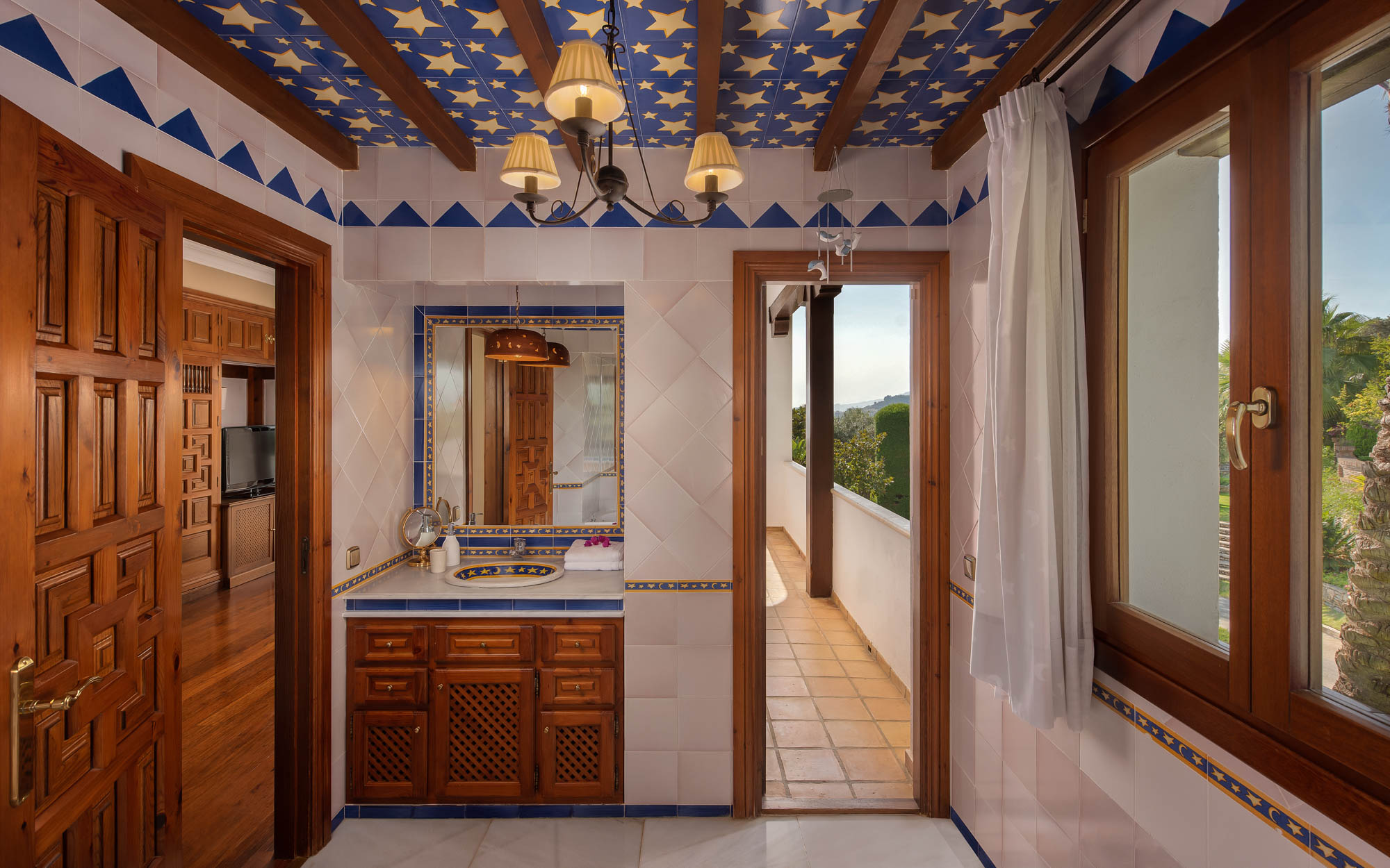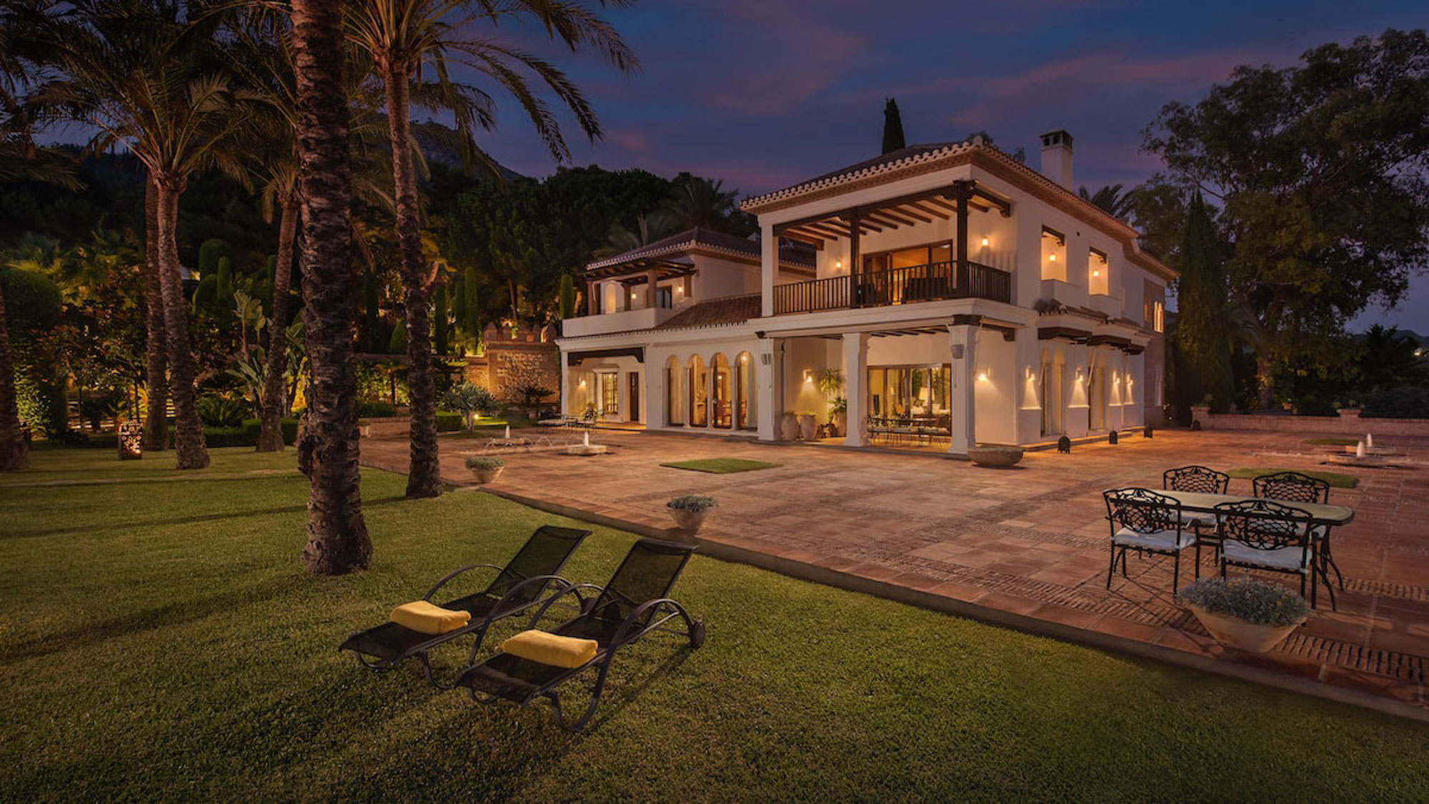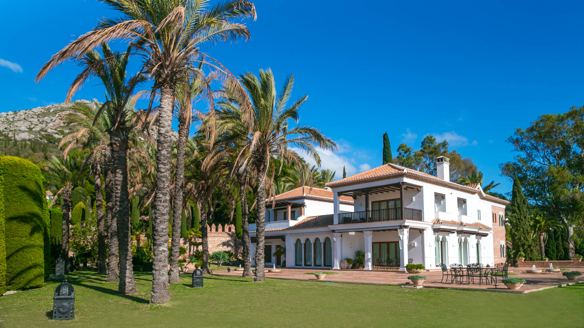 From the sofas, one can see either into the traditional Andalucian interior courtyard or out onto the rolling garden, edged by glimmering Mediterranean Sea.