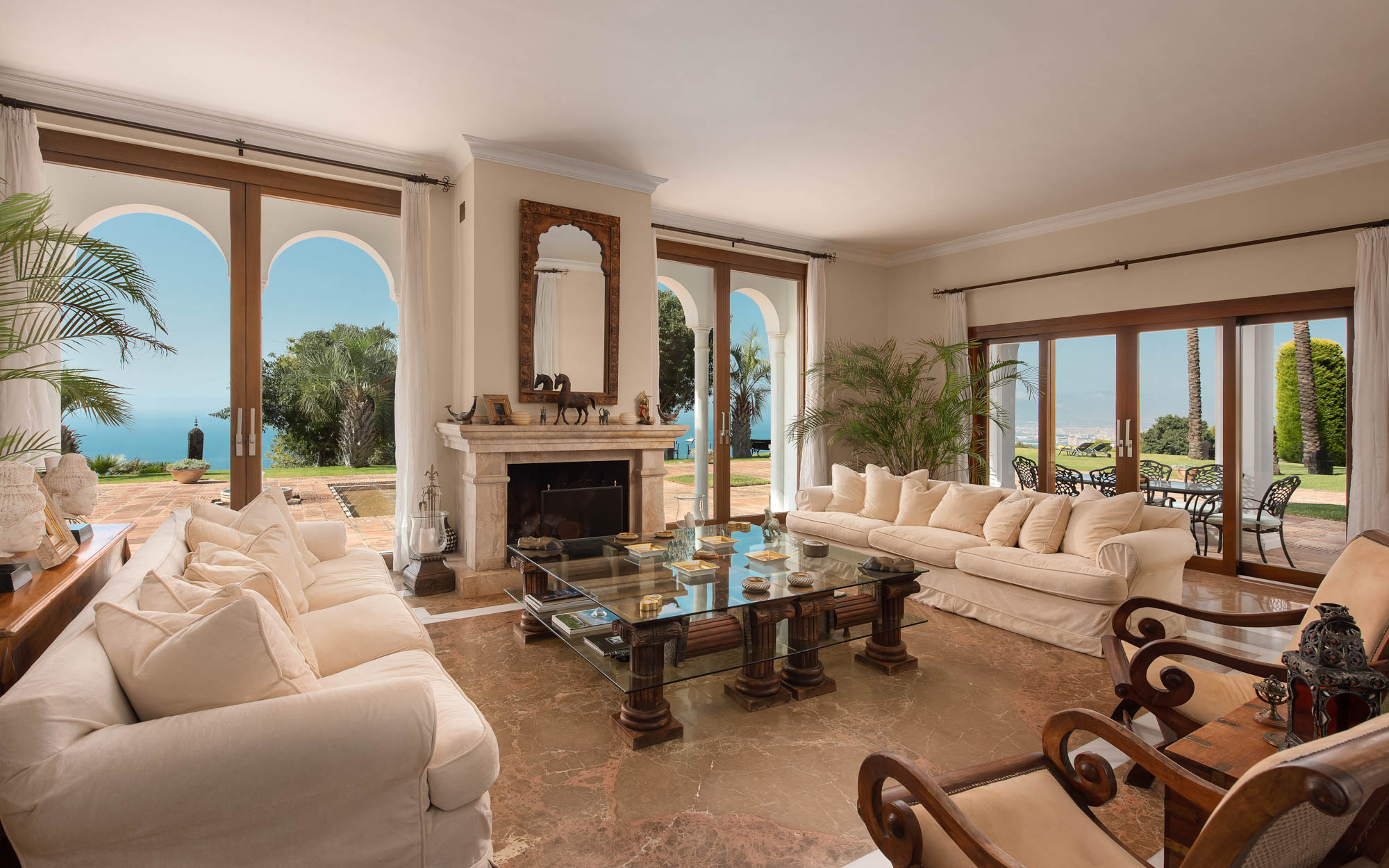 The living room is classical in style, with marble floors and a large open fireplace, an intricately carved wood and glass coffee table spread with books and trinkets. Two oversized, comfortable cream sofas are flanked by armchairs, making it a cosy space for family get together and pre-dinner cocktails.