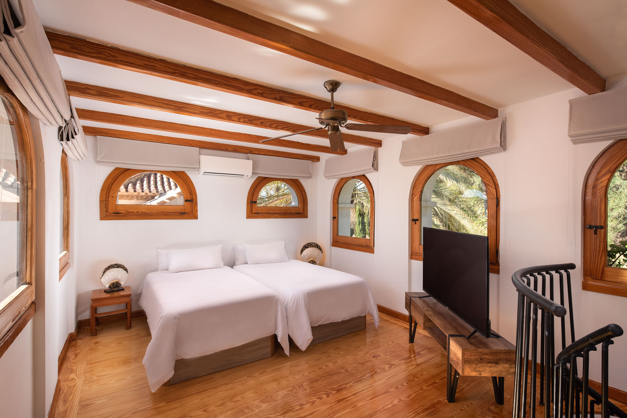 Guest Bedroom 5: Located on the mezzanine floor overlooking bedroom 4 in windowed turret with garden views. Accessed by spiral staircase. Wooden floors and beamed ceilings with fan. Garden views from all sides, flatscreen TV on wooden unit. Twin beds ideal for children.