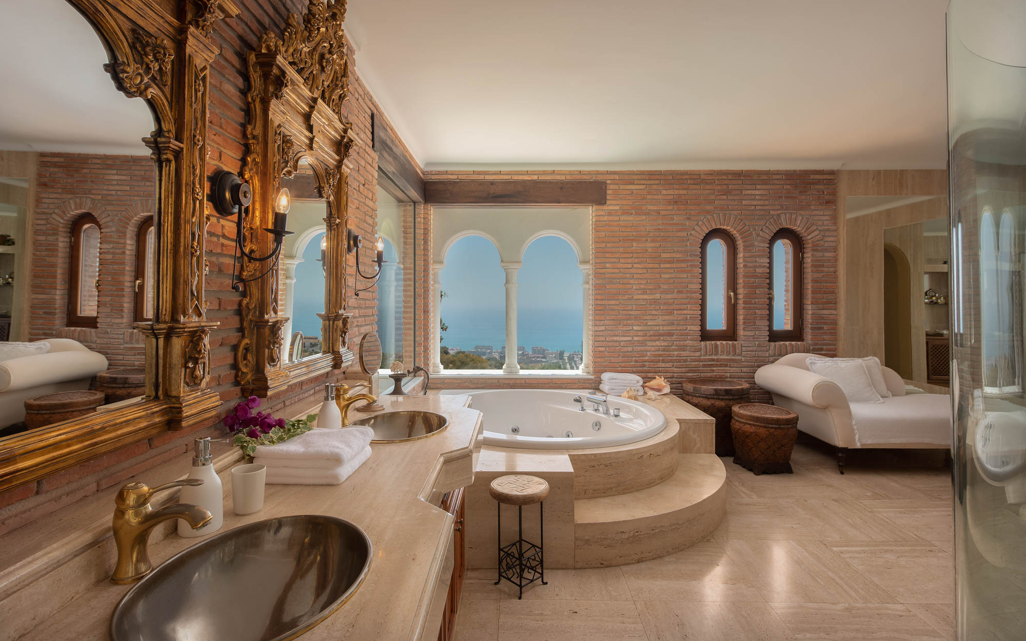 Bathroom 1: Spacious en-suite with marble finish, featuring a circular jacuzzi tub with hydro jets and sea/garden views, cream chaise-lounge and free-standing walk-in shower