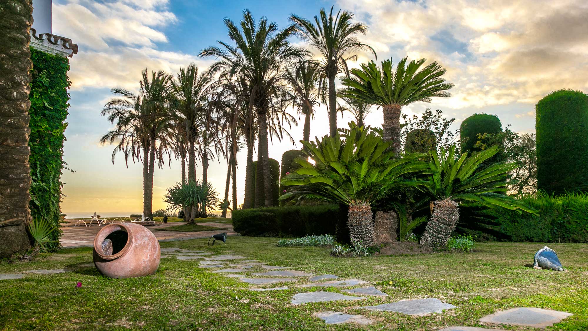 Despite the stateliness of its rooms, the interiors of Hacienda El Palacito retain a homely feel, thanks in part to an abundance of natural light. The ground floor is edged by walls of windows, framing within them far-reaching views of impeccable lawns, soaring palm trees and fountains, all set against a backdrop of dense blue Mediterranean Sea and sky.