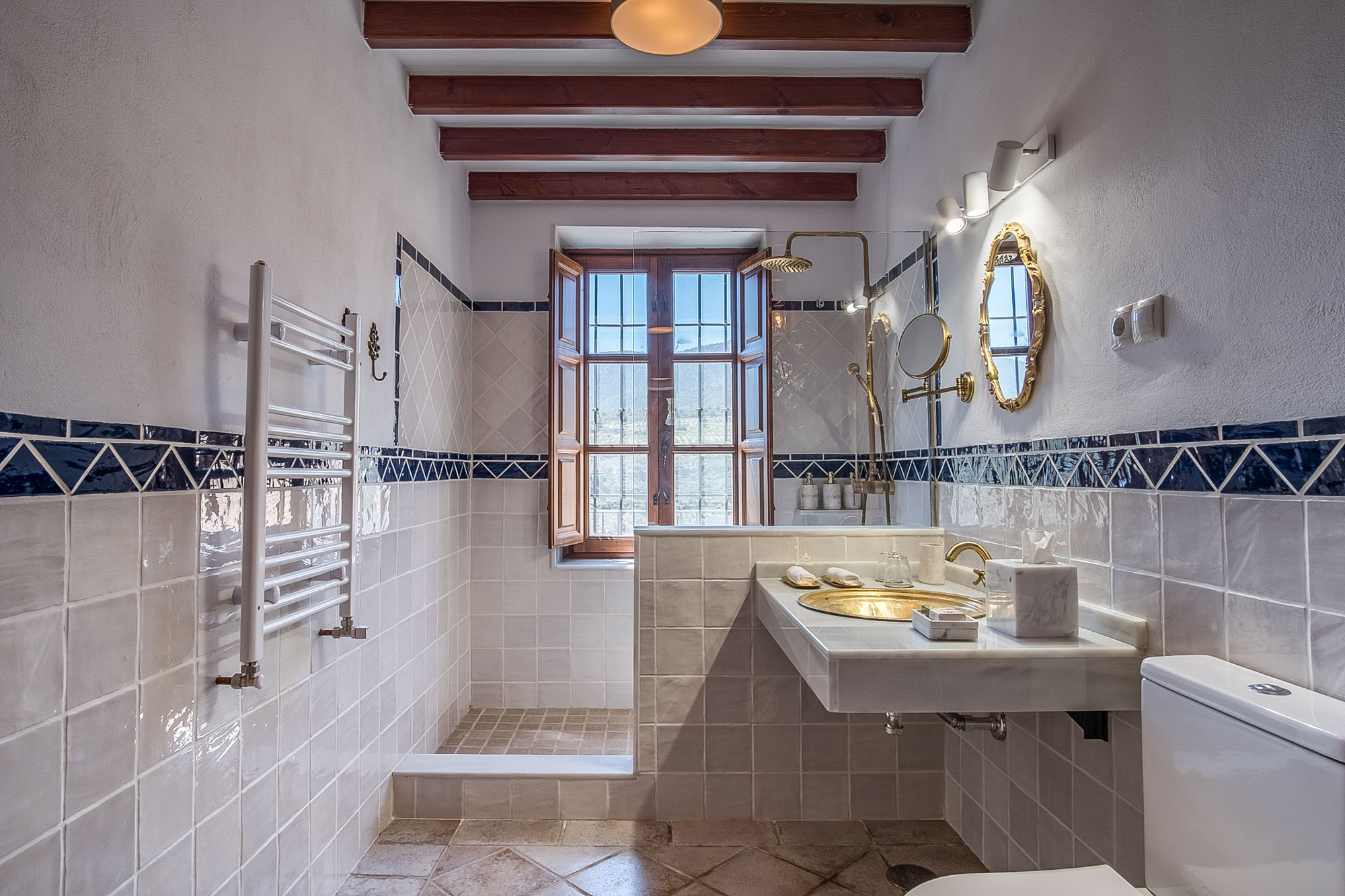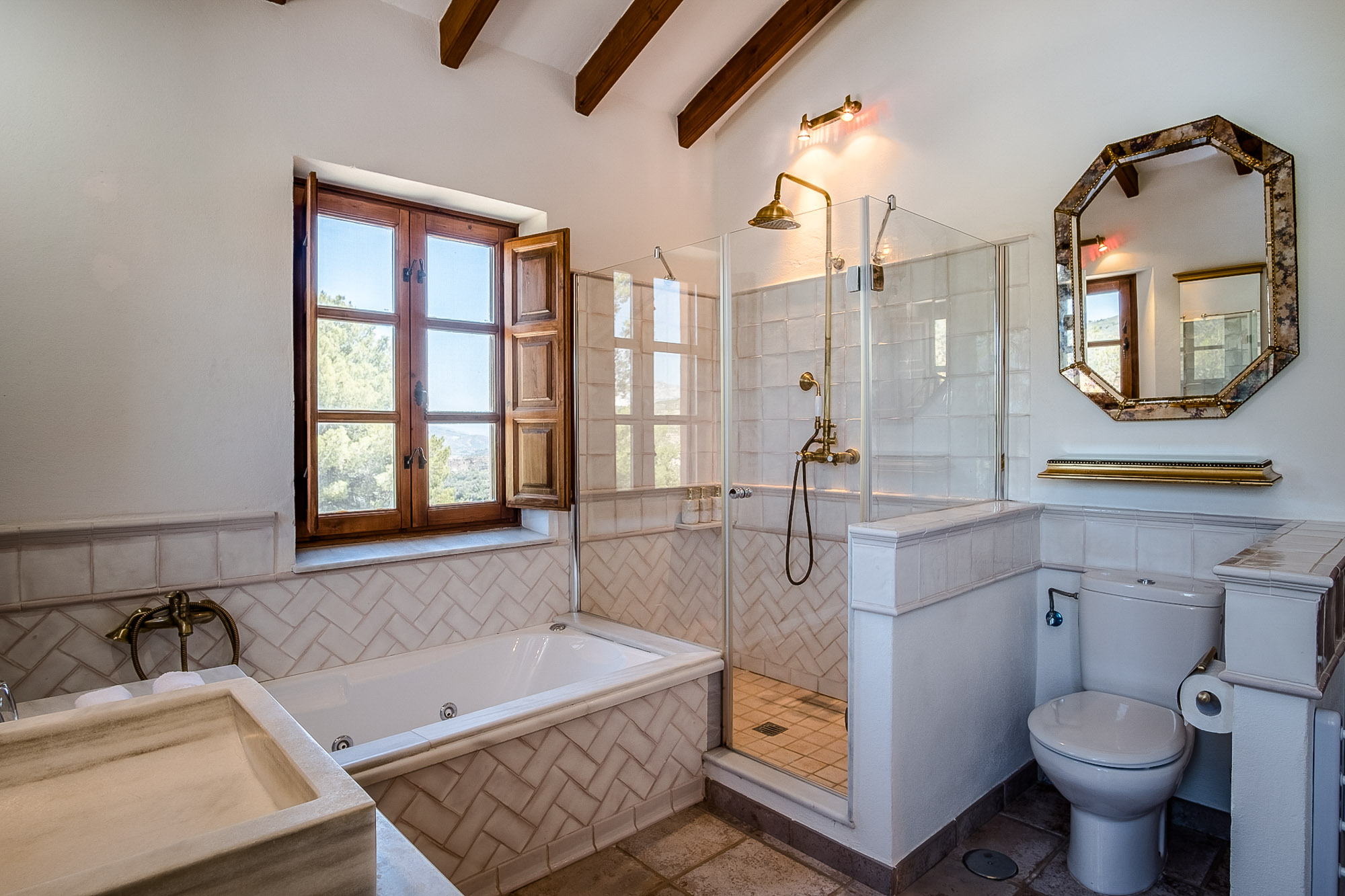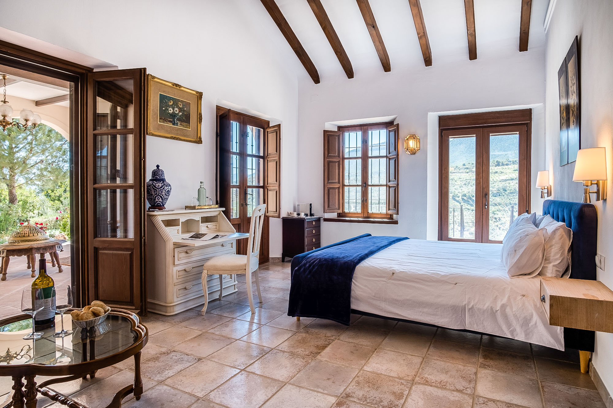 Bedroom 4: Also on the ground floor it has a king-size bed (150x200cm), seating area with a comfy sofa, chaise longue and writing desk. Private terrace with table and chairs and views over the valley. Tiled en-suite bathroom with bathtub and over-tub shower and marble sinks. Large window with traditional wooden shutters and countryside views.