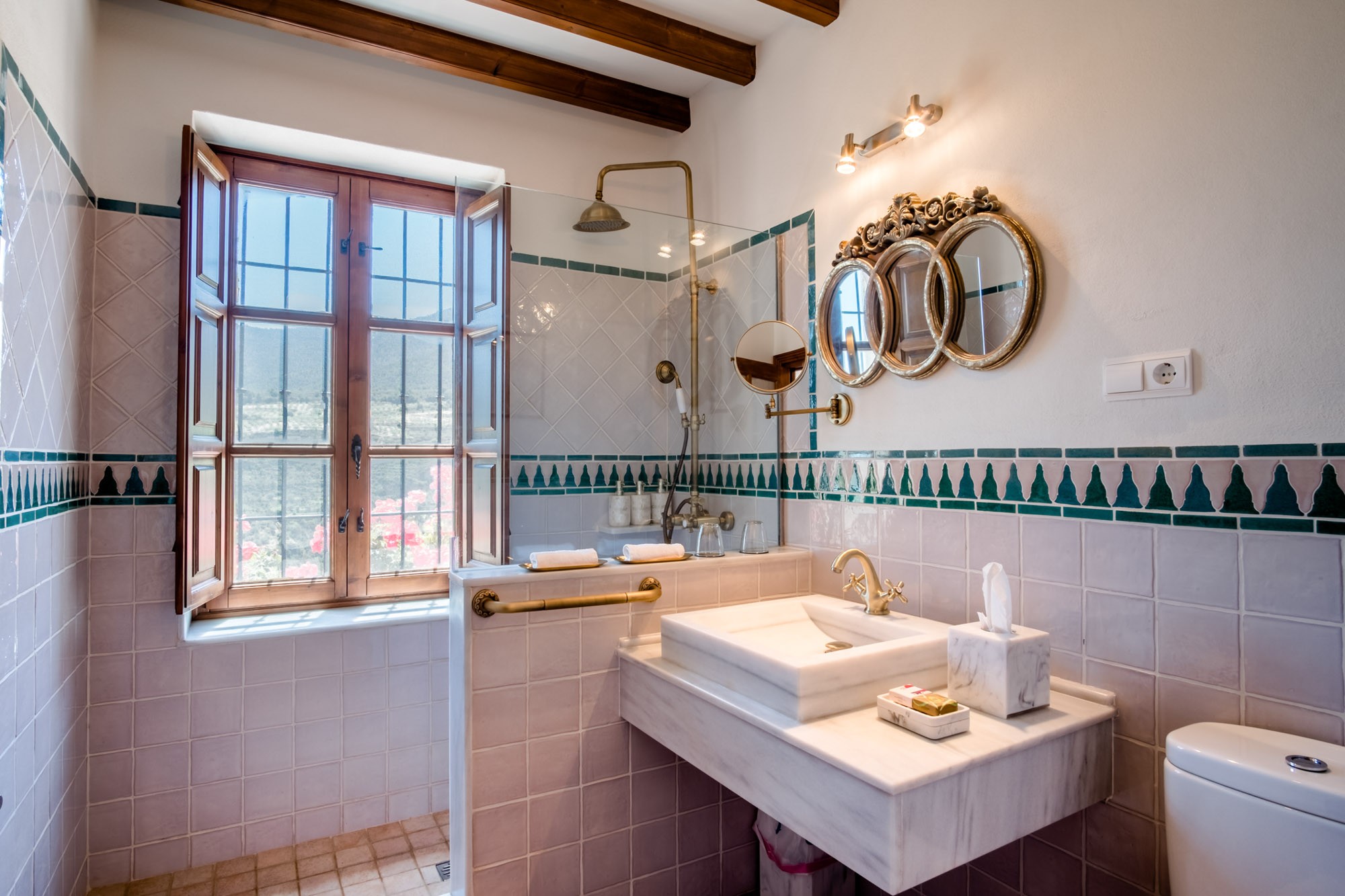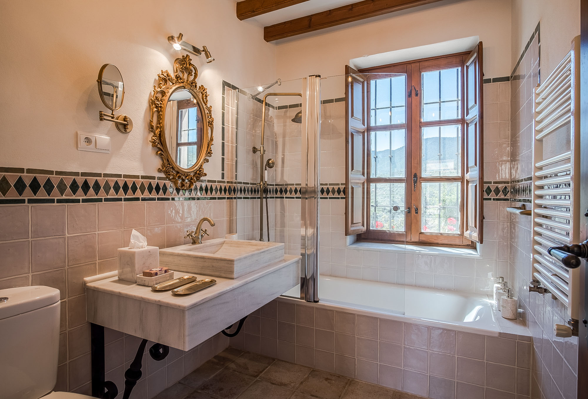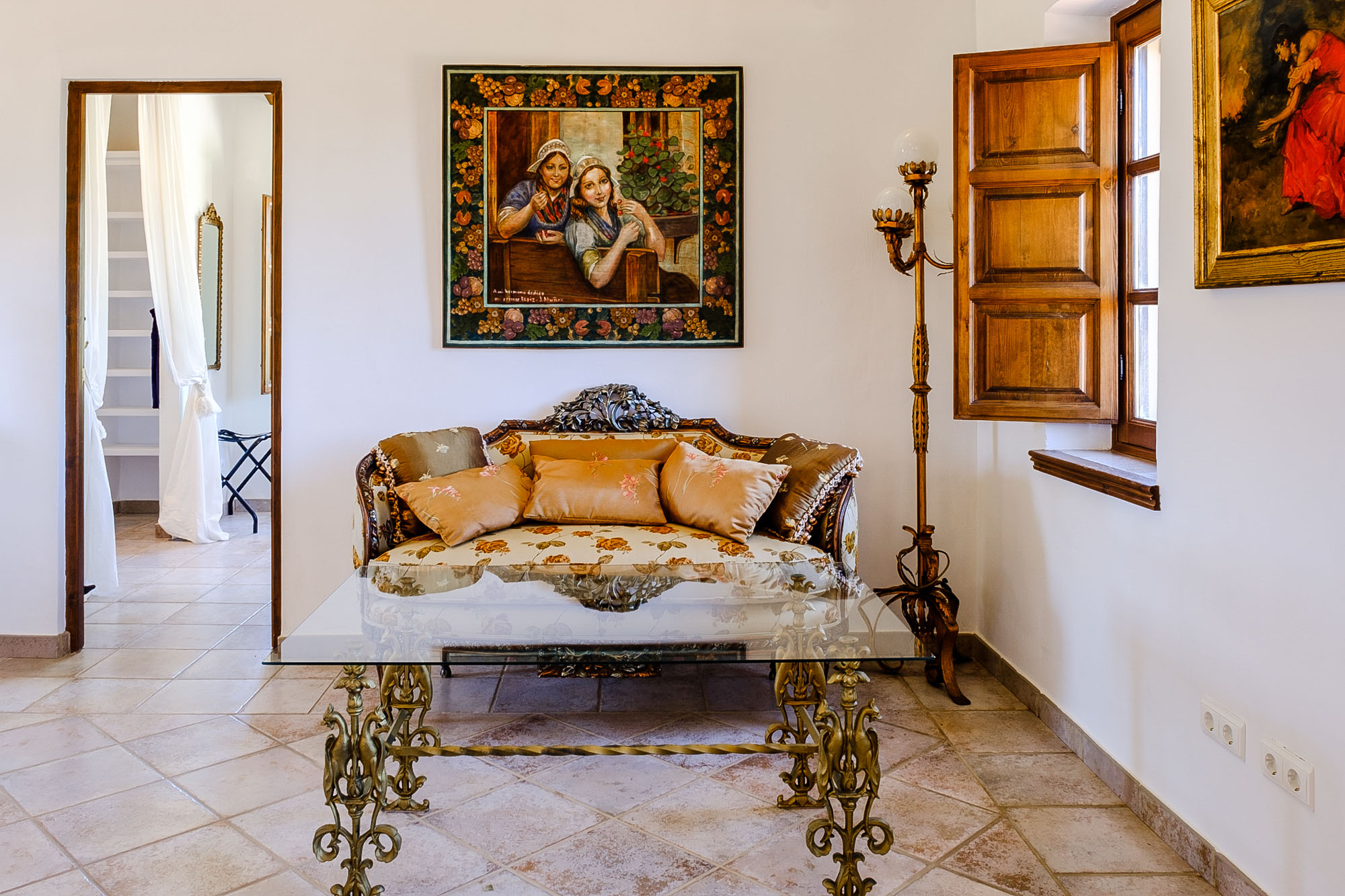 Bedroom 4: Also on the ground floor it has a king-size bed (150x200cm), seating area with a comfy sofa, chaise longue and writing desk. Private terrace with table and chairs and views over the valley. Tiled en-suite bathroom with bathtub and over-tub shower and marble sinks. Large window with traditional wooden shutters and countryside views.