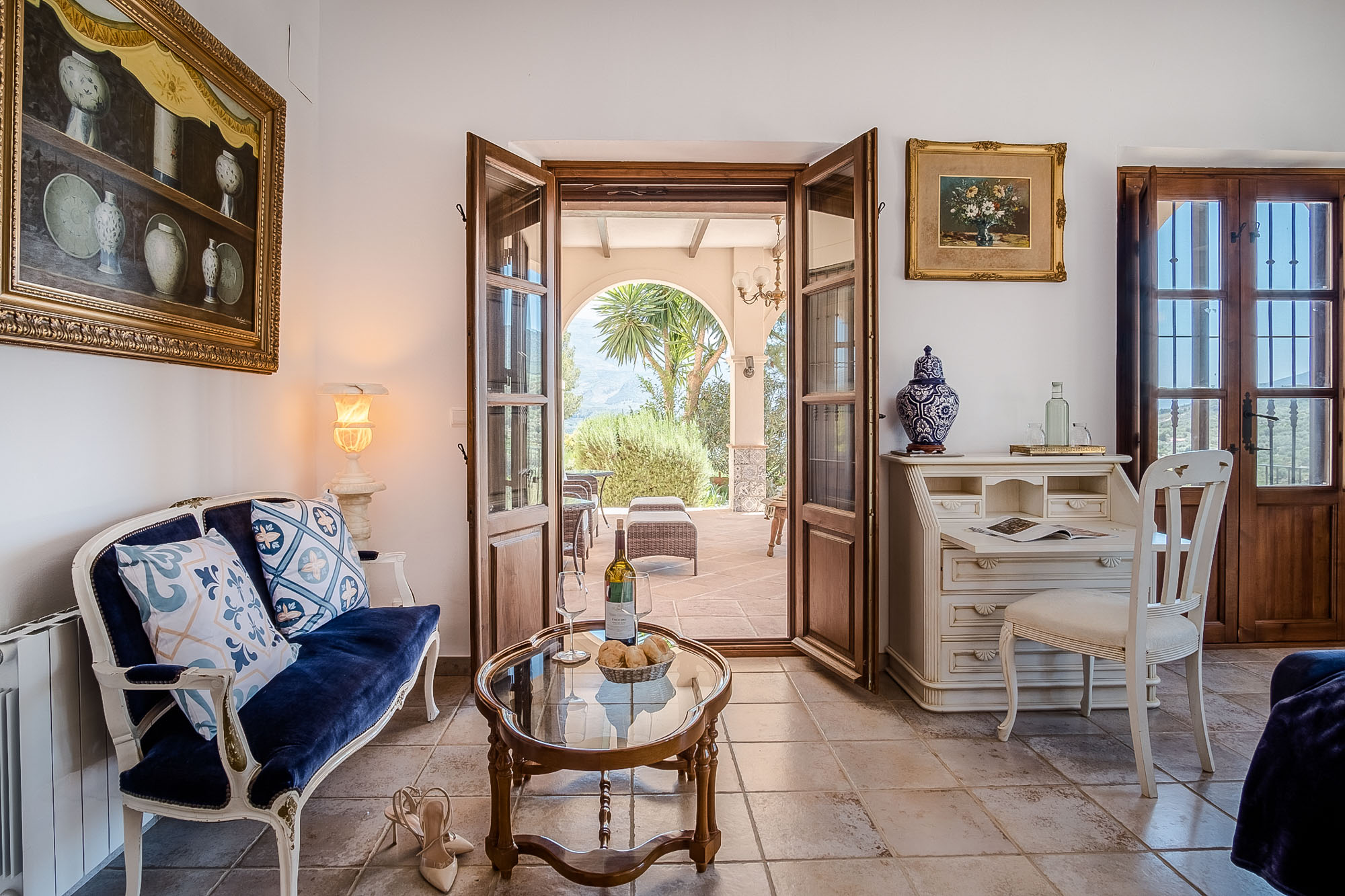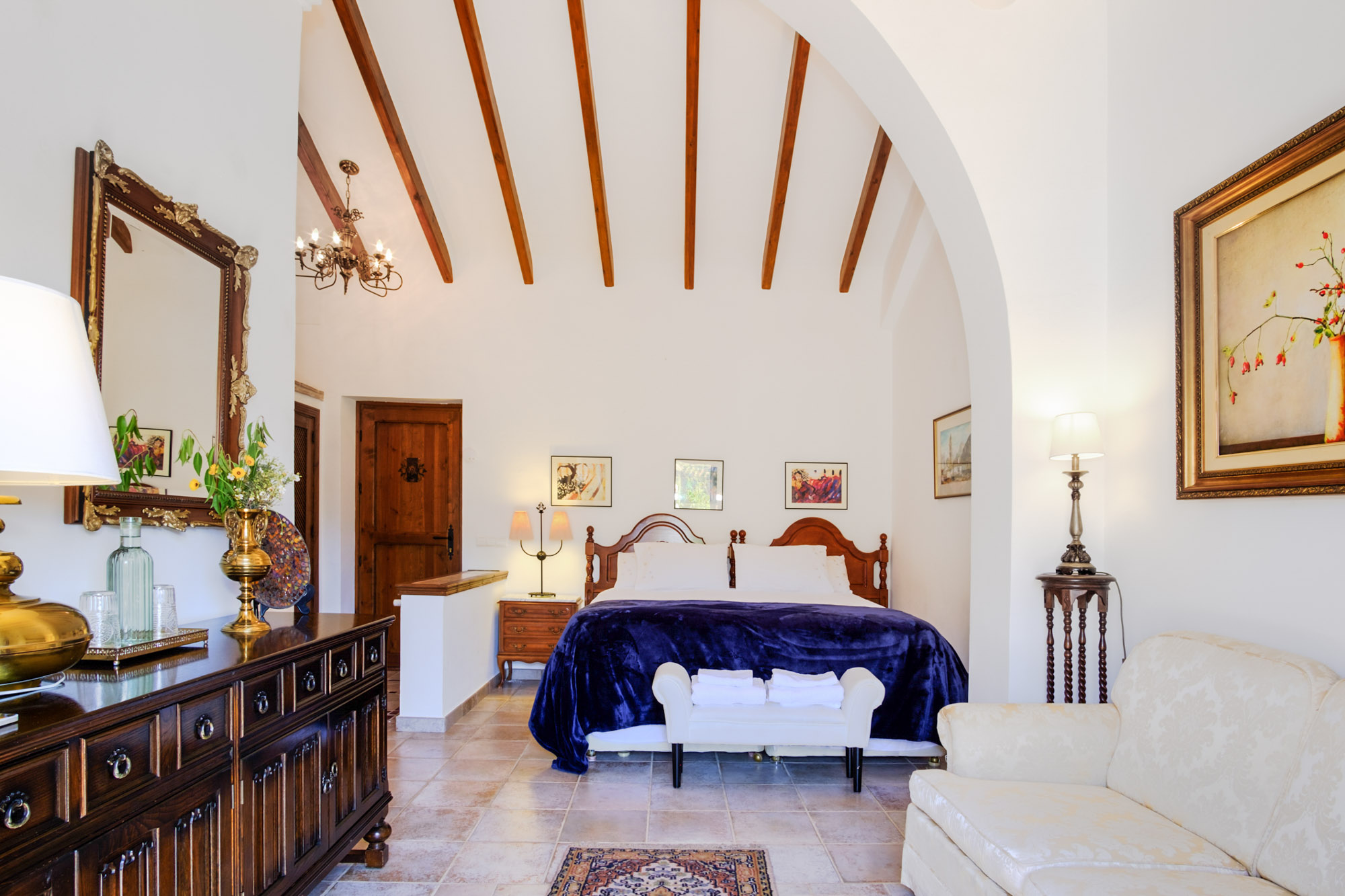 Bedroom 6: Large bedroom off main courtyard featuring a king-size bed (180x200cm) with ornate metal headboards (which can be split to form two twin beds). Seating area with blue upholstered sofas and armchair, glass coffee table and French windows leading out onto a private courtyard. The en-suite bathroom is wheelchair adapted with a spacious walk-in shower.