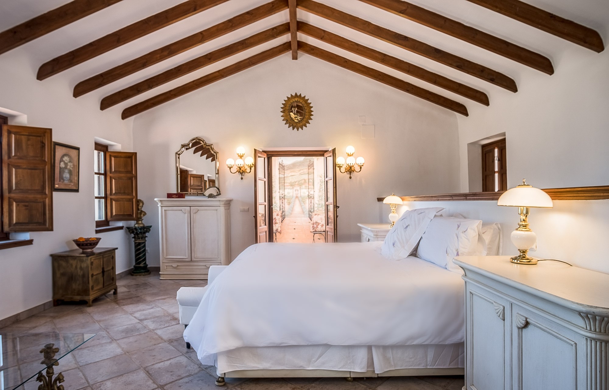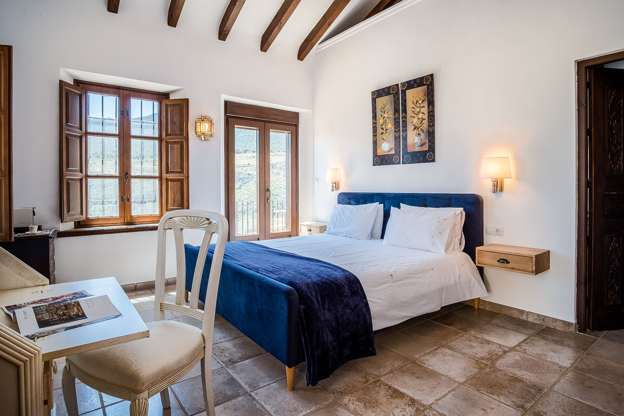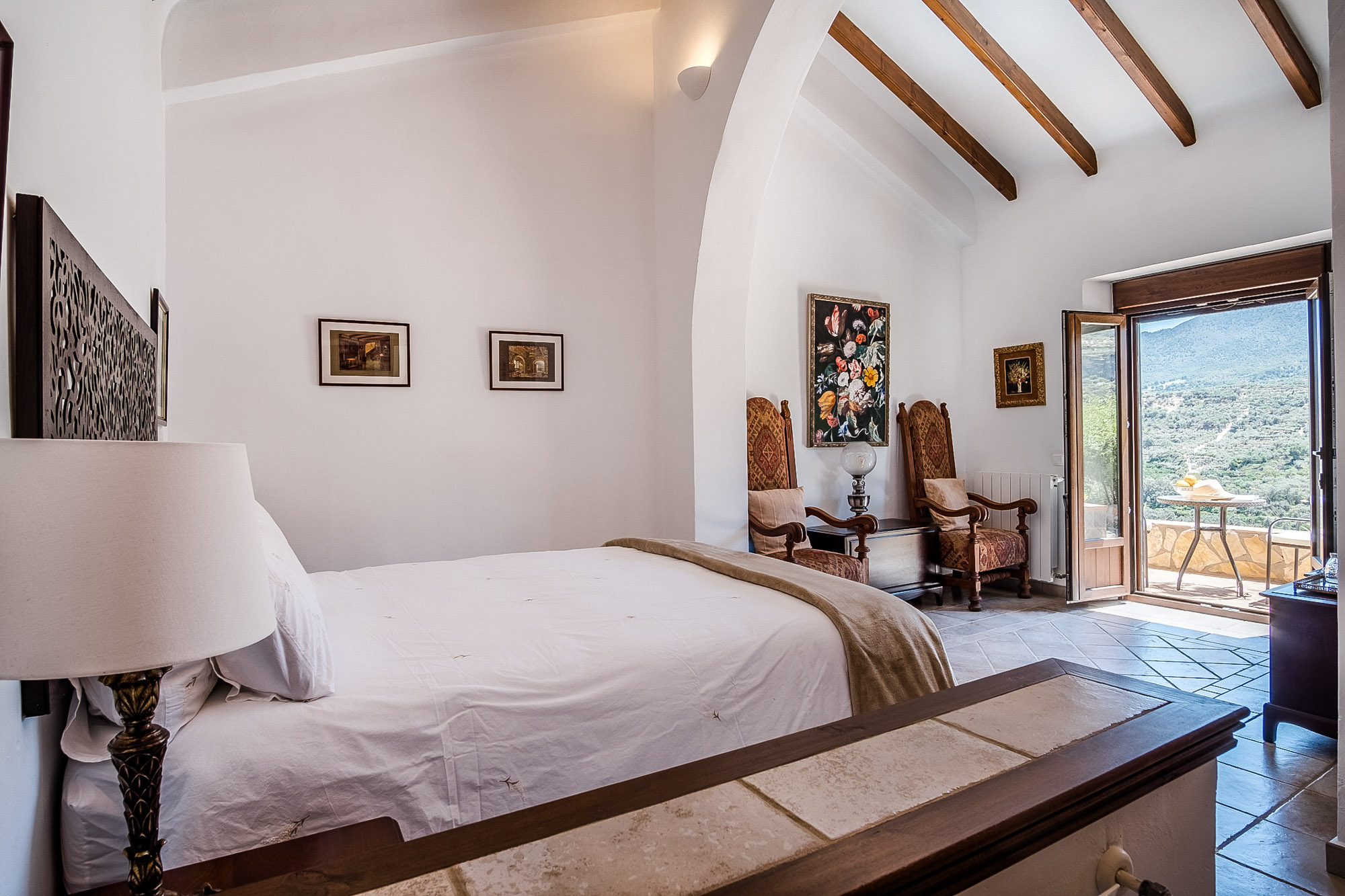 Bedroom 1: Principal suite on the first floor with king-sized bed (150x200cm), en-suite bathroom with Juliet balcony, bath and separate shower. There’s also a dressing area and a huge private dual aspect terrace with mountain and valley views, seating area and access to the bell tower overlooking the central courtyard.
