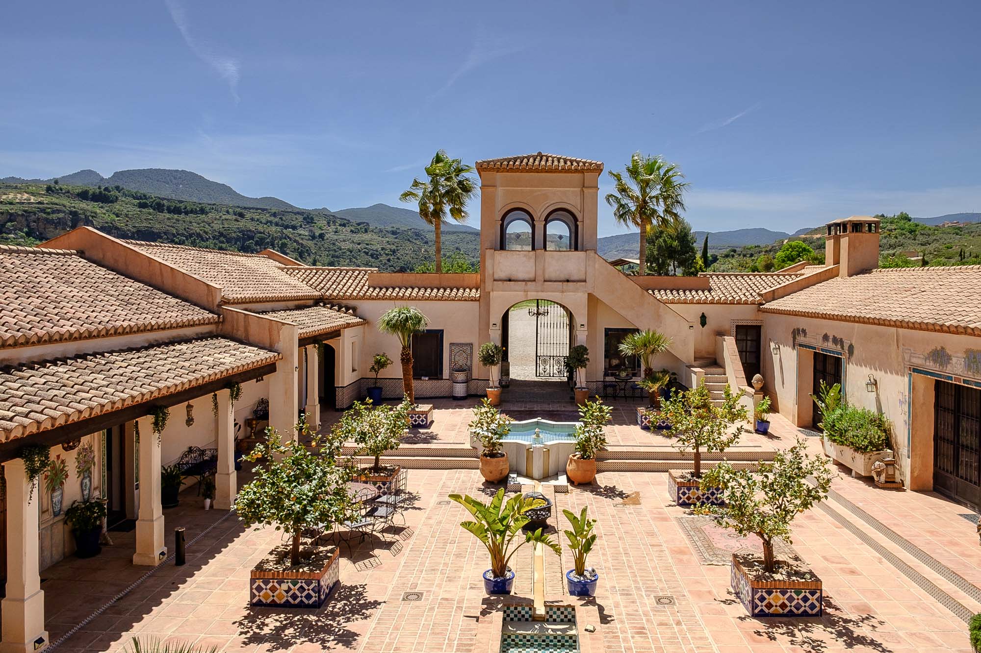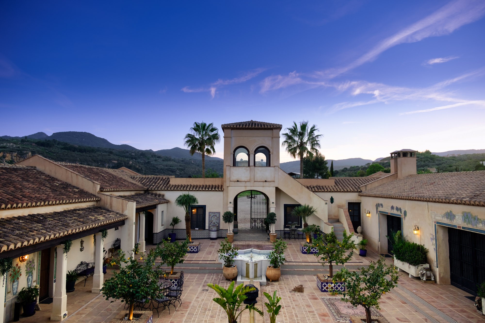 - Central courtyard with fountain and seating