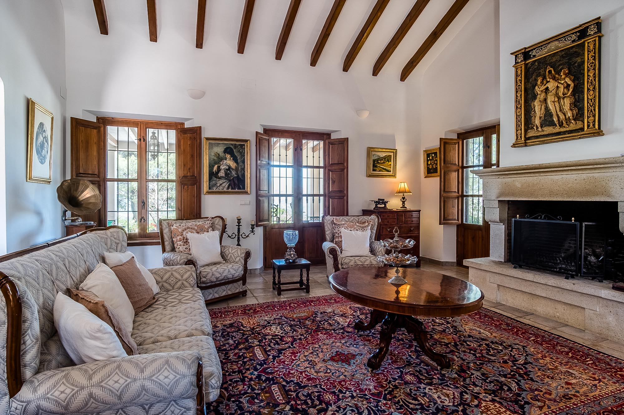 For the winter, the formal living room located off the courtyard has a grand piano, dining table, desk and comfy seating round an open fire. There’s also a chess set and gramophone in this area.
