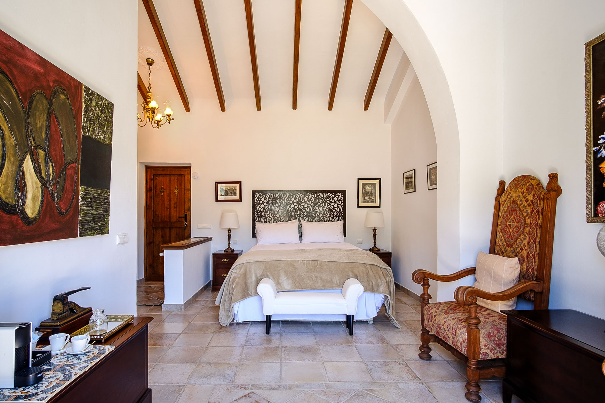Bedroom 2: The junior suite is on the ground floor with king-size bed (150x200cm), en-suite bathroom, seating area and covered terrace with comfortable seating. There’s a neutral colour palette of creams and whites and high, vaulted ceiling in all the bedrooms. There’s a desk and Nespresso coffee machine too.