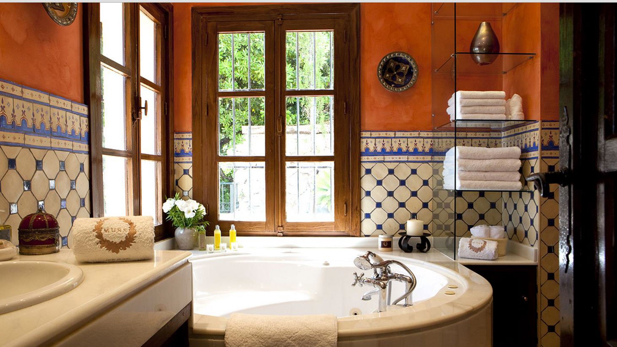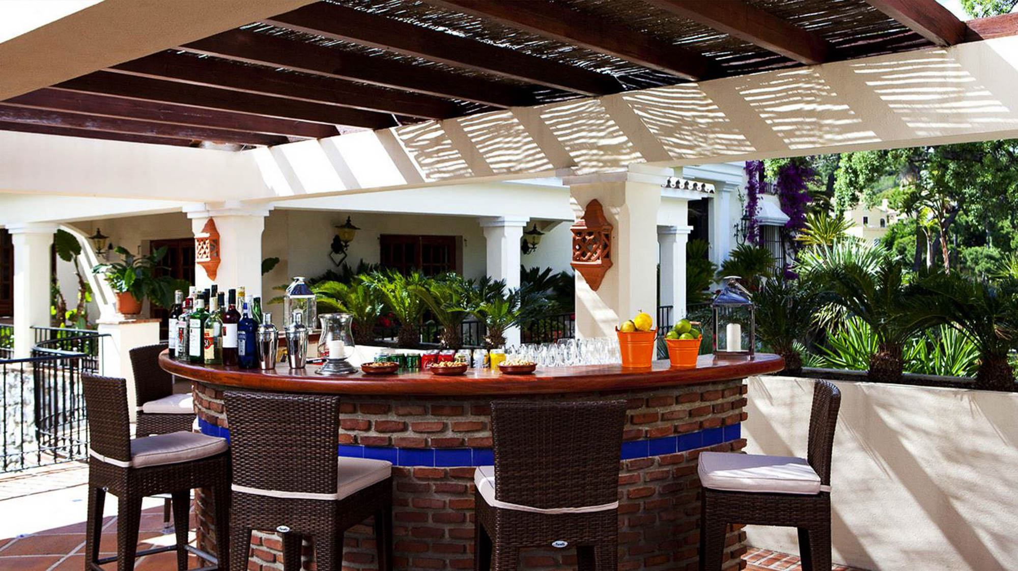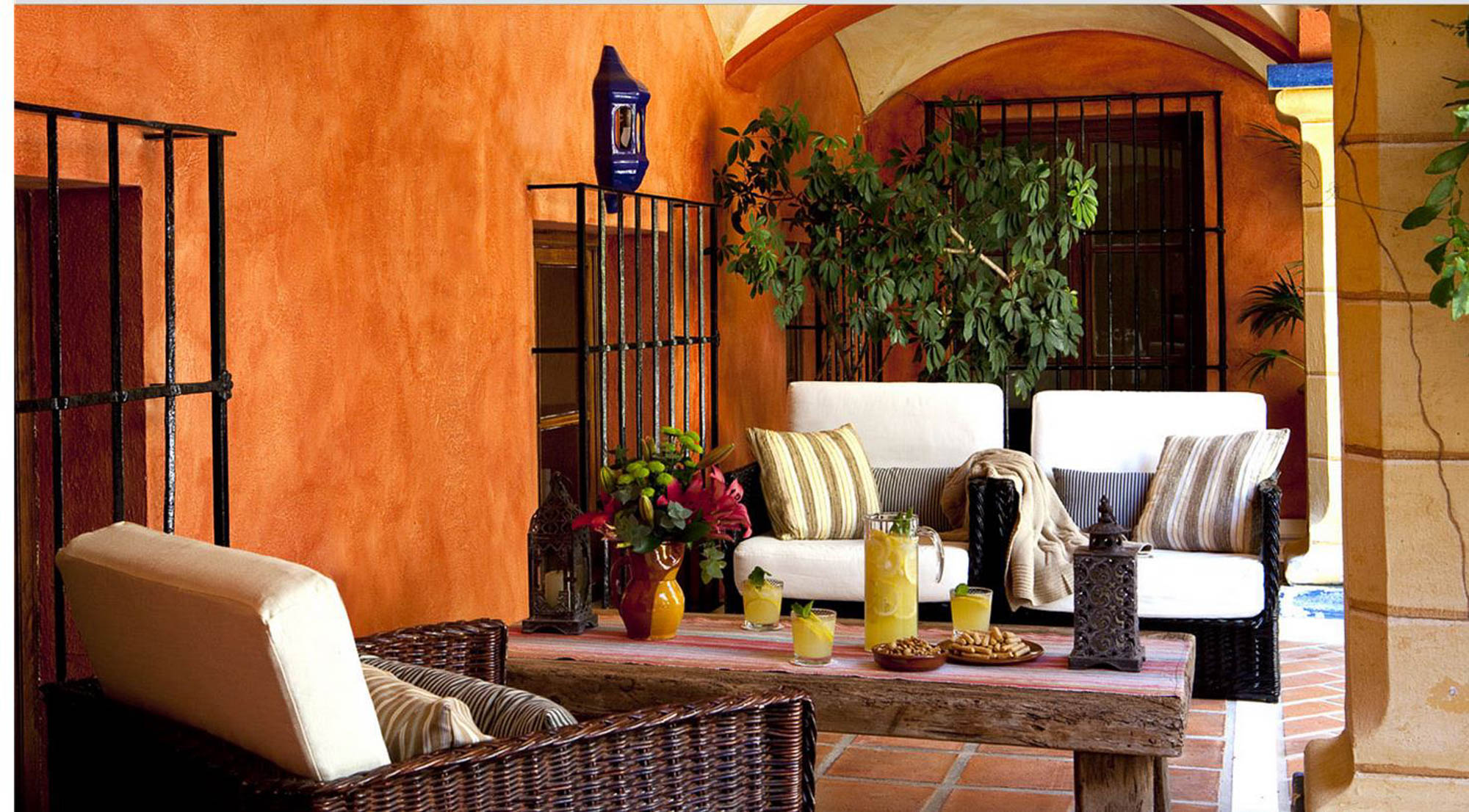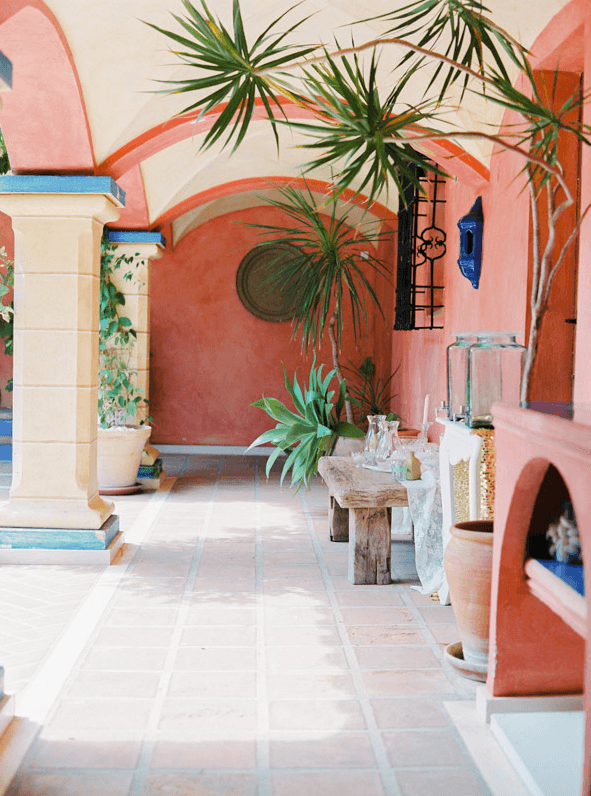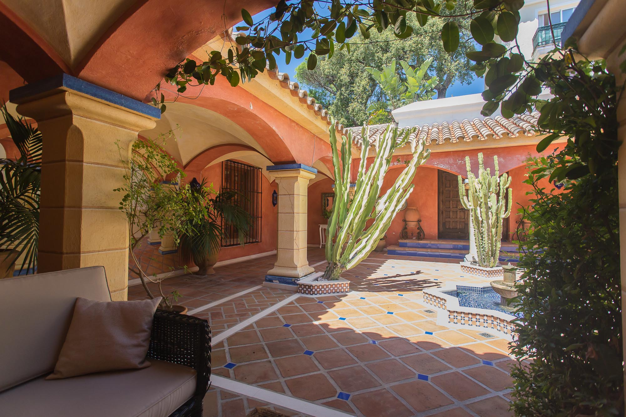 Beyond that lays a formal dining room, the main kitchen, a small bodega, and eventually you come to the beating heart of the house; A cool central patio that embraces Moorish traditions, bordered by archways, hand painted decorative ceramics, and finished in varying hues of terracotta reds, oranges, and rich blues inspired by the Mediterranean Sea.