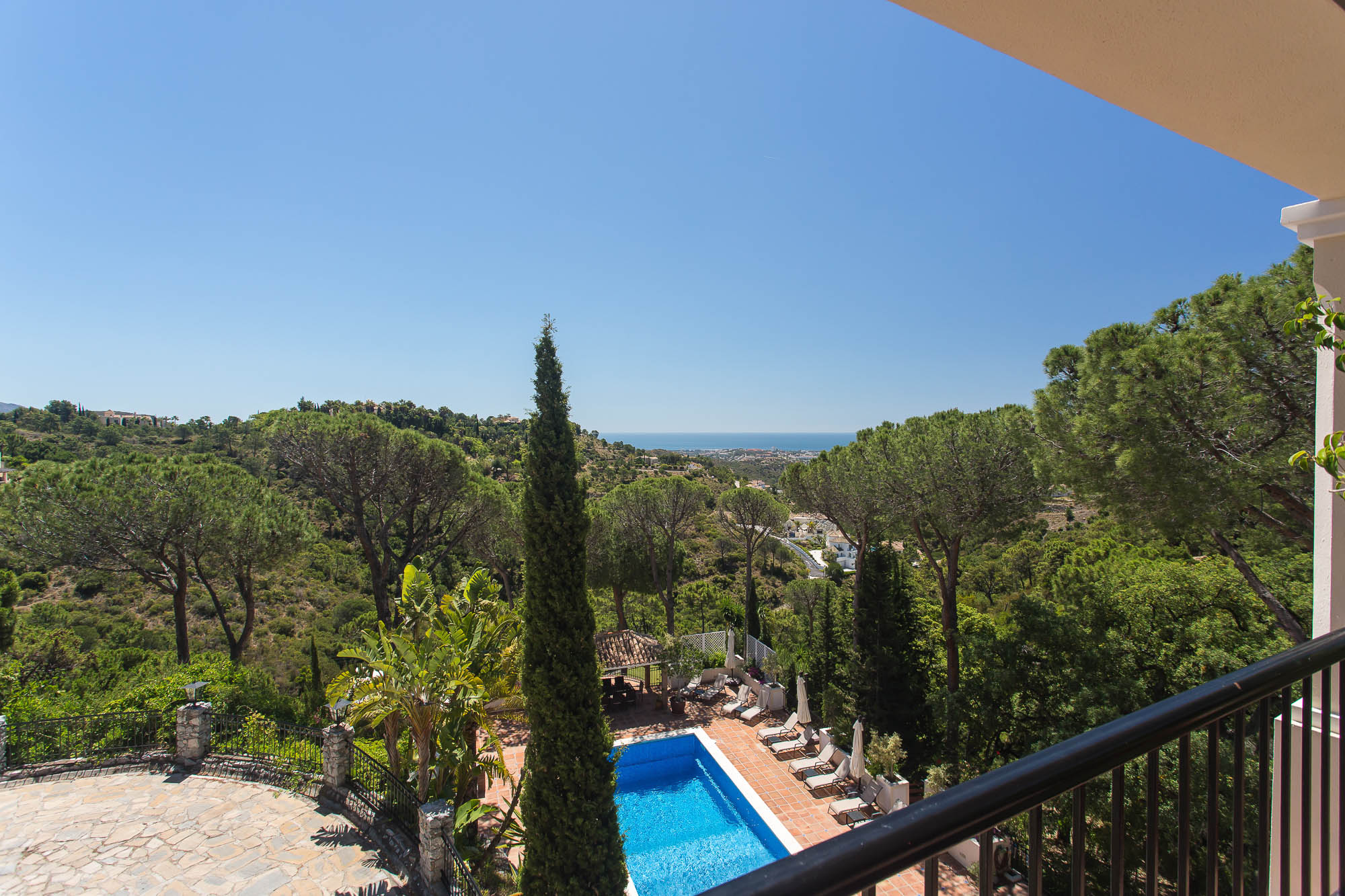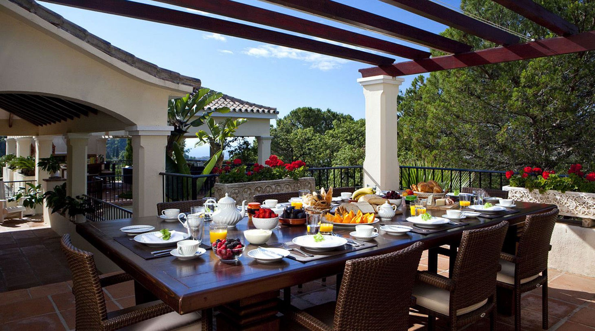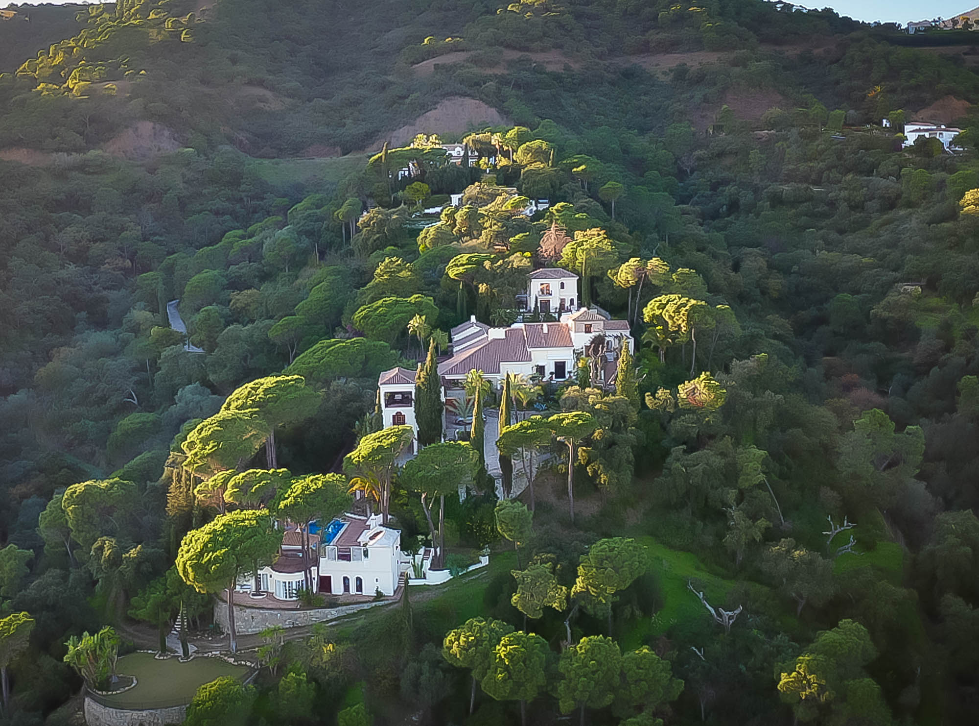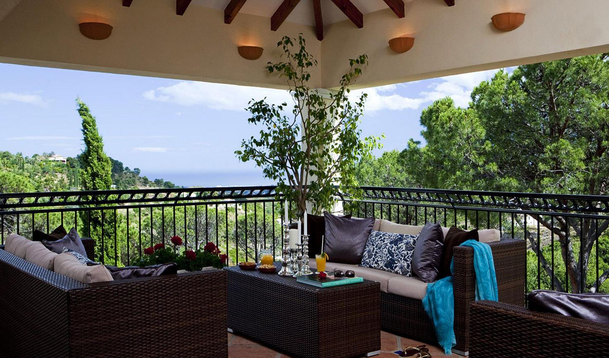 Beyond that lays a formal dining room, the main kitchen, a small bodega, and eventually you come to the beating heart of the house; A cool central patio that embraces Moorish traditions, bordered by archways, hand painted decorative ceramics, and finished in varying hues of terracotta reds, oranges, and rich blues inspired by the Mediterranean Sea.