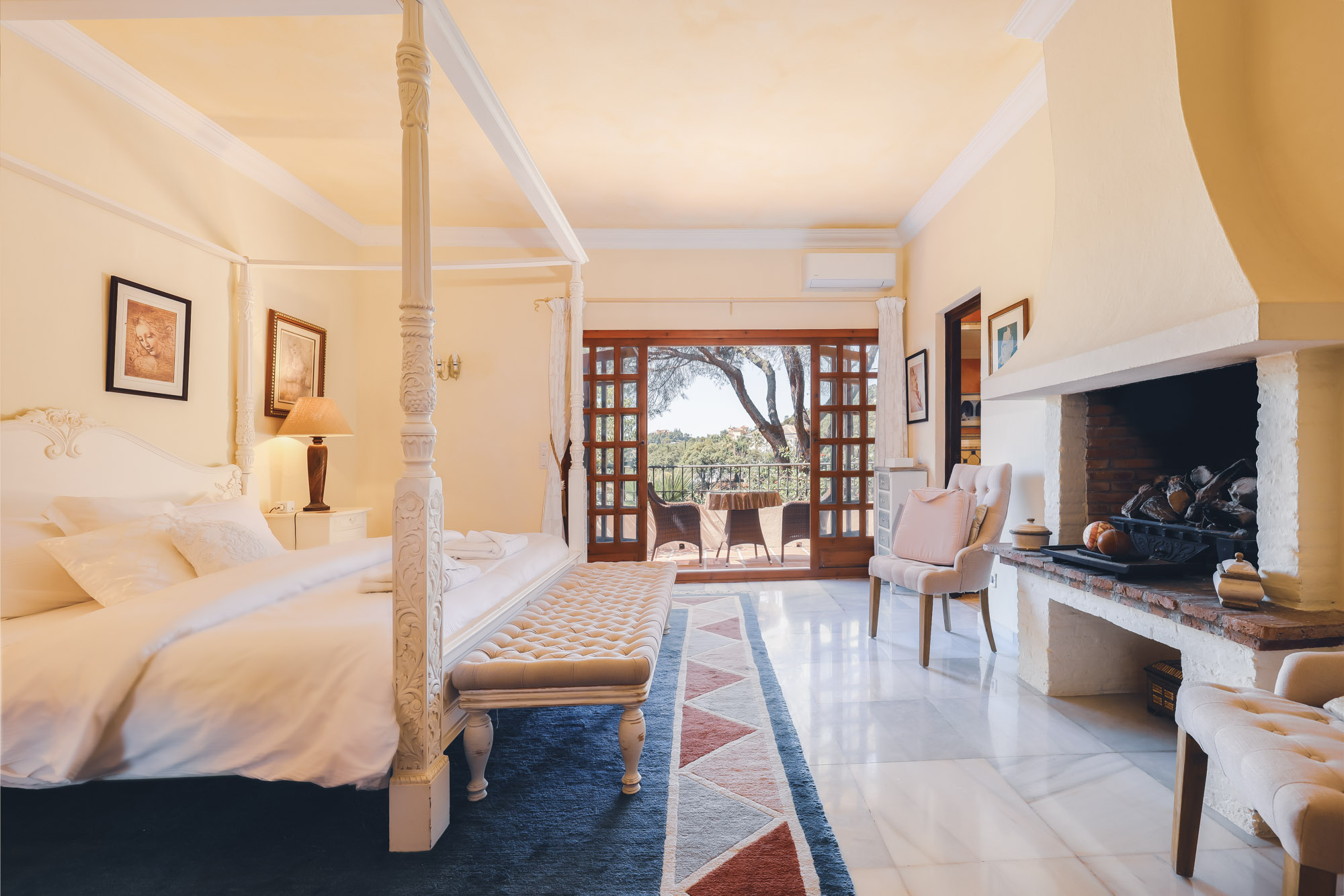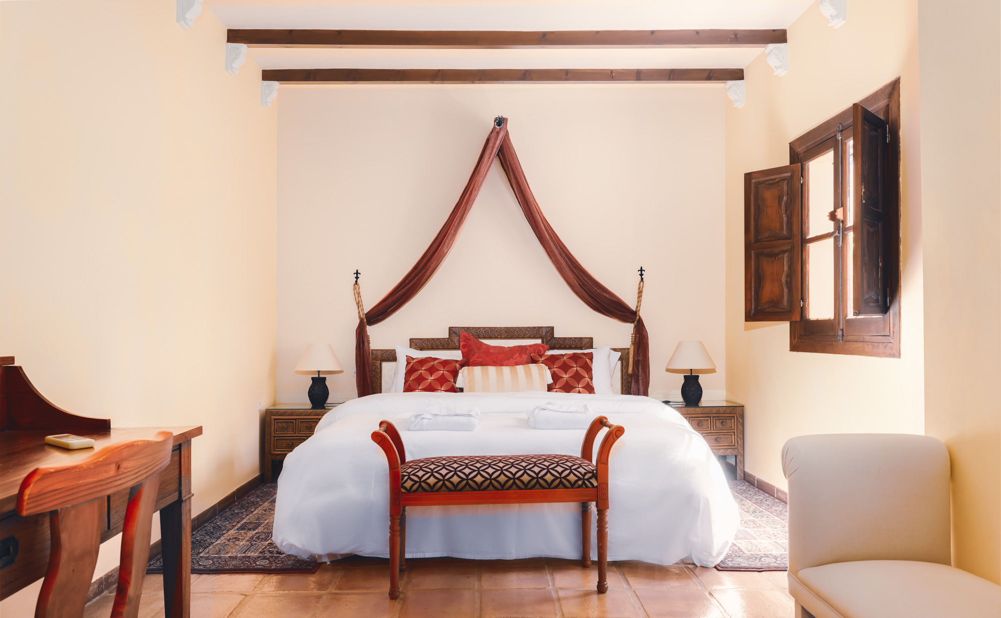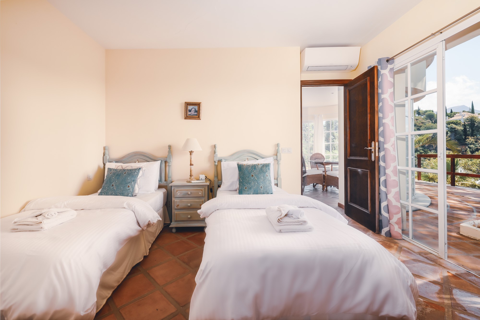 Off the courtyard you will find three of the 9 bedrooms; a large master bedroom with four poster bed and private terrace, a guest twin room, and the courtyard room which also has space for an extra child.
