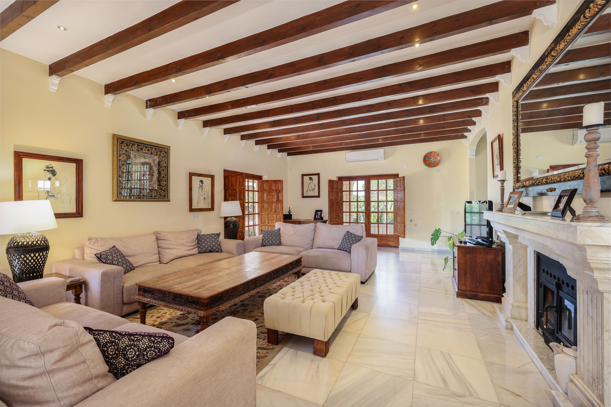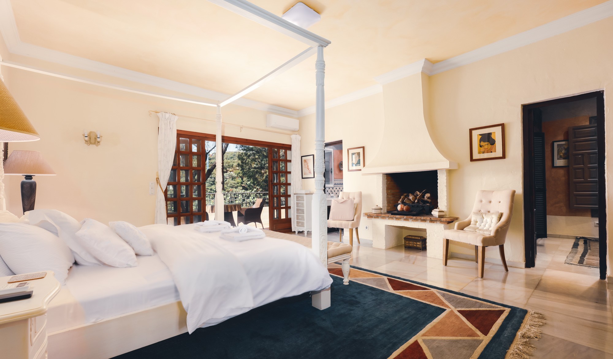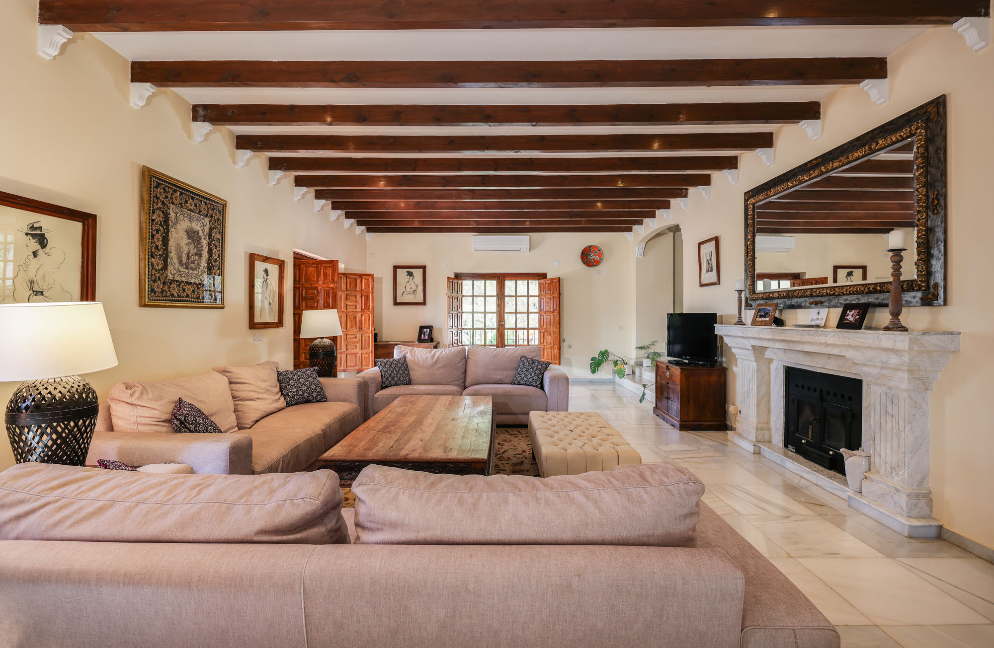 A huge antique Ronda door gives a hint at what lays inside, revealing a spacious and comfortable living area with an over-sized fireplace, full of Spanish charm.