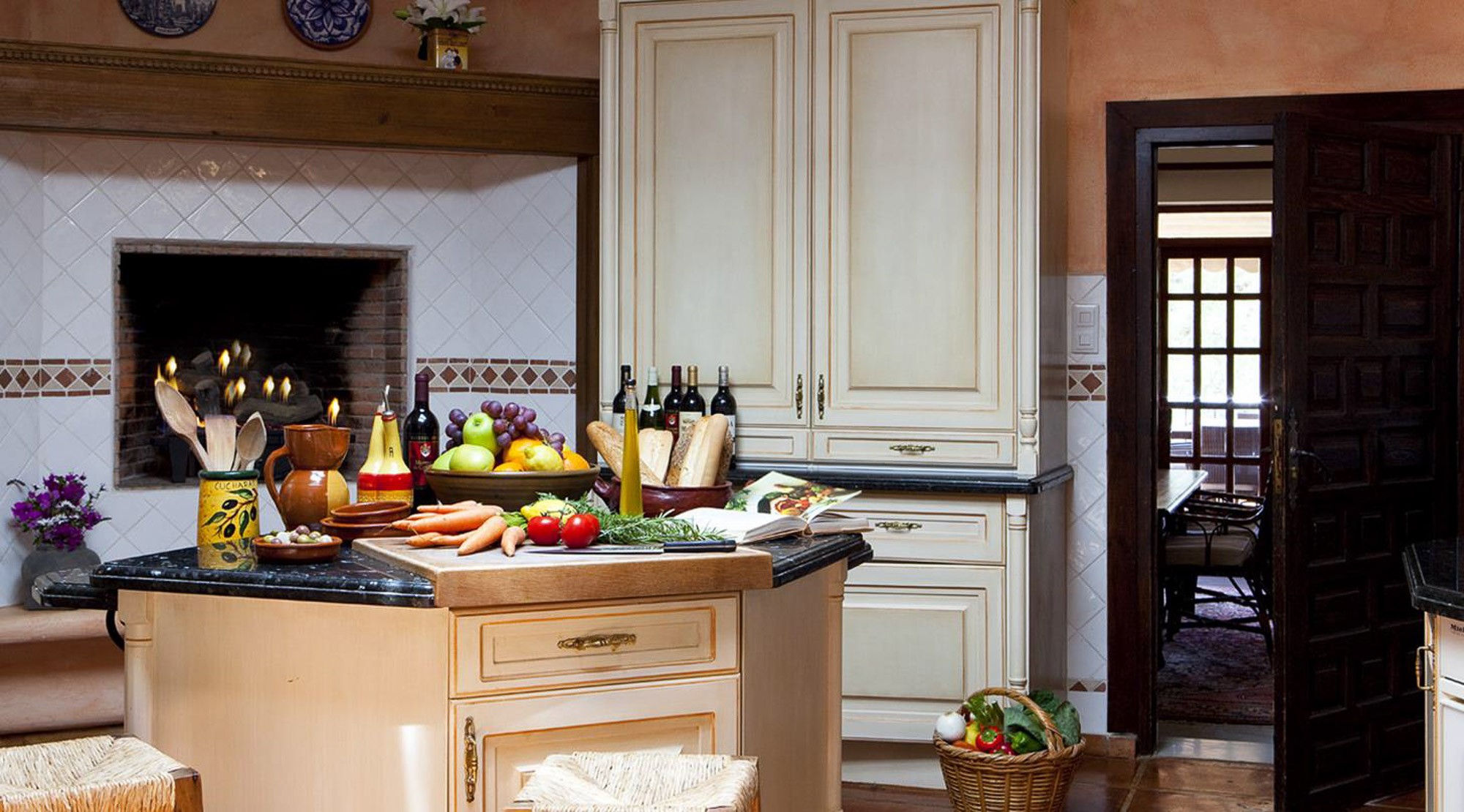 Also by the courtyard you will find the kitchen, a lovely place full of rustic simplicity with a skylight, open fireplace and small bodega. Its welcoming vibe encourages family and friends to converge around the central island for a glass of something while dinner is cooking. Linked to the kitchen is an intimate dining room that seats up to eight persons.