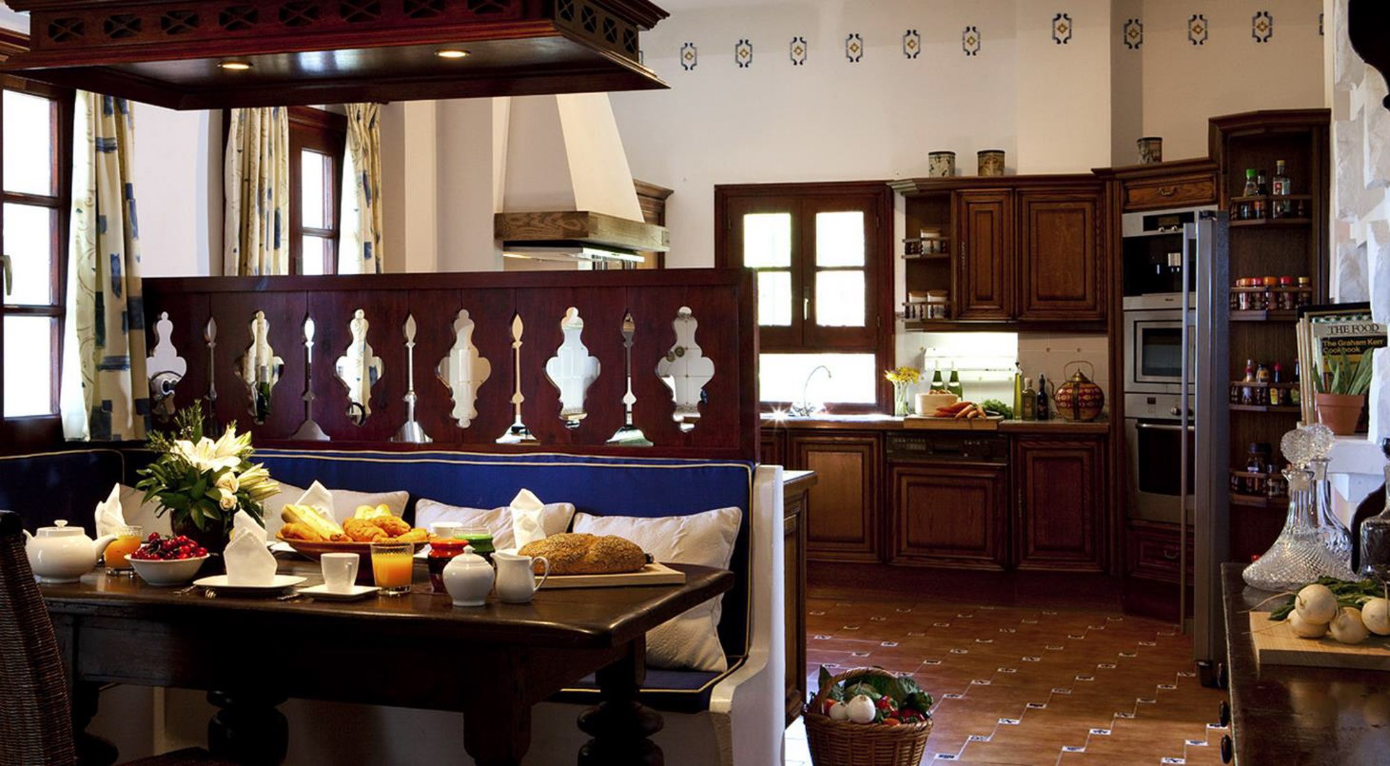 The Andalucian style kitchen is spacious and fully equipped for preparation of delicious meals that can be taken indoors or out, and staff can be called upon to assist with the service of light snacks, laying the BBQ or serving breakfast on the terrace.
