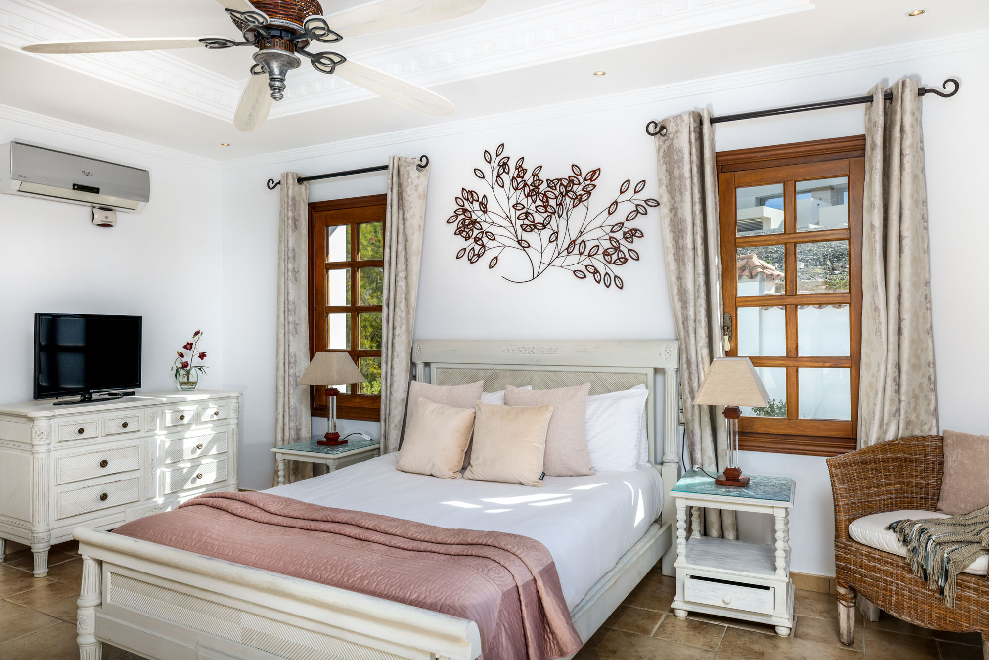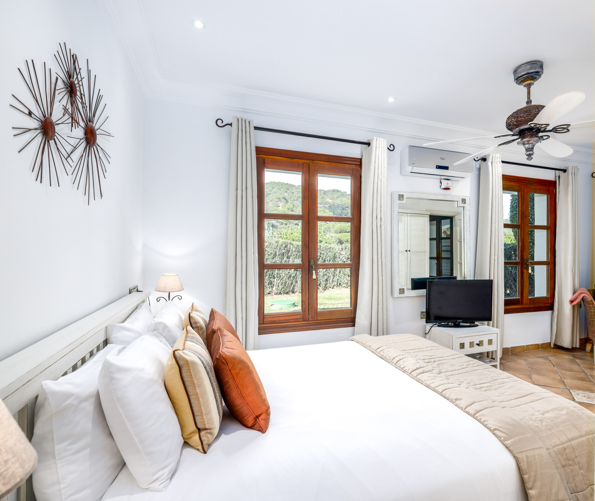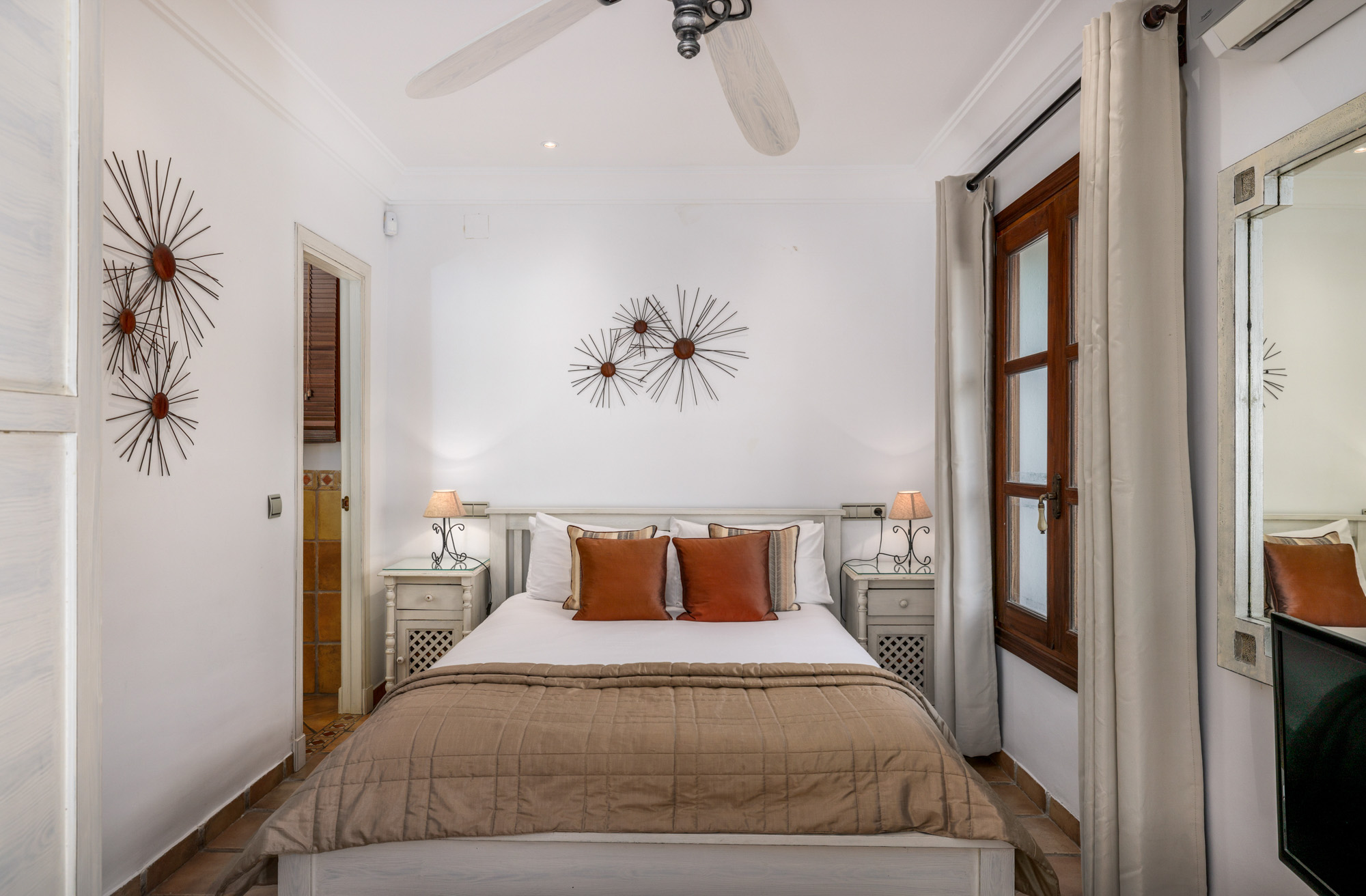 French windows help to create a light and airy living room, decorated with squashy sofas and original artwork. The dining room has seats for 12-14 and evening viewing comes by way of a cool 50″ TV. Hand-cast ceiling fans create cool interior spaces in summer, while central heating is available for a cosy winter Marbella retreat.
