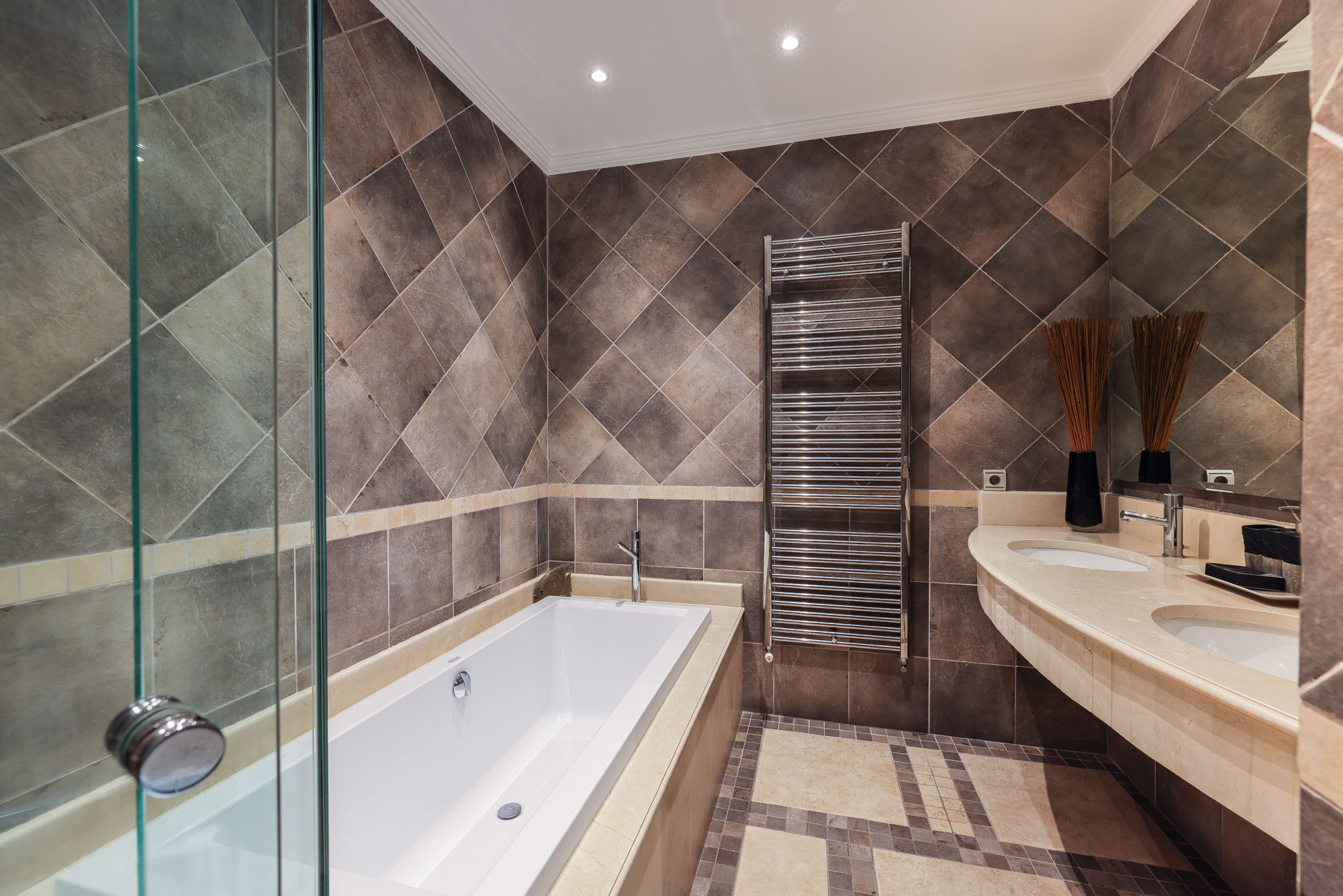 Bedroom 5: Deluxe twin en-suite room, large shower in feature bath, single sink and toilet. French doors lead to a main terrace.