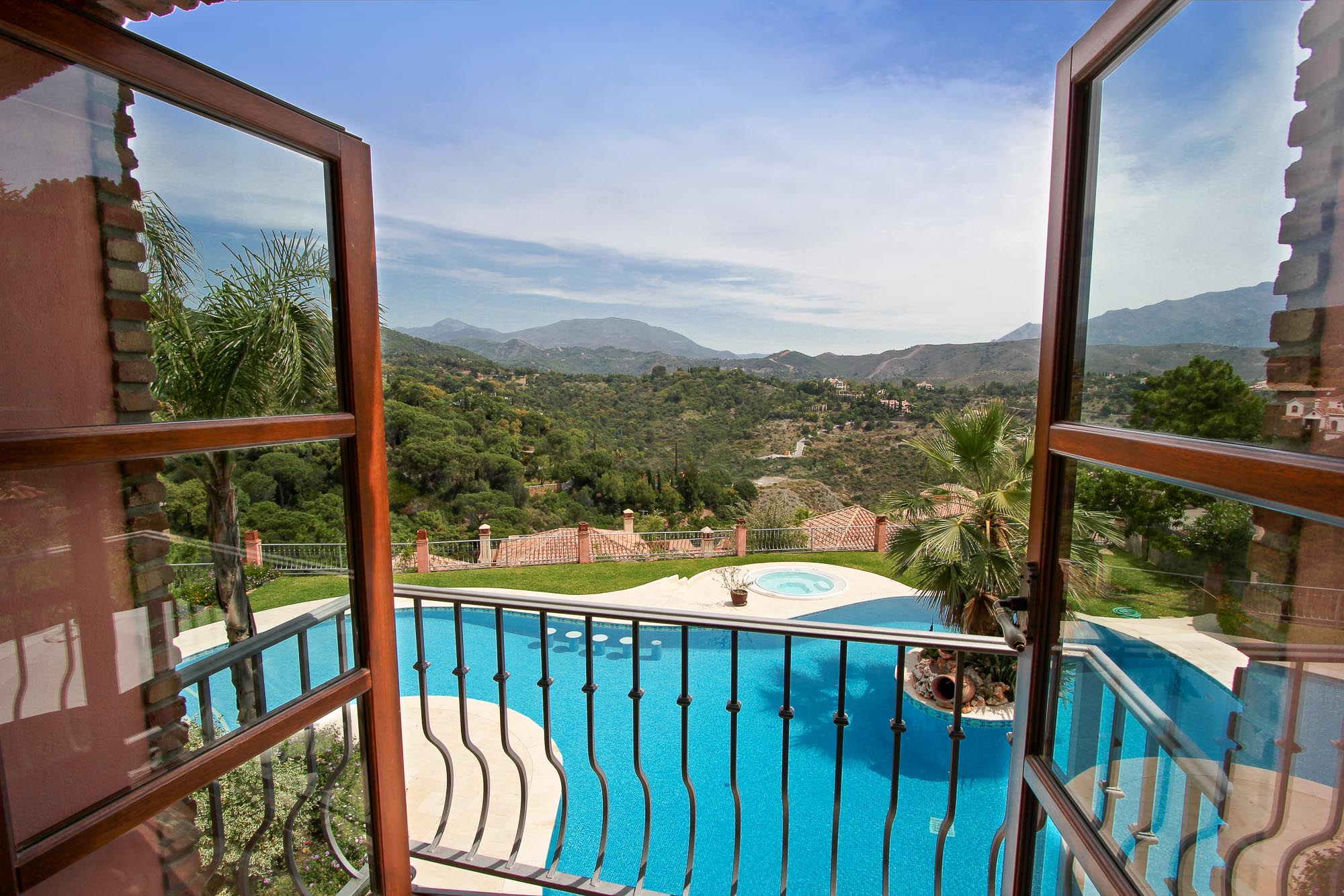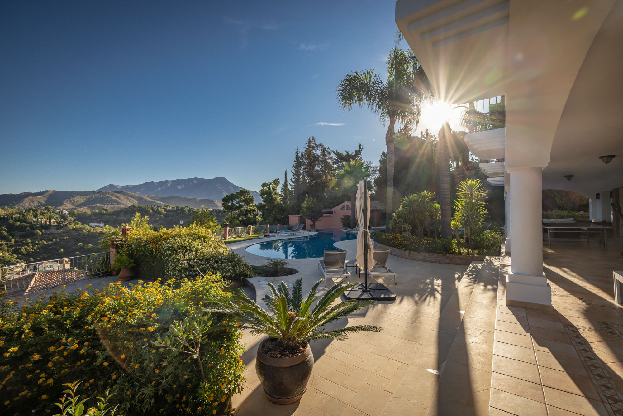 This villa enjoys far-reaching views to the mountains across the valleys, and is just 5km from the nearest shops and restaurants, and 10km to the lovely beach front promenade of San Pedro de Alcantara next to Puerto Banus with its family friendly Boulevard park and beach front paseo. The nearest restaurant, Coto is under 5 minutes’ drive from the villa and has a Michelin star chef owner.