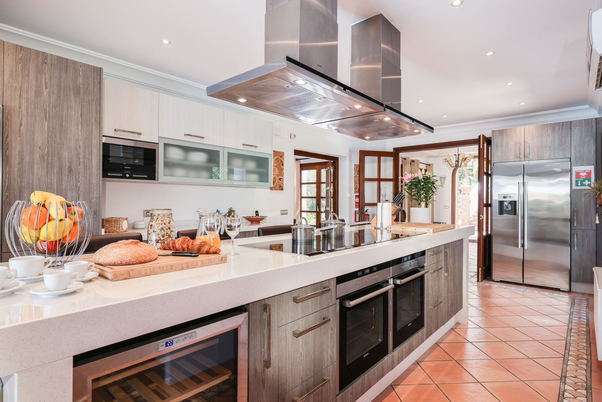 The kitchen is a practical affair. Here you’ll find all conceivable appliances and facilities for cooking up a feast, right down to the juicer. The house staff will even help you serve it to the table and clear away afterwards.