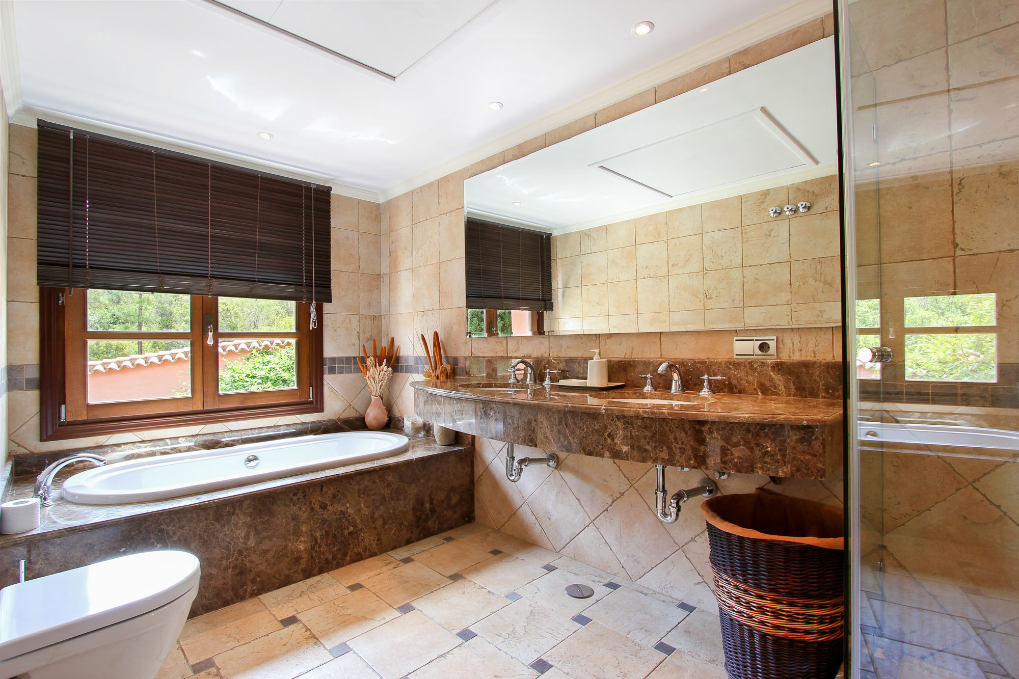 Bedroom 3: Deluxe double en-suite room with queen-sized bed, classical Spanish bathroom up a few stairs, large shower, double-ended bath, twin sinks and separate toilet. Large private patio.